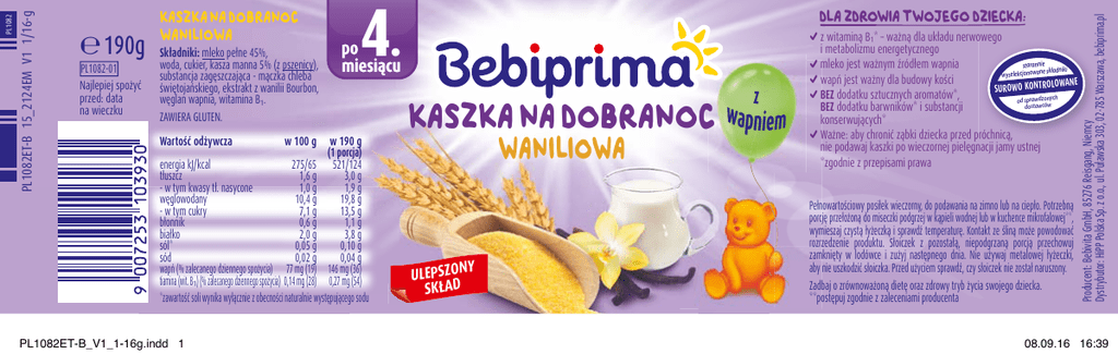 PL1082-01 Najlepiej spożyć przed: data na wieczku Składniki: mleko pełne 45%, woda, cukier, kasza manna 5% (z pszenicy), substancja zagęszczająca - mączka chleba świętojańskiego, ekstrakt z wanilii Bourbon, węglan wapnia, witamina B1. ZAWIERA GLUTEN. Wartość odżywcza po miesiącu w 190 g (1 porcja) energia kJ/kcal 275/65 521/124 tłuszcz 1,6 g 3,0 g - w tym kwasy tł. nasycone 1,0 g 1,9 g węglowodany 10,4 g 19,8 g - w tym cukry 7,1 g 13,5 g błonnik 0,6 g 1,1 g białko 2,0 g 3,8 g sól* 0,05 g 0,10 g sód 0,02 g 0,04 g wapń (% zalecanego dziennego spożycia) 77 mg (19) 146 mg (36) tiamina (wit. B1) (% zalecanego dziennego spożycia) 0,14 mg (28) 0,27 mg (54) *zawartość soli wynika wyłącznie z obecności naturalnie występującego sodu PL1082ET-B_V1_1-16g.indd 1 w 100 g 4. DLA ZDROWIA TWOJEGO DZIECKA: KASZKA NA DOBRANOC WANILIOWA Y ULEPSZON SKŁAD z witaminą B1* – ważną dla układu nerwowego i metabolizmu energetycznego starannie mleko jest ważnym źródłem wapnia składniki wyselekcjonowane wapń jest ważny dla budowy kości LOWANE SUROWO KONTRO BEZ dodatku sztucznych aromatów*, od sprawdzonych dostawców BEZ dodatku barwników* i substancji konserwujących* Ważne: aby chronić ząbki dziecka przed próchnicą, nie podawaj kaszki po wieczornej pielęgnacji jamy ustnej *zgodnie z przepisami prawa Pełnowartościowy posiłek wieczorny, do podawania na zimno lub na ciepło. Potrzebną porcję przełożoną do miseczki podgrzej w kąpieli wodnej lub w kuchence mikrofalowej**, wymieszaj czystą łyżeczką i sprawdź temperaturę. Kontakt ze śliną może powodować rozrzedzenie produktu. Słoiczek z pozostałą, niepodgrzaną porcją przechowuj zamknięty w lodówce i zużyj następnego dnia. Nie używaj metalowej łyżeczki, aby nie uszkodzić słoiczka. Przed użyciem sprawdź, czy słoiczek nie został naruszony. Zadbaj o zrównoważoną dietę oraz zdrowy tryb życia swojego dziecka. **postępuj zgodnie z zaleceniami producenta Producent: Bebivita GmbH, 85276 Reisgang, Niemcy Dystrybutor: HiPP Polska Sp. z o.o., ul. Puławska 303, 02-785 Warszawa, bebiprima.pl PL1082 PL1082ET-B 15_2124EM V1 1/16-g 0 190g KASZKA NA DOBRANOC WANILIOWA 08.09.16 16:39