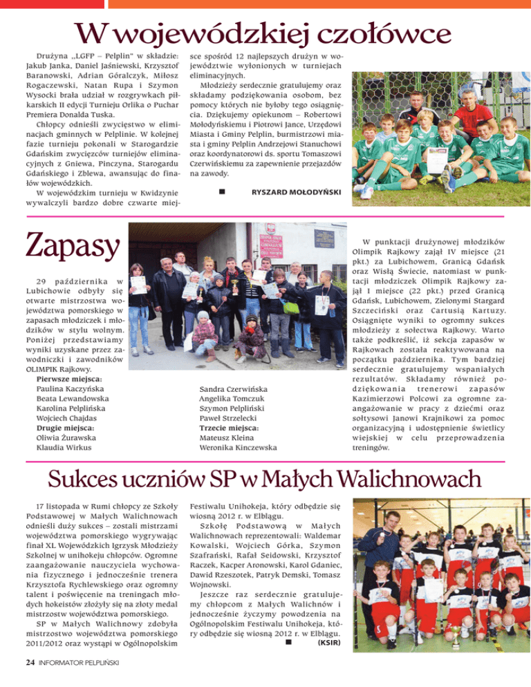 W wojewódzkiej czołówce Drużyna ,,LGFP – Pelplin” w składzie: Jakub Janka, Daniel Jaśniewski, Krzysztof Baranowski, Adrian Góralczyk, Miłosz Rogaczewski, Natan Rupa i Szymon Wysocki brała udział w rozgrywkach piłkarskich II edycji Turnieju Orlika o Puchar Premiera Donalda Tuska. Chłopcy odnieśli zwycięstwo w eliminacjach gminnych w Pelplinie. W kolejnej fazie turnieju pokonali w Starogardzie Gdańskim zwycięzców turniejów eliminacyjnych z Gniewa, Pinczyna, Starogardu Gdańskiego i Zblewa, awansując do finałów wojewódzkich. W wojewódzkim turnieju w Kwidzynie wywalczyli bardzo dobre czwarte miej- sce spośród 12 najlepszych drużyn w województwie wyłonionych w turniejach eliminacyjnych. Młodzieży serdecznie gratulujemy oraz składamy podziękowania osobom, bez pomocy których nie byłoby tego osiągnięcia. Dziękujemy opiekunom – Robertowi Mołodyńskiemu i Piotrowi Jance, Urzędowi Miasta i Gminy Pelplin, burmistrzowi miasta i gminy Pelplin Andrzejowi Stanuchowi oraz koordynatorowi ds. sportu Tomaszowi Czerwińskiemu za zapewnienie przejazdów na zawody. rySzard MołodyńSki Zapasy 29 października w Lubichowie odbyły się otwarte mistrzostwa województwa pomorskiego w zapasach młodziczek i młodzików w stylu wolnym. Poniżej przedstawiamy wyniki uzyskane przez zawodniczki i zawodników OLIMPIK Rajkowy. Pierwsze miejsca: Paulina Kaczyńska Beata Lewandowska Karolina Pelplińska Wojciech Chajdas Drugie miejsca: Oliwia Żurawska Klaudia Wirkus Sandra Czerwińska Angelika Tomczuk Szymon Pelpliński Paweł Strzelecki Trzecie miejsca: Mateusz Kleina Weronika Kinczewska W punktacji drużynowej młodzików Olimpik Rajkowy zajął IV miejsce (21 pkt.) za Lubichowem, Granicą Gdańsk oraz Wisłą Świecie, natomiast w punktacji młodziczek Olimpik Rajkowy zajął I miejsce (22 pkt.) przed Granicą Gdańsk, Lubichowem, Zielonymi Stargard Szczeciński oraz Cartusią Kartuzy. Osiągnięte wyniki to ogromny sukces młodzieży z sołectwa Rajkowy. Warto także podkreślić, iż sekcja zapasów w Rajkowach została reaktywowana na początku października. Tym bardziej serdecznie gratulujemy wspaniałych rezultatów. Składamy również pod zięk owan ia t renerow i zapasów Kazimierzowi Polcowi za ogromne zaangażowanie w pracy z dziećmi oraz sołtysowi Janowi Krajnikowi za pomoc organizacyjną i udostępnienie świetlicy wiejskiej w celu przeprowadzenia treningów. Sukces uczniów SP w Małych Walichnowach 17 listopada w Rumi chłopcy ze Szkoły Podstawowej w Małych Walichnowach odnieśli duży sukces – zostali mistrzami województwa pomorskiego wygrywając finał XL Wojewódzkich Igrzysk Młodzieży Szkolnej w unihokeju chłopców. Ogromne zaangażowanie nauczyciela wychowania fizycznego i jednocześnie trenera Krzysztofa Rychlewskiego oraz ogromny talent i poświęcenie na treningach młodych hokeistów złożyły się na złoty medal mistrzostw województwa pomorskiego. SP w Małych Walichnowy zdobyła mistrzostwo województwa pomorskiego 2011/2012 oraz wystąpi w Ogólnopolskim 24 INFORMATOR PELPLIŃSKI Festiwalu Unihokeja, który odbędzie się wiosną 2012 r. w Elblągu. Szkołę Podstawową w Mał ych Walichnowach reprezentowali: Waldemar Kowalski, Wojciech Górka, Szymon Szafrański, Rafał Seidowski, Krzysztof Raczek, Kacper Aronowski, Karol Gdaniec, Dawid Rzeszotek, Patryk Demski, Tomasz Wojnowski. Jeszcze raz serdecznie gratulujemy chłopcom z Małych Walichnów i jednocześnie życzymy powodzenia na Ogólnopolskim Festiwalu Unihokeja, który odbędzie się wiosną 2012 r. w Elblągu. (kSir)
