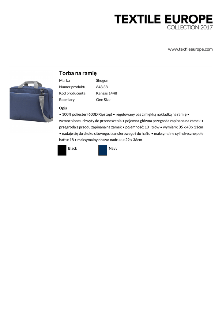 Torba na ramię Marka Shugon Numer produktu 648.38 Kod producenta Kansas 1448 Rozmiary One Size Opis • 100% poliester (600D Ripstop) • regulowany pas z miękką nakładką na ramię • wzmocnione uchwyty do przenoszenia • pojemna główna przegroda zapinana na zamek • przegroda z przodu zapinana na zamek • pojemność: 13 litrów • wymiary: 35 x 43 x 11cm • nadaje się do druku sitowego, transferowego i do haftu • maksymalne cylindryczne pole haftu: 18 • maksymalny obszar nadruku: 22 x 36cm Black Navy