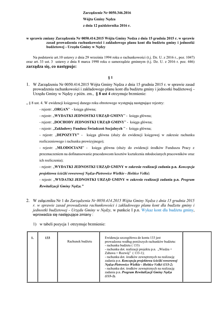 Zarządzenie Nr 0050.346.2016 Wójta Gminy Nędza z dnia 12 października 2016 r. w sprawie zmiany Zarządzenia Nr 0050.414.2015 Wójta Gminy Nedza z dnia 15 grudnia 2015 r. w sprawie zasad prowadzenia rachunkowości i zakładowego planu kont dla budżetu gminy i jednostki budżetowej - Urzędu Gminy w Nędzy Na podstawie art.10 ustawy z dnia 29 września 1994 roku o rachunkowości (t.j. Dz. U. z 2016 r., poz. 1047) oraz art. 33 ust. 3 ustawy z dnia 8 marca 1990 roku o samorządzie gminnym (t.j. Dz. U. z 2016 r. poz. 446) zarządza się, co następuje: §1 1. W Zarządzeniu Nr 0050.414.2015 Wójta Gminy Nędza z dnia 15 grudnia 2015 r. w sprawie zasad prowadzenia rachunkowości i zakładowego planu kont dla budżetu gminy i jednostki budżetowej Urzędu Gminy w Nędzy z późn. zm., § 8 ust 4 otrzymuje brzmienie: „ § 8 ust. 4. W ewidencji księgowej danego roku obrotowego występują następujące rejestry: - rejestr: „ORGAN” - księga główna; - rejestr: „WYDATKI JEDNOSTKI URZĄD GMINY” - księga główna; - rejestr: „DOCHODY JEDNOSTKI URZĄD GMINY” - księga główna; - rejestr: „Zakładowy Fundusz Świadczeń Socjalnych ” - księga główna; - rejestr: „DEPOZYTY” - księga główna (służy do ewidencji księgowej w zakresie rachunku rozliczeniowego i rachunku prowizyjnego); - rejestr: „MŁODOCIANI” - księga główna (służy do ewidencji środków Funduszu Pracy z przeznaczeniem na dofinansowanie pracodawcom kosztów kształcenia młodocianych pracowników oraz ich rozliczenia); - rejestr: „WYDATKI JEDNOSTKI URZĄD GMINY w zakresie realizacji zadania p.n. Koncepcja projektowa ścieżki rowerowej Nędza-Pietrowice Wielkie - Hoštice Velké; - rejestr: „WYDATKI JEDNOSTKI URZĄD GMINY w zakresie realizacji zadania p.n. Program Rewitalizacji Gminy Nędza.” 2. W załączniku Nr 1 do Zarządzenia Nr 0050.414.2015 Wójta Gminy Nędza z dnia 15 grudnia 2015 r. w sprawie zasad prowadzenia rachunkowości i zakładowego planu kont dla budżetu gminy i jednostki budżetowej - Urzędu Gminy w Nędzy, w punkcie I p.n. Wykaz kont dla budżetu gminy, wprowadza się następujące zmiany : 1) w tabeli pozycja 1 otrzymuje brzmienie: 1. 133 Rachunek budżetu Ewidencja szczegółowa do konta 133 jest prowadzona według poniższych rachunków budżetu: - rachunku budżetu ( 133) - rachunku dot. realizacji projektu p.n. „Wiedza + Zabawa = Rozwój” ( 133-1); - rachunku dot. środków zewnętrznych na realizację zadania p.n. Koncepcja projektowa ścieżki rowerowej Nędza-Pietrowice Wielkie - Hoštice Velké (133-2; - rachunku dot. środków zewnętrznych na realizację zadania p.n. Program Rewitalizacji Gminy Nędza (133-3). 2) w tabeli pozycja 5 otrzymuje brzmienie: 5. 222 Rozliczenie dochodów budżetowych Ewidencja prowadzona w sposób umożliwiający ustalenie stanu rozliczeń z poszczególnymi jednostkami budżetowymi z tytułu zrealizowanych przez nie dochodów budżetowych: 222- 1 Urząd Gminy 222-1-1 Urząd Gminy: podatki (realizowane przez komórkę ds. księgowości podatkowej) 222-1-2 Urząd Gminy: dochody budżetowe 222-1-3 Urząd Gminy: inne 222-1-4 Urząd Gminy: dochody z tytułu opłaty za gospodarowanie odpadami komunalnymi 222-1-5 Urząd Gminy: realizacja zadania p.n. Koncepcja projektowa ścieżki rowerowej Nędza-Pietrowice Wielkie - Hoštice Velké (inne niż dofinansowanie zadania, w tym: odsetki bankowe) 222-1-6 Urząd Gminy: realizacja zadania p.n. Program Rewitalizacji Gminy Nędza (inne niż dofinansowanie zadania, w tym: odsetki bankowe) 222-2 Zespół Szkolno – Gimnazjalny w Nędzy 222-3 Zespół Szkolno – Przedszkolny w Górkach Śl. 222-4 Ze spół Szkolno – Przedszkolny w Babicach 222-5 Przedszkole w Nędzy 222-6 Zespół Szkolno – Przedszkolny w Zawadzie Ks. 222-7 Gminny Ośrodek Pomocy Społecznej w Nędzy 3) w tabeli pozycja 6 otrzymuje brzmienie: 6. 223 Rozliczenie wydatków budżetowych Ewidencja prowadzona w sposób umożliwiający ustalenie stanu rozliczeń z poszczególnymi jednostkami budżetowymi z tytułu przekazanych na ich rachunki środków pieniężnych przeznaczonych na pokrycie realizowanych przez nie wydatków budżetowych: 223-1-1 Urząd Gminy – wydatki jednostki 223-1-2 Urząd Gminy: realizacja zadania p.n. Koncepcja projektowa ścieżki rowerowej Nędza-Pietrowice Wielkie - Hoštice Velké 223-1-3 Urząd Gminy: realizacja zadania p.n. Program Rewitalizacji Gminy Nędza 223-2 Zespół Szkolno – Gimnazjalny w Nędzy 223-3 Zespół Szkolno – Przedszkolny w Górkach Śl. 223-4 Zespół Szkolno – Przedszkolny w Babicach 223-5 Przedszkole w Nędzy 223-6 Zespół Szkolno – Przedszkolny w Zawadzie Ks. 223.7 Gminny Ośrodek Pomocy Społecznej w Nędzy §2 Zobowiązuję Skarbnika Gminy oraz pracowników Referatu Finansowego do zapoznania się z zarządzeniem oraz jego stosowanie. § 3 Zarządzenie wchodzi w życie z dniem podjęcia.