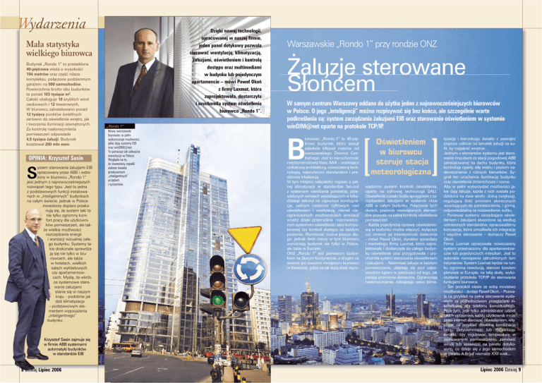 Dzi´ki nowej technologii, opracowanej w naszej firmie, jeden panel dotykowy pozwala sterowaç wentylacjà, klimatyzacjà, ˝aluzjami, oÊwietleniem i kontrolà dost´pu oraz multimediami w budynku lub pojedynczym apartamencie – mówi Pawe∏ Okoƒ z firmy Luxmat, która zaprojektowa∏a, dostarczy∏a i uruchomi∏a system oÊwietlenia biurowca „Rondo 1”. Ma∏a statystyka wielkiego biurowca Budynek „Rondo 1” to przeszklona 40-piętrowa wieża o wysokości 194 metrów oraz część niższa kompleksu, połączone podziemnym garażem na 500 samochodów. Powierzchnia brutto obu budynków to ponad 103 tysiące m2. Całość obsługuje 18 szybkich wind osobowych i 12 towarowych, W biurowcu zainstalowano ponad 12 tysięcy punktów świetlnych zarówno do oświetlenia wnętrz, jak i tworzenia iluminacji zewnętrznych. Za kontrolę nasłonecznienia pomieszczeń odpowiada 4,5 tysiąca żaluzji. Budynek kosztował 200 mln euro. OPINIA: Krzysztof Sasin ystem sterowania ˝aluzjami EIB opracowany przez ABB i wdro˝ony w biurowcu „Rondo 1“ jest jednym z najnowoczeÊniejszych rozwiàzaƒ tego typu. Jest to jedna z podstawowych funkcji instalowanych w „inteligentnych” budynkach na ca∏ym Êwiecie, jednak w Polsce inwestorzy dopiero przekonujà si´, ˝e system taki to nie tylko ogromny komfort pracy dla u˝ytkowników pomieszczeƒ, ale tak˝e wielkie mo˝liwoÊci oszcz´dzania energii i aran˝acji wizualnej ca∏ego budynku. Systemy takie doskonale sprawdzajà si´ nie tylko w biurowcach, ale tak˝e w hotelach, wielkich salach wyk∏adowych czy apartamentowcach. MyÊl´, ˝e wkrótce systemowe sterowanie ˝aluzjami stanie si´ w naszym kraju – podobnie jak dziÊ klimatyzacja – podstawowym elementem wyposa˝enia „inteligentnego” budynku. S Krzysztof Sasin zajmuje się w firmie ABB systemami automatyki budynków w standardzie EIB 8 Dzisiaj Lipiec 2006 „Rondo 1” Nowy warszawski biurowiec w pe∏ni wykorzystuje mo˝liwoÊci, jakie dajà systemy EIB oraz winDIM@net. To pierwsza tak odwa˝na inwestycja w Polsce. Wyglàda na to, ˝e inwestorzy zapalili zielone Êwiat∏o producentom „inteligentnych” urzàdzeƒ i systemów. Warszawskie „Rondo 1” przy rondzie ONZ Żaluzje sterowane Słońcem W samym centrum Warszawy oddano do u˝ytku jeden z najnowoczeÊniejszych biurowców w Polsce. O jego „inteligencji” mo˝na rozpisywaç si´ bez koƒca, ale szczególnie warte podkreÊlenia sà: system zarzàdzania ˝aluzjami EIB oraz sterowanie oÊwietleniem w systemie winDIM@net oparte na protokole TCP/IP. iurowiec „Rondo 1” to 40-piętrowy budynek, który stanął zaledwie kilkaset metrów od warszawskiego Dworca Centralnego. Jest to nieruchomość międzynarodowej klasy AAA – urzekająca unikatową architekturą, nowoczesną technologią, najwyższymi standardami i prestiżową lokalizacją. W tym miejscu należałoby napisać o pełnej klimatyzacji w standardzie fan-coil z systemem nawilżania powietrza, przeszklonych windach wjeżdżających w kilkadziesiąt sekund na najwyższe kondygnacje, pełnym nadzorze cyfrowym nad oświetleniem i wentylacją, niemal nieograniczonych możliwościach aranżacji wnętrz dzięki przemyślnie rozprowadzonym systemom oświetlenia i sieci komputerowej czy kontroli dostępu na każdym poziomie. Wymieniać można jeszcze długo, jednak dwie rzeczy w tym biurowcu wyróżniają budynek nie tylko w Polsce, ale także w Europie. Otóż „Rondo 1” jest pierwszym budynkiem na Starym Kontynencie, a drugim na świecie (po znacznie mniejszym biurowcu w Kanadzie), gdzie na tak dużą skalę wpro- B OÊwietleniem w biurowcu steruje stacja meteorologiczna wadzono system kontroli oświetlenia, oparty na cyfrowej technologii DALI. Oświetlenie zostało ściśle sprzęgnięte z zarządzaniem żaluzjami w systemie i-bus ABB w całym budynku. Połączenie tych dwóch, pozornie niezwiązanych elementów pozwala na pełną kontrolę oświetlenia pomieszczeń. – Każdą pojedynczą oprawę oświetleniową w budynku można włączyć, wyłączyć czy zmienić jej intensywność świecenia – mówi Paweł Okoń, dyrektor sprzedaży i marketingu firmy Luxmat, która zaprojektowała i dostarczyła do całego budynku oświetlenie oraz przygotowała i uruchomiła system sterowania oświetleniem i żaluzjami. – Natomiast żaluzje w każdym pomieszczeniu układają się pod odpowiednim kątem w zależności od tego, jak padają promienie słoneczne. Ograniczają nasłonecznienie, odciążając nieco klima- tyzację i kierunkując światło z zewnątrz poprzez odbicie od lamelek żaluzji na sufit, by rozjaśnić wnętrze. Jednym z elementów systemu jest sterowanie impulsem ze stacji pogodowej ABB zainstalowanej na dachu budynku, która kontroluje opady, siłę wiatru i poziom nasłonecznienia z różnych kierunków. Sygnał ten uruchamia iluminację budynku oraz oświetlenie zmierzchowe i nocne. Aby w pełni wykorzystać możliwości jakie dają żaluzje, każda z nich została podzielona na dwie strefy: dolną (większą), regulującą ilość promieni słonecznych wpadających do pomieszczenia, i górną, odpowiedzialną za rozświetlenie sufitu. – Ponieważ systemy zarządzające oświetleniem i żaluzjami stworzone są według odmiennych standardów, opracowaliśmy koncepcję, która umożliwiła ich integrację i wspólne sterowanie – tłumaczy Paweł Okoń. Firma Luxmat opracowała nowoczesny system przeznaczony dla apartamentowców lub pojedynczych mieszkań. Jest to autorskie rozwiązanie zatrudnionych tam inżynierów. System Luxmat będzie na rynku ogromną rewolucją, stanowi bowiem pierwsze w Europie, na taką skalę, wykorzystanie protokołu TCP/IP do sterowania funkcjami biurowca. – Ten protokół niesie ze sobą mnóstwo możliwości – dodaje Paweł Okoń. – Pozwala na przykład na pełne sterowanie systemem za pośrednictwem przeglądarki internetowej czy telefonu komórkowego. Poza tym, jeśli tylko administrator udzieli takich upra