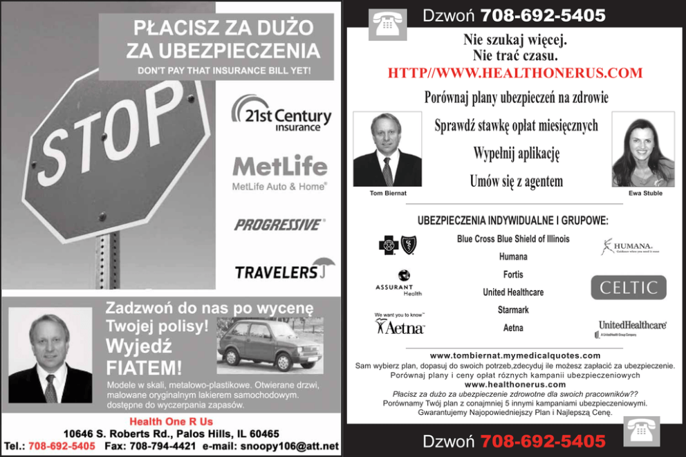 Dzwoń 708-692-5405 Nie szukaj więcej. Nie trać czasu. HTTP//WWW.HEALTHONERUS.COM Porównaj plany ubezpieczeń na zdrowie Sprawdź stawkę opłat miesięcznych Wypełnij aplikację Umów się z agentem Ewa Stuble Tom Biernat UBEZPIECZENIA INDYWIDUALNE I GRUPOWE: Blue Cross Blue Shield of Illinois Humana Fortis United Healthcare Starmark Aetna www.tombiernat.mymedicalquotes.com Sam wybierz plan, dopasuj do swoich potrzeb,zdecyduj ile możesz zapłacić za ubezpieczenie. Porównaj plany i ceny opłat róznych kampanii ubezpieczeniowych www.healthonerus.com Płacisz za dużo za ubezpieczenie zdrowotne dla swoich pracowników?? Porównamy Twój plan z conajmniej 5 innymi kampaniami ubezpieczeniowymi. Gwarantujemy Najopowiedniejszy Plan i Najlepszą Cenę. Dzwoń 708-692-5405