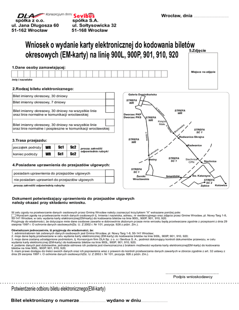 Konsorcjum firm: spółka z o.o. ul. Jana Długosza 60 51-162 Wrocław Wrocław, dnia ...................................................... spółka S.A. ul. Sołtysowicka 32 51-168 Wrocław Wniosek o wydanie karty elektronicznej do kodowania biletów 5.Zdjęcie okresowych (EM-karty) na linię 900L, 900P, 901, 910, 920 1.Dane osoby zamawiającej: Miejsce na zdjęcie imię i nazwisko 2.Rodzaj biletu elektronicznego: Galeria Dominikańska Bilet imienny okresowy, 30 dniowy STREFA WR Bilet imienny okresowy, 7 dniowy Bilet imienny okresowy, 30 dniowy na wszystkie linie oraz linie normalne w komunikacji wrocławskiej Dworzec PKP Dworzec PKS Bilet imienny okresowy, 30 dniowy na wszystkie linie oraz linie normalne i pospieszne w komunikacji wrocławskiej STREFA WR STREFA WR Księże Małe STREFA SC 1 Radwanice-Skrajna STREFA WR 3.Trasa przejazdu: początek podroży WR Sc1 Sc2 koniec podroży WR Sc1 Sc2 Radwanice proszę zakreślić odpowiednie rubryki STREFA SC 1 Iwiny 4.Posiadane uprawnienia do przejazdów ulgowych: posiadam uprawnienia do przejazdów ulgowych nie posiadam uprawnień do przejazdów ulgowych Siechnice CPN Siechnice STREFA SC 1 Św. Katarzyna Żerniki Wrocławskie STREFA SC 2 Kotowice Zębice proszę zakreślić odpowiednią rubrykę Dokument potwierdzający uprawnienia do przejazdów ulgowych należy okazać przy składaniu wniosku. W celu zgody na przetwarzanie danych osobowych przez Gminę Wrocław należy zaznaczyć krzyżykiem “X” wskazane poniżej pole: Wyrażam zgodę na przetwarzanie moich danych osobowych tj. Imienia i nazwiska, adresu, nr ewidencyjnego oraz zdjęcia przez Gmine Wrocław, pl. Nowy Targ 1-8, 50-141 Wrocław, w celu wydania karty elektronicznej(EM-karty) do kodowania biletów na linie 900L, 900P, 901, 910, 920. Przyjmuję do wiadomości, że dotyczące mnie dane osobowe zawarte w dobrowolnie złożonym przeze mnie wniosku będą przetwarzane zgodnie z przepisami z dnia 29 sierpnia 1997 r. O ochronie danych osobowych(Dz. U. Z 2002 r. Nr 101, pozycja. 926 z póżn. Zm.). Oświadczam jednocześnie, iż przyjmuję do wiadomości, że: 1. administratorem tak zebranych danych osobowych jest Gmina Wrocław, pl. Nowy Targ 1-8, 50-141 Wrocław; 2. moje dane będą przetwarzane w celu wydania karty elektronicznej (EM-karty) do kodowania biletów na linie 900L, 900P, 901, 910, 920; 3. moje dane zostaną udostępnione podmiotom, tj. Konsorcjum firm DLA Sp. z o. o.i Sevibus S. A., podmiot dokonujący kontroli dokumentów przewozu, w celu wydania karty elektronicznej (EM-karty) do kodowania biletów na linie 900L, 900P, 901, 910, 920; 4. podanie danych jest dobrowolne, jednakże odmowa ich podania jest równoznaczna z brakiem możliwości wydania karty elektronicznej(EM-karty) do kodowania biletów na linie 900L, 900P, 901, 910, 920; 5. mam prawo dostępu do treści swoich danych oraz ich poprawienia wraz z prawem do kontroli przetwarzania danych zawartych w zbiorze zgodnie z art. 32 ustawy z dnia 29 sierpnia 1997 r. O ochronie danych osobowych(Dz. U. Z 2002 r. Nr 101, pozycja. 926 z póżn. Zm.). ................................................ Podpis wnioskodawcy Potwierdzenie odbioru biletu elektronicznego(EM-karty) Bilet elektroniczny o numerze........................................ wydano w dniu........................................