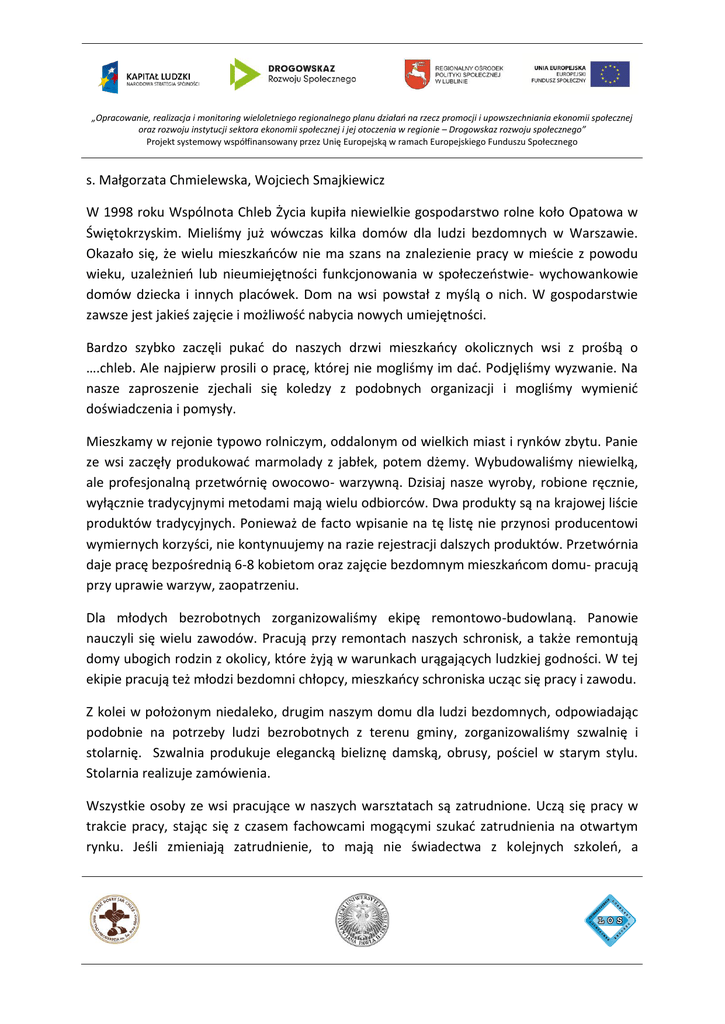 „Opracowanie, realizacja i monitoring wieloletniego regionalnego planu działań na rzecz promocji i upowszechniania ekonomii społecznej oraz rozwoju instytucji sektora ekonomii społecznej i jej otoczenia w regionie – Drogowskaz rozwoju społecznego” Projekt systemowy współfinansowany przez Unię Europejską w ramach Europejskiego Funduszu Społecznego s. Małgorzata Chmielewska, Wojciech Smajkiewicz W 1998 roku Wspólnota Chleb Życia kupiła niewielkie gospodarstwo rolne koło Opatowa w Świętokrzyskim. Mieliśmy już wówczas kilka domów dla ludzi bezdomnych w Warszawie. Okazało się, że wielu mieszkańców nie ma szans na znalezienie pracy w mieście z powodu wieku, uzależnień lub nieumiejętności funkcjonowania w społeczeństwie- wychowankowie domów dziecka i innych placówek. Dom na wsi powstał z myślą o nich. W gospodarstwie zawsze jest jakieś zajęcie i możliwość nabycia nowych umiejętności. Bardzo szybko zaczęli pukać do naszych drzwi mieszkańcy okolicznych wsi z prośbą o ….chleb. Ale najpierw prosili o pracę, której nie mogliśmy im dać. Podjęliśmy wyzwanie. Na nasze zaproszenie zjechali się koledzy z podobnych organizacji i mogliśmy wymienić doświadczenia i pomysły. Mieszkamy w rejonie typowo rolniczym, oddalonym od wielkich miast i rynków zbytu. Panie ze wsi zaczęły produkować marmolady z jabłek, potem dżemy. Wybudowaliśmy niewielką, ale profesjonalną przetwórnię owocowo- warzywną. Dzisiaj nasze wyroby, robione ręcznie, wyłącznie tradycyjnymi metodami mają wielu odbiorców. Dwa produkty są na krajowej liście produktów tradycyjnych. Ponieważ de facto wpisanie na tę listę nie przynosi producentowi wymiernych korzyści, nie kontynuujemy na razie rejestracji dalszych produktów. Przetwórnia daje pracę bezpośrednią 6-8 kobietom oraz zajęcie bezdomnym mieszkańcom domu- pracują przy uprawie warzyw, zaopatrzeniu. Dla młodych bezrobotnych zorganizowaliśmy ekipę remontowo-budowlaną. Panowie nauczyli się wielu zawodów. Pracują przy remontach naszych schronisk, a także remontują domy ubogich rodzin z okolicy, które żyją w warunkach urągających ludzkiej godności. W tej ekipie pracują też młodzi bezdomni chłopcy, mieszkańcy schroniska ucząc się pracy i zawodu. Z kolei w położonym niedaleko, drugim naszym domu dla ludzi bezdomnych, odpowiadając podobnie na potrzeby ludzi bezrobotnych z terenu gminy, zorganizowaliśmy szwalnię i stolarnię. Szwalnia produkuje elegancką bieliznę damską, obrusy, pościel w starym stylu. Stolarnia realizuje zamówienia. Wszystkie osoby ze wsi pracujące w naszych warsztatach są zatrudnione. Uczą się pracy w trakcie pracy, stając się z czasem fachowcami mogącymi szukać zatrudnienia na otwartym rynku. Jeśli zmieniają zatrudnienie, to mają nie świadectwa z kolejnych szkoleń, a „Opracowanie, realizacja i monitoring wieloletniego regionalnego planu działań na rzecz promocji i upowszechniania ekonomii społecznej oraz rozwoju instytucji sektora ekonomii społecznej i jej otoczenia w regionie – Drogowskaz rozwoju społecznego” Projekt systemowy współfinansowany przez Unię Europejską w ramach Europejskiego Funduszu Społecznego świadectwo konkretnego zatrudnienia, co podnosi ich wartość w oczach nowego pracodawcy. Oczywiście ich wydajność jest początkowo dużo niższa niż fachowców. Stąd rozbieżność między kosztami a przychodami ze sprzedaży. Marketingiem zajmują się członkowie Wspólnoty, wolontariusze i jedna zatrudniona osoba. Nie korzystamy z dotacji ani państwowych ani unijnych. Tych pierwszych praktycznie nie ma, drugie są z jednej strony nieosiągalne, bo rozdzielane ……, z drugiej obwarowane takimi restrykcjami, że duża część przyznanych pieniędzy musi być wydana na cele uboczne, a nie na poprawę losu osób zagrożonych marginalizacją: konferencje, materiały reklamowe itp. Pozyskujemy środki od osób prywatnych i instytucji. Współpraca z Urzędem Pracy jest żadna. Ta instytucja nie jest zainteresowana naszą działalnością, zatem nie tracimy już czasu na bezpłodne próby zmiany mentalności Urzędu. Nie prowadzimy działalności gospodarczej, a odpłatną działalność statutową. Dążymy do ideału- pokrycia w 100% kosztów produkcji przychodami ze sprzedaży wyrobów. Obecnie w naszych warsztatach pracę znajduje 22 osoby, a 10 bezdomnych mieszkańców ma możliwość zdobycia umiejętności zawodowych i społecznych. Pracownicy to albo osoby bardzo młode albo ludzie w wieku średnim i 50+. Kilkoro z nich, po kilku latach zostało kierownikami działów. Część to osoby, które zdobyły wykształcenie dzięki innej naszej działalności- funduszowi stypendialnemu, sponsorującemu ponad 500 młodych uczących się w szkole średniej i szkołach wyższych. Niestety nie mamy możliwości zaspokojenia wszystkich potrzeb środowiska. Praca w tym rejonie jest na wagę złota. Oficjalne bezrobocie wynosi 14,7 %. Są to dane zaniżone, ponieważ zarejestrowane mogą być tylko osoby nie posiadające gospodarstwa powyżej 1 ha. W rzeczywistości nie ma możliwości utrzymania się w polskich warunkach z gospodarstwa, w którym na osobę przypada mniej niż 5 ha. W naszym województwie średnia powierzchnia gospodarstwa wynosi 5,49 ha. Jest to wynik trzeci od końca. Mniej ma tylko Małopolska i Podkarpacie, a dla porównania Lubelskie – 7,45. W rzeczywistości 72% w Świętokrzyskim to gospodarstwa w przedziale 1- 5 ha. Wnioski co do rzeczywistej skali bezrobocia nasuwają się same. Konferencja: „Ekonomia społeczna – za czy przeciw?” Katolicki Uniwersytet Lubelski Jana Pawła II, 28 listopada 2012 roku.
