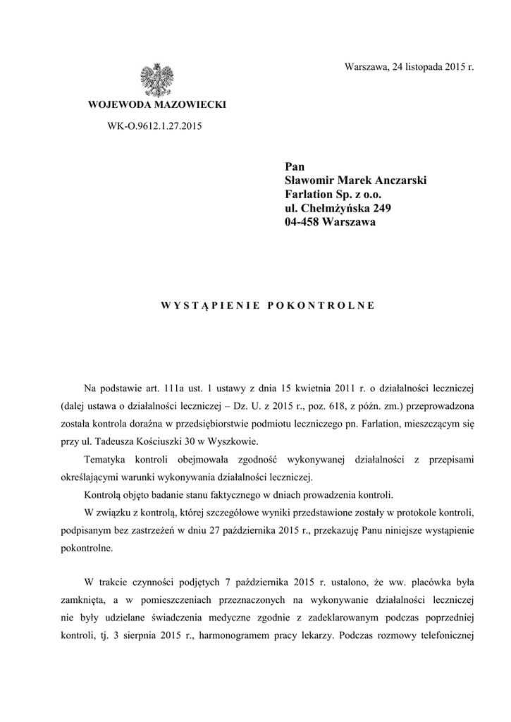 Warszawa, 24 listopada 2015 r. WOJEWODA MAZOWIECKI WK-O.9612.1.27.2015 Pan Sławomir Marek Anczarski Farlation Sp. z o.o. ul. Chełmżyńska 249 04-458 Warszawa WYSTĄPIENIE POKONTROLNE Na podstawie art. 111a ust. 1 ustawy z dnia 15 kwietnia 2011 r. o działalności leczniczej (dalej ustawa o działalności leczniczej – Dz. U. z 2015 r., poz. 618, z późn. zm.) przeprowadzona została kontrola doraźna w przedsiębiorstwie podmiotu leczniczego pn. Farlation, mieszczącym się przy ul. Tadeusza Kościuszki 30 w Wyszkowie. Tematyka kontroli obejmowała zgodność wykonywanej działalności z przepisami określającymi warunki wykonywania działalności leczniczej. Kontrolą objęto badanie stanu faktycznego w dniach prowadzenia kontroli. W związku z kontrolą, której szczegółowe wyniki przedstawione zostały w protokole kontroli, podpisanym bez zastrzeżeń w dniu 27 października 2015 r., przekazuję Panu niniejsze wystąpienie pokontrolne. W trakcie czynności podjętych 7 października 2015 r. ustalono, że ww. placówka była zamknięta, a w pomieszczeniach przeznaczonych na wykonywanie działalności leczniczej nie były udzielane świadczenia medyczne zgodnie z zadeklarowanym podczas poprzedniej kontroli, tj. 3 sierpnia 2015 r., harmonogramem pracy lekarzy. Podczas rozmowy telefonicznej przeprowadzonej przez zespół kontrolny z Prezesem Zarządu Sp. z o.o. Farlation (dalej Prezes) ustalono, że czynności kontrolne w ww. placówce będą kontynuowane 12 października 2015 r. Struktura organizacyjna kontrolowanego przedsiębiorstwa była zgodna z danymi zgłoszonymi do rejestru podmiotów wykonujących działalność leczniczą. Podmiot posiadał umowę ubezpieczenia odpowiedzialności cywilnej, zgodnie z obowiązkiem ustalonym w art. 25 ust. 1 pkt 1 i ust. 2 ustawy o działalności leczniczej. W dokumentacji placówki zgromadzono dokumenty potwierdzające prawo wykonywania zawodu zatrudnionej kadry lekarskiej i pielęgniarza. Ustalono, że stan zatrudnienia personelu medycznego nie uległ zmianie od dnia zakończenia ostatniej kontroli, natomiast zmienił się harmonogram przyjęć pacjentów. Placówka pozostawała w gotowości do udzielania świadczeń medycznych, które – jak wynikało z pisemnych wyjaśnień Prezesa – będą realizowane po uprzednim telefonicznym zgłoszeniu zapotrzebowania na wizytę lekarską. Podmiot dysponował gabinetem diagnostyczno-zabiegowym oraz trzema gabinetami lekarskimi, z których dwa znajdowały się w trakcie adaptacji na pomieszczenia gabinetu fizjoterapeutycznego i EEG. Dokumentacja medyczna przechowywana była zgodnie z normami ustalonymi w rozporządzeniu Ministra Zdrowia z dnia 21 grudnia 2010 r. w sprawie rodzajów i zakresu dokumentacji medycznej oraz sposobu jej przetwarzania (dalej rozporządzenie w sprawie rodzajów i zakresu dokumentacji medycznej – Dz. U. z 2014 r., poz. 177, z późn. zm.). W oparciu o analizę indywidualnej dokumentacji medycznej ustalono, że do dnia zakończenia kontroli świadczenia zdrowotne udzielone zostały 14 pacjentom, a zatem uwzględniając ustalenia poprzedniej kontroli, dotyczące 12 przyjętych pacjentów, stwierdzono, że w okresie od 3 sierpnia 2015 r. do 12 października 2015 r. udokumentowane zostały 2 konsultacje lekarskie. Świadczenia medyczne udzielone zostały przez zatrudnionych lekarzy – 1 sierpnia i 8 września 2015 r. Analizie poddano dokumentację medyczną 14 przyjętych pacjentów. Siedmiu pacjentom nie przepisano żadnych leków – 3 pacjentom, którzy zgłosili się na badania rutynowe, nie zostały wydane żadne zalecenia lekarskie, a 4 pozostali pacjenci otrzymali: skierowania do gastrologa, wykonania badania kontrolnego RTG klatki piersiowej oraz morfologii, zalecenia diety niskocholesterolowej i obserwacji ciśnienia tętniczego krwi. Trzem z pozostałych siedmiu pacjentów wypisane zostały następujące leki: Mesoprazol (1 pacjentowi), Mesopral i Omeprazol (1 pacjentowi) i Nasorin (1 pacjentowi), a kolejnemu pacjentowi przedłużono stosowanie leków Euthyrox i Salbutamol. W dokumentacji medycznej ww. pacjentów zawarte zostały zapisy o wydaniu recepty. W dokumentacji ostatnich trzech pacjentów zamieszczone zostały adnotacje o ich zgłoszeniu się w trakcie prowadzonych kuracji: jeden pacjent przyjmował leki na nadciśnienie Bisocard oraz Atoris (brak informacji o przedłużeniu lub zaleceniu ww. leków), drugi pacjent przyjmował na stałe Citabax i w tym przypadku zalecono wyłącznie 2 kontynuację leczenia w poradni zdrowia psychicznego, w przypadku trzeciego pacjenta, przyjmującego na stałe Zyrtec i Seretide, odnotowano wyłącznie zalecenie stosowania diety aspirynowej (niskosalicylanowej). Na podstawie analizy indywidualnej oraz zbiorczej dokumentacji medycznej stwierdzono, że w placówce nie były zastosowane u pacjentów produkty lecznicze, które mogą być doraźnie dostarczane w związku z udzielanym świadczeniem zdrowotnym, zgodnie z rozporządzeniem Ministra Zdrowia z dnia 12 stycznia 2011 r. w sprawie wykazu produktów leczniczych, które mogą być doraźnie dostarczane w związku z udzielanym świadczeniem zdrowotnym, oraz wykazu produktów leczniczych wchodzących w skład zestawów przeciwwstrząsowych, ratujących życie (Dz. U. z 2011 r., Nr 18, poz. 94). W kontrolowanej placówce nie wykonywano również szczepień ochronnych. W gabinecie przeznaczonym na pracownię EEG, w przeszklonej szafce, znajdowały się pojedyncze opakowania środków opatrunkowych – bandaże, kompresy, waciki, plastry oraz woda utleniona i spirytus salicylowy, a także po jednym opakowaniu leków – Calcium i Panadol. Zgodnie z wyjaśnieniami Prezesa sprawami zakupu produktów leczniczych i środków opatrunkowych zajmował się kierownik przedsiębiorstwa podmiotu leczniczego Farlation, który w trakcie czynności kontrolnych w podmiocie był nieobecny. W wyniku kontroli indywidualnej dokumentacji medycznej 14 pacjentów stwierdzono we wszystkich przypad
