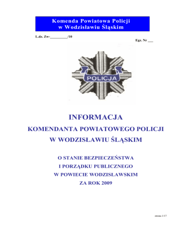 Komenda Powiatowa Policji w Wodzisławiu Śląskim L.dz. Zw-__________/10 Egz. Nr ___ INFORMACJA KOMENDANTA POWIATOWEGO POLICJI W WODZISŁAWIU ŚLĄSKIM O STANIE BEZPIECZEŃSTWA I PORZĄDKU PUBLICZNEGO W POWIECIE WODZISŁAWSKIM ZA ROK 2009 strona 1/17 I. Stan zagroŜenia przestępczością kryminalną. Stan porządku i bezpieczeństwa publicznego na terenie działania Komendy Powiatowej Policji w Wodzisławiu Śląskim za 2009 r., przedstawiał się w sposób następujący: Wszczęto ogółem 3377 postępowań przygotowawczych. Nastąpił nieznaczny wzrost dynamiki wszczęć do poziomu 100,8. Z ogólnej liczby 3349 wszczętych postępowań w 2008 r., 2526 stanowiły postępowania w sprawach o przestępstwa kryminalne, nastąpił spadek wszczętych spraw o 6 w stosunku do analogicznego okresu roku poprzedniego, tym samym nastąpił równieŜ spadek wskaźnika dynamiki wszczętych postępowań (w kategorii kryminalne) do poziomu 99,8. 3377 3349 3383 4067 4016 3927 3997 4024 2009 4165 3512 3151 2721 2001 2009 2008 2007 2006 2005 2004 2003 2002 2001 2000 1999 1998 1993 2516 2244 2358 1980 1690 1992 1812 1997 1996 1995 1994 0 4029 3600 2008 4184 2007 5092 2006 4642 2005 4284 2004 2003 4432 2002 4356 4707 5152 2000 3425 1999 3003 1998 2814 1997 1996 2604 1995 2592 2276 1994 2064 1993 1903 1992 1000 2000 3000 4000 Postępowania wszczęte 5000 0 1000 2000 3000 4000 5000 6000 Przestępstwa stwierdzone Odnotowano ogółem 4029 przestępstw stwierdzonych, tj. o 429 więcej niŜ w roku ubiegłym, co ukształtowało wskaźnik dynamiki na poziomie 111,9. Wykrywalność ogólna przestępstw za 2009r. ukształtowała się na poziomie 71,8% i była wyŜsza o 1,7% w porównaniu do analogicznego okresu roku 2008 (przy średniej wojewódzkiej 60,6%). strona 2/17 Dane zobrazowane na powyŜszych wykresach w rozbiciu na poszczególne komórki organizacyjne, tut. KPP przedstawia poniŜsza tabela.: Postępowania wszczęte Jednostka Przestępstwa stwierdzone 2008 2009 2008 2009 KPP Wodzisław 1705 1745 1808 2251 PG 158 129 KP Gorzyce 390 374 564 520 KP Pszów 288 249 300 310 KP Radlin 386 426 465 498 KP Rydułtowy 393 431 463 450 3349 3377 3600 4029 Razem Powiat * * łącznie z Prokuraturą W kategorii przestępstw gospodarczych stwierdzono 698 przestępstw, tj. o 337 więcej niŜ w roku 2008. Wykrywalność w tej kategorii wyniosła 98,4% i była wyŜsza o 5% niŜ w roku 2008 (przy średniej wojewódzkiej 96,0%). Oceniając stopień zagroŜenia przestępczością kryminalną naleŜy wskazać, Ŝe w kategorii tej wszczęto ogółem 2541 postępowań, o 15 więcej niŜ w 2008 roku, co dało dynamikę 100,6 natomiast stwierdzono 2681 przestępstw, tj., o 30 przestępstw więcej. Wskaźnik dynamiki ukształtował się na poziomie 101,1. Wskaźnik wykrywalności przestępstw w tej kategorii wyniósł 58,2% tym samym był niŜszy o 2,6% w stosunku do roku poprzedniego (przy średniej wojewódzkiej 48,5%). ZagroŜenie przestępczością kryminalną w rozbiciu na poszczególne komórki organizacyjne tut. Komendy Powiatowej Policji przedstawia tabela: Postępowania wszczęte Przestępstwa stwierdzone Jednostka 2008 2009 2008 2009 KPP Wodzisław 1218 1226 1278 1365 KP Gorzyce 345 329 373 339 KP Pszów 253 219 249 265 KP Radlin 350 376 372 353 KP Rydułtowy 353 385 379 359 2526 2541 2651 2681 Razem Powiat * * łącznie z Prokuraturą strona 3/17 W grupie przestępstw przeciwko mieniu w 2009 r., stwierdzono 1856 przestępstw, tj. o 205 więcej niŜ w analogicznym okresie roku poprzedniego. Ukształtowało to dynamikę na poziomie 112,4. Wykrywalność w tej grupie przestępczości wyniosła 43,2% i była wyŜsza o 2,1% w stosunku do roku ubiegłego (przy średniej wojewódzkiej 38,6%). ZagroŜenie przestępczością skierowaną na mienie w rozbiciu na poszczególne komórki organizacyjne tut. Komendy Powiatowej Policji. Postępowania wszczęte Jednostka Przestępstwa stwierdzone 2008 2009 2008 2009 KPP Wodzisław 732 747 854 1130 SPG 106 75 KP Gorzyce 205 198 222 182 KP Pszów 142 104 125 98 KP Radlin 213 214 217 204 KP Rydułtowy 242 260 233 242 1641 1599 1651 1856 Razem Powiat * * łącznie z Prokuraturą strona 4/17 W grupie przestępstw z kategorii kradzieŜy cudzej rzeczy w 2009 r., stwierdzono 608 przestępstw, tj. o 21 więcej niŜ w analogicznym okresie roku poprzedniego, ukształtowało to dynamikę na poziomie 103,6,3. Wykrywalność w tej grupie przestępczości wyniosła 25,2%, tym samym była niŜsza o 2,1% w stosunku do roku ubiegłego (przy średniej wojewódzkiej 21,1%). K ra dzie Ŝ c udze go mi eni a/ rze czy w lata c h 1 99 0 - 2 00 9 1200 1025 995 1000 929 945 892 884 839 800 696 608 587 600 511 499 406 404 400 352 328 398 341 321 229 200 0 1990 1991 1992 1993 1994 KP P 1995 1996 KP G orzyce 1997 1998 1999 K P R ydułtow y 2000 2 00 1 2002 KP Pszów 2003 2004 KP Rad lin 2005 2006 2007 2008 2009 R azem P owiat KradzieŜ cudzej rzeczy. Dane w rozbiciu na poszczególne komórki organizacyjne tut. Komendy Powiatowej Policji. Postępowania wszczęte Jednostka Przestępstwa stwierdzone 2008 2009 2008 2009 KPP Wodzisław 305 321 278 314 KP Gorzyce 90 77 89 76 KP Pszów 52 50 47 52 KP Radlin 82 78 80 72 KP Rydułtowy 89 100 93 94 618 626 587 608 Razem Powiat * * łącznie z Prokuraturą strona 5/17 W grupie przestępstw z kategorii kradzieŜy z włamaniem w 2009 r., stwierdzono 432 przestępstwa o 25 więcej niŜ w analogicznym okresie roku poprzedniego, ukształtowało to dynamikę na poziomie 108,8. Wykrywalność w tej grupie przestępczości wyniosła 18,8%, tym samym była niŜsza o 10,5% w stosunku do roku ubiegłego (przy średniej wojewódzkiej 22,2%). KradzieŜe z włamaniem w latach 1990-2009 1400 1207 1211 1200 1109 1000 923 916 840 765 800 668 816 749 667 562 600 823 803 566 658 544 407 397 432 400 200 0 1990 1991 1992 1993 1994 1995 KPP Wodzisław KP Pszów 1996 1997 1998 1999 2000 KP Gorzyce KP Radlin 2001 2002 2003 2004 2005 2006 2007 2008 2009 KP Rydułtowy Ogółem KPP KradzieŜ z włamaniem. Da