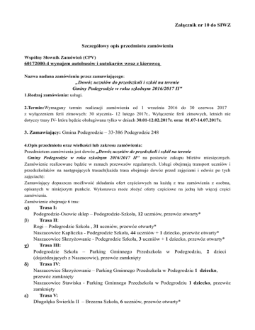 Załącznik nr 10 do SIWZ Szczegółowy opis przedmiotu zamówienia Wspólny Słownik Zamówień (CPV) 60172000-4 wynajem autobusów i autokarów wraz z kierowcą Nazwa nadana zamówieniu przez zamawiającego: „Dowóz uczniów do przedszkoli i szkół na terenie Gminy Podegrodzie w roku szkolnym 2016/2017 II" 1.Rodzaj zamówienia: usługi. 2.Termin:Wymagany termin realizacji zamówienia od 1 września 2016 do 30 czerwca 2017 z wyłączeniem ferii zimowych: 30 stycznia- 12 lutego 2017r.. Wyłączenie ferii zimowych, letnich nie dotyczy trasy IV- która będzie obsługiwana tylko w dniach 30.01-12.02.2017r. oraz 01.07-14.07.2017r. 3. Zamawiający: Gmina Podegrodzie – 33-386 Podegrodzie 248 4.Opis przedmiotu oraz wielkości lub zakresu zamówienia: Przedmiotem zamówienia jest dowóz „Dowóz uczniów do przedszkoli i szkół na terenie Gminy Podegrodzie w roku szkolnym 2016/2017 II" na postawie zakupu biletów miesięcznych. Zamówienie realizowane będzie w ramach przewozów regularnych. Usługi obejmują transport uczniów i przedszkolaków na następujących trasach(każda trasa obejmuje dowóz przed zajęciami i odwóz po tych zajęciach): Zamawiający dopuszcza możliwość składania ofert częściowych na każdą z tras zamówienia z osobna, opisanych w niniejszym punkcie. Wykonawca może złożyć oferty częściowe na jedną lub więcej części zamówienia. Zamówienie obejmuje 6 tras: α) Trasa I: Podegrodzie-Osowie sklep – Podegrodzie-Szkoła, 12 uczniów, przewóz otwarty* β) Trasa II: Rogi – Podegrodzie Szkoła , 31 uczniów, przewóz otwarty* Naszacowice Kapliczka - Podegrodzie Szkoła, 44 uczniów + 1 dziecko, przewóz otwarty* Naszacowice Skrzyżowanie - Podegrodzie Szkoła, 3 uczniów + 1 dziecko, przewóz otwarty* χ) Trasa III: Podegrodzie Szkoła – Parking Gminnego Przedszkola w Podegrodziu, 2 dzieci (dojeżdzających z Naszacowic), przewóz zamknięty δ) Trasa IV: Naszacowice Skrzyżowanie – Parking Gminnego Przedszkola w Podegrodziu 1 dziecko, przewóz zamknięty Naszacowice Stawiska - Parking Gminnego Przedszkola w Podegrodziu 1 dziecko, przewóz zamknięty ε) Trasa V: Długołęka Świerkla II – Brzezna Szkoła, 6 uczniów, przewóz otwarty* φ) Trasa VI: Brzezna Litacz Pętla – Brzezna Instytut, 3 uczniów, przewóz otwarty* Brzezna Litacz Wola – Brzezna Instytut, 1 uczniów, przewóz otwarty* (* przez „przewóz otwarty” o którym mowa powyżej, rozumie się przewóz dostępny także dla innych niż uczniowie gimnazjum pasażerów – przewóz ogólnodostępny. Zamawiający dopuszcza możliwość przewozu przez Wykonawcę, w ramach przejazdów na ww. trasach oznaczonych jako „przewóz otwarty”, osób innych niż uczniowie, o ile Wykonawca zorganizuje transport w taki sposób, by wszyscy uczniowie mieli możliwość zajęcia miejsc siedzących, z pierwszeństwem przed pasażerami nie będącymi uczniami.) Wykonawca jest zobowiązany do zapewnienia co najmniej jednego autobusu wraz z kierowcą na każdej z ww. tras, wykonywanie transportu na więcej niż jednej trasie przy użyciu jednego autobusu nie jest dopuszczalne. 1. Podane liczby uczniów są liczbami aktualnymi na dzień ogłoszenia o zamówieniu publicznym w trakcie roku szkolnego mogą ulec zmianie. 2. W związku z tym, że przewozom podlegają również uczniowie szkół podstawowych jak i dzieci z oddziałów przedszkolnych, przepisy prawa nakładają obowiązek zapewnienia tym osobom opieki również w czasie ich przewozu na zajęcia szkolne. Należy zatem uwzględnić przewóz takiej osoby, uprzednio wyznaczonej przez: Dyrektora Zespołu Szkół w Podegrodziu dla tras: I, II, III, IV i Dyrektora Szkoły Podstawowej w Brzeznej dla trasy nr VI, w godzinach porannych, a także przy odwozie uczniów. Osoby te muszą być zabierane do pojazdu, spod budynku Zespołu Szkół w Podegrodziu oraz z przystanku Brzezna Instytut dla Szkoły Podstawowej w Brzeznej, Szkoły Podstawowej w Brzeznej o godz. 7.30 dla wspomnianych już tras nr I, II, III, IV, VI w celu bezpiecznego dowozu uczniów, a także w celu bezpiecznego odwozu uczniów: o godz 12.40; 13.30; 14.20 dla tras nr I, II, III, IV, o godz.12.40 dla trasy nr VI, 3. Dzieci uczęszczające do oddziału przedszkolnego z trasy, części IV, w okresie ferii zimowych (30.01-12.02.2017r.) i ferii letnich (1.07-14.07.2017r.) również muszą być dowiezieni na godz. 8.00 do Gminnego Przedszkola w Podegrodziu, a odwóz odbywał się będzie około godz. 13:00. Dzieci, które będą wożone na trasie, o której mowa powyżej, również muszą mieć zapewnioną opiekę w czasie przewozu. Odbiór opiekuna przez Wykonawcę następował będzie o godz. 7.30 – spod budynku Zespołu Szkół w Podegrodziu. W przypadku konieczności dokonania zmian w rozkładzie jazdy lub ilości przewożonych dzieci przedszkolnych Zamawiający przedstawi Wykonawcy pisemną zmianę z 7 - dniowym wyprzedzeniem w stosunku do planowanego terminu wprowadzenia zmian. 4. Z przewozów będą korzystać dzieci przedszkolne, uczniowie szkoły podstawowej oraz gimnazjum na podstawie biletów miesięcznych wydawanych przez Wykonawcę. 5. W okresach zimowych pojazdy dowożące uczniów muszą być ogrzewane. 6. Podmiot, który będzie realizował przedmiot zamówienia będzie zobowiązany zabezpieczyć odpowiednią liczbę środków transportu z odpowiednią ilością miejsc siedzących dostosowaną do ilości dowożonych osób. 7. Pojazdy służące do przewozu uczniów muszą być oznakowane, ubezpieczone, muszą posiadać pozytywne i aktualne badania techniczne oraz spełniać wymogi niezbędne do dopuszczenia do ruchu drogowego. 8. Wykonawca będzie przestrzegał regularności i punktualności kursowania zgodnie z ustalonym harmonogramem przewozów. W przypadku zmiany rozkładu zajęć uczniów Zamawiający ma obowiązek powiadomić Wykonawcę o zaistniałej zmianie z 7-dniowym wyprzedzeniem. 9. Miejsce realizacji zamówienia – Gmina Podegrodzie, powiat nowosądecki