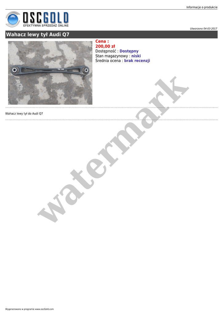 Informacje o produkcie Utworzono 04-03-2017 Wahacz lewy tył Audi Q7 Cena : 200,00 zł w at Wahacz lewy tył do Audi Q7 er m ar k Dostępność : Dostępny Stan magazynowy : niski Średnia ocena : brak recenzji Wygenerowano w programie www.oscGold.com