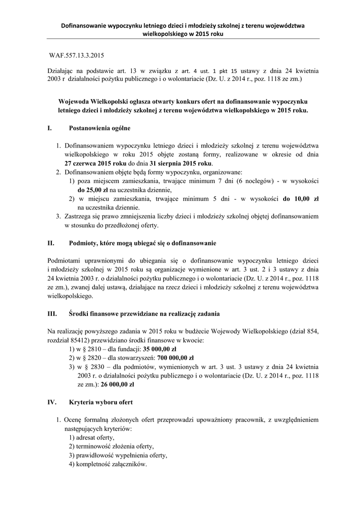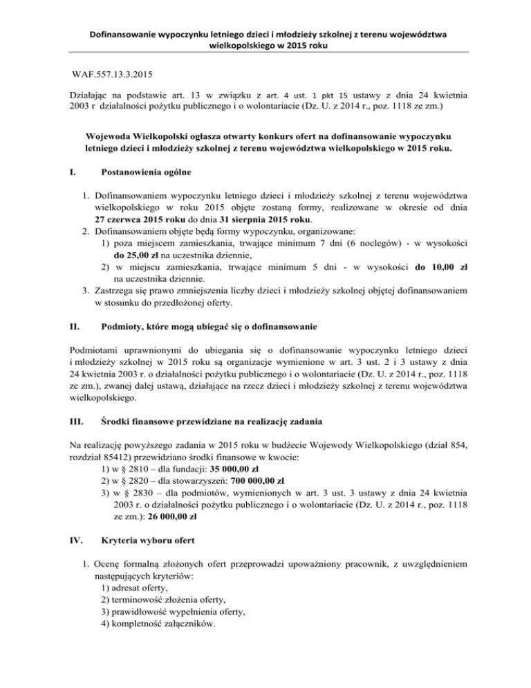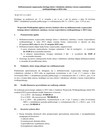 Dofinansowanie wypoczynku letniego dzieci i młodzieży szkolnej z terenu województwa wielkopolskiego w 2015 roku WAF.557.13.3.2015 Działając na podstawie art. 13 w związku z art. 4 ust. 1 pkt 15 ustawy z dnia 24 kwietnia 2003 r działalności pożytku publicznego i o wolontariacie (Dz. U. z 2014 r., poz. 1118 ze zm.) Wojewoda Wielkopolski ogłasza otwarty konkurs ofert na dofinansowanie wypoczynku letniego dzieci i młodzieży szkolnej z terenu województwa wielkopolskiego w 2015 roku. Postanowienia ogólne I. 1. Dofinansowaniem wypoczynku letniego dzieci i młodzieży szkolnej z terenu województwa wielkopolskiego w roku 2015 objęte zostaną formy, realizowane w okresie od dnia 27 czerwca 2015 roku do dnia 31 sierpnia 2015 roku. 2. Dofinansowaniem objęte będą formy wypoczynku, organizowane: 1) poza miejscem zamieszkania, trwające minimum 7 dni (6 noclegów) - w wysokości do 25,00 zł na uczestnika dziennie, 2) w miejscu zamieszkania, trwające minimum 5 dni - w wysokości do 10,00 zł na uczestnika dziennie. 3. Zastrzega się prawo zmniejszenia liczby dzieci i młodzieży szkolnej objętej dofinansowaniem w stosunku do przedłożonej oferty. Podmioty, które mogą ubiegać się o dofinansowanie II. Podmiotami uprawnionymi do ubiegania się o dofinansowanie wypoczynku letniego dzieci i młodzieży szkolnej w 2015 roku są organizacje wymienione w art. 3 ust. 2 i 3 ustawy z dnia 24 kwietnia 2003 r. o działalności pożytku publicznego i o wolontariacie (Dz. U. z 2014 r., poz. 1118 ze zm.), zwanej dalej ustawą, działające na rzecz dzieci i młodzieży szkolnej z terenu województwa wielkopolskiego. III. Środki finansowe przewidziane na realizację zadania Na realizację powyższego zadania w 2015 roku w budżecie Wojewody Wielkopolskiego (dział 854, rozdział 85412) przewidziano środki finansowe w kwocie: 1) w § 2810 – dla fundacji: 35 000,00 zł 2) w § 2820 – dla stowarzyszeń: 700 000,00 zł 3) w § 2830 – dla podmiotów, wymienionych w art. 3 ust. 3 ustawy z dnia 24 kwietnia 2003 r. o działalności pożytku publicznego i o wolontariacie (Dz. U. z 2014 r., poz. 1118 ze zm.): 26 000,00 zł IV. Kryteria wyboru ofert 1. Ocenę formalną złożonych ofert przeprowadzi upoważniony pracownik, z uwzględnieniem następujących kryteriów: 1) adresat oferty, 2) terminowość złożenia oferty, 3) prawidłowość wypełnienia oferty, 4) kompletność załączników. Dofinansowanie wypoczynku letniego dzieci i młodzieży szkolnej z terenu województwa wielkopolskiego w 2015 roku 2. Oceny merytorycznej złożonych ofert o dofinansowanie wypoczynku letniego dzieci i młodzieży szkolnej w 2015 roku, dokona powołana przez Wojewodę Wielkopolskiego Komisja, z uwzględnieniem w szczególności następujących kryteriów: a) adresat – dzieci i młodzież szkolna z terenu województwa wielkopolskiego wymagająca wsparcia w celu wyrównywania szans edukacyjnych oraz dzieci i młodzież szkolna z mniejszymi szansami, która ze względu na swoją sytuację, wynikającą m.in. z problemów rodzinnych, miejsca zamieszkania, niepełnosprawności posiada utrudniony dostęp do wypoczynku, b) wkład własny – środki gwarantujące wykonanie zadania, z podziałem na poniżej zdefiniowane zasoby: Środki finansowe własne to środki finansowe będące w dyspozycji organizacji pozarządowej lub podmiotu wymienionego w art. 3 ust. 3 ustawy, realizujących zlecone zadanie publiczne i przez nich bezpośrednio wydatkowane. Charakter finansowy ma wkład własny z następujących źródeł: z finansowych środków własnych oraz środków finansowych z innych źródeł, w skład których wchodzą wpłaty i opłaty adresatów zadania publicznego, środków finansowych z innych źródeł publicznych oraz pozostałych środków finansowych, o których mowa w pozycji IV.2. tabeli oferty konkursowej Przewidywane źródła finansowania zadania publicznego. Z kolei wkład osobowy (w tym praca społeczna członków i świadczenia wolontariuszy) – jest wkładem niefinansowym. Dokumentowanie poniesionych przez organizację pozarządową lub podmiot wymieniony w art. 3 ust. 3 ustawy, wydatków następuje w formie dowodów księgowych (np. faktur VAT, rachunków, umów cywilnoprawnych związanych z realizacją zadania) na nią wystawionych. Potwierdzeniem prawidłowo zrealizowanego zadania pod względem finansowym jest odpowiednio prowadzona rachunkowość. Wkład własny osobowy to wsparcie osobowe, w tym praca społeczna członków i świadczenia wolontariuszy w realizowane zadanie, wniesione bezpośrednio przez dotowaną organizację pozarządową lub podmiot wymieniony w art. 3 ust. 3 Ustawy, nie powodujące faktycznego wydatku pieniężnego. Organizacje, deklarujące wkład osobowy, powinny oszacować jego wartość wraz ze wskazaniem sposobu wyceny, który należy umieścić w punkcie IV oferty „Uwagi, które mogą mieć znaczenie przy ocenie kosztorysu”. Wkład własny rzeczowy to wsparcie rzeczowe w realizowane zadanie wniesiony bezpośrednio przez dotowaną organizację pozarządową lub podmiot wymieniony w art. 3 ust. 3 – będący w dyspozycji podmiotu zaangażowanego w realizację zadania (np. zasoby rzeczowe, tj. własne obiekty i urządzenia sportowe i turystyczne). Jest on wkładem dodatkowym, który nie może być przeliczany na wkład finansowy i wskazywany jako własne środki finansowe przy realizacji zadania publicznego. W przypadku oferty wspólnej należy przyporządkować zasoby finansowe, osobowe i rzeczowe do dysponujących nimi oferentów. c) zakwaterowanie uczestników, w pierwszej kolejności dofinansowanie otrzymają organizatorzy dysponujący bazą wypoczynku mieszczącą się na ogrodzonym i oświetlonym terenie, dysponującym sanitariatami zgodnie z rozporządzeniem Ministra Gospodarki i Pracy z dnia 19 sierpnia 2004 r. w sprawie obiektów hotelarskich i innych Dofinansowanie wypoczynku letniego dzieci i młodzieży szkolnej z terenu województwa wielkopolskieg