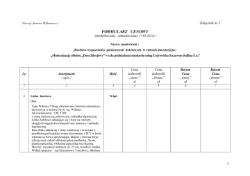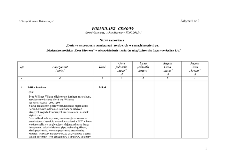 Załącznik nr 2 / Pieczęć firmowa Wykonawcy / FORMULARZ CENOWY /zmodyfikowany, zaktualizowany 17.05.2012r./ Nazwa zamówienia : „Dostawa wyposaŜenia pomieszczeń hotelowych w ramach inwestycji pn.: „Modernizacja obiektu „Dom Zdrojowy” w celu podniesienia standardu usług Uzdrowiska Szczawno-Jedlina S.A.” Lp Asortyment / opis / Ilość 1 2 3 1 ŁóŜka hotelowe Cena jednostki „netto” zł Cena jednostki „brutto” zł Razem Cena „netto” zł Razem Cena „brutto” zł 4 5 6 7 74 kpl Opis: Typu Wilimex Village okleinowane fornirem naturalnym, barwionym w kolorze Nr 41 wg Wilimex lub równowaŜne: L90, T200 z ramą, materacem, pokrowcem, nakładką higieniczną; ŁóŜko hotelowe składające się z bazy na czterech okrągłych nogach drewnianych oraz materaca i nakładki higienicznej. Baza łóŜka składa się z ramy metalowej z otworami o przedłuŜonym kształcie zwane kieszeniami z PCV w które włoŜone są listwy spręŜynujące, klejone z drewna litego (elastyczne), całość obłoŜona płytą meblarską, filcem, pianką tapicerską, włókniną tapicerską oraz tkaniną. Materac: wysokość materaca ok. 22 cm, twardość średnia. Wkład: spręŜyny – typ kieszeniowy 7-strefowy, obłoŜony 1 obustronnie płytami z pianki poliuretanowej o gr. 2 cm i płytami lateksowymi o gr. 2 cm. Pokrowiec: bawełniana tkanina typu Herning, pozytywnie przechodząca test papierosowy w oparciu o brytyjski i europejski standard BS i EN 597-1, pikowana owczą wełną (200g/m2) po stronie zimowej, bawełną (200 g/m2) po stronie letniej. Nakładka higieniczna: zabezpiecza materac przed zamoczeniem i zabrudzeniem. Wykonana z tkaniny typu Molton (100% bawełna), laminowany jednostronnie PCV, gramatura 360 g/m2, mocowanie do materaca za pomocą gumek wszytych w rogach, wykończona lamówką. W tym: 1) 2) 3) 4) ŁóŜko hotelowe w komplecie j.w. /bez paneli ściennych/ Pokoje nr: 11a, 13-14, 115, 121, 211a, 213, 215, 225, 226, 234a, 306, 312, 311a, 314, 332 ŁóŜko hotelowe w komplecie j.w. z panelem ściennym prawym typu Wilimex Village lub równowaŜnym L40, T130 Pokój nr 9 ŁóŜko hotelowe w komplecie j.w. z panelem ściennym prawym typu Wilimex Village lub równowaŜnym L40, T200 Pokoje nr : 222, 317-318, 333, 340, 342 ŁóŜko hotelowe w komplecie j.w. z panelem ściennym lewym typu Wilimex Village lub równowaŜnym L40, T200 Pokoje nr : 11b, 111, 114, 122, 211, 211b, 214, 222, 224, 308, 311b, 315-316, 326-327, 331, 341 47 kpl 1 kpl 5 kpl 19 kpl 2 5) 2 ŁóŜko hotelowe w komplecie j.w. z panelem ściennym lewym typu Wilimex Village lub równowaŜnym L40, T80 Pokoje nr : 334a, 340 Szafa hotelowa 2 kpl 62 szt. Opis: Typu Wilimex Village lub równowaŜne: Skrzynia wraz z drzwiami wykonane z drewna litego oraz płyty meblowej okleinowanej fornirem naturalnym, barwionym w kolorze Nr 41 wg Wilimex. Skrzynia szafy wykonana jest z płyty meblowej okleinowanej fornirem naturalnym. Środek szafy zawiera górną, stałą półkę na całej szerokości szafy. Pod tą półką szafa podzielona jest na część z 3 półkami (tzw. bieliźniarka) oraz część z drąŜkiem metalowym na wieszaki. Wszystkie półki i przegrody wykonane są z płyty meblowej okleinowanej fornirem naturalnym. Zwieńczenie szafy wykonane z drewna litego, posiada charakterystyczny profil. Pod zwieńczeniem na listwie ozdobnej umieszczone są: owalna rozeta drewniana oraz charakterystycznie wyprofilowane girlandy z drewna. Ponadto, na nogach szafy znajdują się elementy ozdobne w postaci kwadratów z drewna z otworami kwadratowymi, w których umocowane są kwadratowe kołki o wielkości 10 x 10mm. Uchwyty w szafie: metalowe, z patynowanego mosiądzu, z charakterystyczną koronką. Fronty szaf wykonane są z okleinowanego dębem MDF-u, z wykonanymi charakterystycznymi filunkami. W tym: 1) Szafa hotelowa j.w. L90, T60 44 szt. 3 2) 3) 3 4 Szafa hotelowa j.w. L120, T60 Szafa hotelowa j.w. L115, T60 Szafka nocna Opis: Typu Wilimex Village 1600-19-01, H52, L45, T35 lub równowaŜne: Wykonane z drewna litego, płyty meblowej okleinowanej fornirem naturalnym, barwionym w kolorze Nr 41 wg Wilimex. Nogi szafki nocnej wykonane z drewna, z charakterystycznymi nacięciami oraz kwadratowymi otworami z wbitymi kołkami o wielkości 10 x 10mm. Front szuflady wykonany z płyty meblowej fornirowanej okleiną naturalną. Szuflada posiada wyfrezowany filunek oraz uchwyt metalowy, z patynowanego mosiądzu, z charakterystyczną koronką. Pod szufladą znajduje się listwa ozdobna z charakterystyczną rozetą drewnianą. Blat szafki nocnej wykonany jest z płyty MDF fornirowanej okleiną naturalną. Szafka „mini-barek” z chłodziarką Opis: Szafka typu Wilimex Village 1600-12-03, H79, L59, T52, dostosowana do montaŜu chłodziarki, z otworem wentylacyjnym z tyłu lub równowaŜna: Wykonana z drewna litego, płyty meblowej okleinowanej fornirem naturalnym, barwionym w kolorze Nr 41 wg Wilimex. Nogi wykonane z drewna, z charakterystycznymi nacięciami oraz kwadratowymi otworami z wbitymi kołkami o wielkości 10 x 10mm. Front szuflady wykonany z płyty meblowej okleinowanej fornirem naturalnym. 10 szt. 8 szt. 74 szt. 37 kpl 4 Szuflada posiada wyfrezowany filunek oraz uchwyt metalowy, z patynowanego mosiądzu, z charakterystyczną koronką. Pod i nad szafką znajduje się listwa ozdobna z charakterystyczną rozetą drewnianą. Front szafki wykonany jest z płyty meblowej okleinowanej fornirem naturalnym. Szafka posiada wyfrezowany filunek oraz uchwyt metalowy, z patynowanego mosiądzu, z charakterystyczną koronką. Blat szafki wykonany jest z płyty MDF okleinowanej fornirem naturalnym, barwionym w kolorze L-03 wg Wilimex. Chłodziarka Pojemność 30 l, zasilanie 230/115 Volt, zuŜycie energii: 0,6 kWh/24h, moc 75 Watt, wymiary: wysokość 45cm, szerokość 40cm, głębokość 43cm. 5 6 Wieszak Opis: Wieszak na panelu typu Wilimex Village 1600-47-02, H145, L60, T52 lub równowaŜny: Wykonany z drewna litego, płyty meblowej oklei