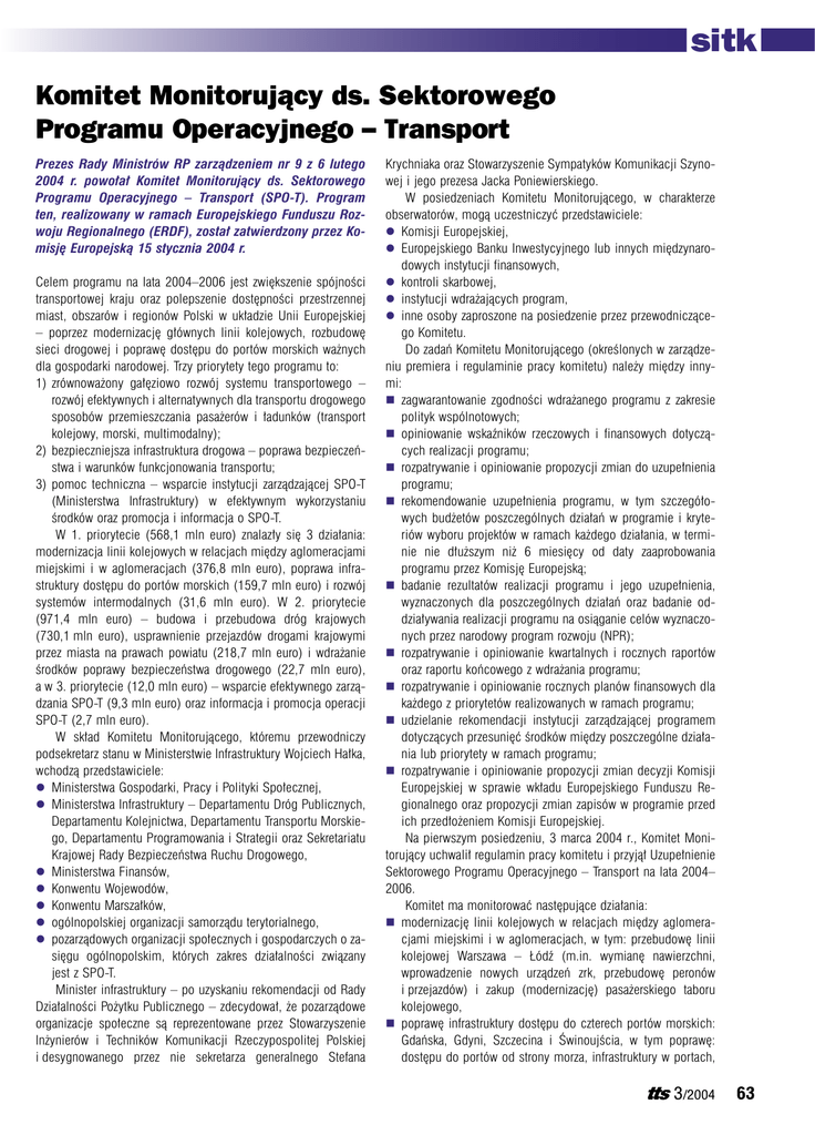 sitk Komitet Monitorujący ds. Sektorowego Programu Operacyjnego – Transport Prezes Rady Ministrów RP zarządzeniem nr 9 z 6 lutego 2004 r. powołał Komitet Monitorujący ds. Sektorowego Programu Operacyjnego – Transport (SPO-T). Program ten, realizowany w ramach Europejskiego Funduszu Rozwoju Regionalnego (ERDF), został zatwierdzony przez Komisję Europejską 15 stycznia 2004 r. Celem programu na lata 2004–2006 jest zwiększenie spójności transportowej kraju oraz polepszenie dostępności przestrzennej miast, obszarów i regionów Polski w układzie Unii Europejskiej – poprzez modernizację głównych linii kolejowych, rozbudowę sieci drogowej i poprawę dostępu do portów morskich ważnych dla gospodarki narodowej. Trzy priorytety tego programu to: 1) zrównoważony gałęziowo rozwój systemu transportowego – rozwój efektywnych i alternatywnych dla transportu drogowego sposobów przemieszczania pasażerów i ładunków (transport kolejowy, morski, multimodalny); 2) bezpieczniejsza infrastruktura drogowa – poprawa bezpieczeństwa i warunków funkcjonowania transportu; 3) pomoc techniczna – wsparcie instytucji zarządzającej SPO-T (Ministerstwa Infrastruktury) w efektywnym wykorzystaniu środków oraz promocja i informacja o SPO-T. W 1. priorytecie (568,1 mln euro) znalazły się 3 działania: modernizacja linii kolejowych w relacjach między aglomeracjami miejskimi i w aglomeracjach (376,8 mln euro), poprawa infrastruktury dostępu do portów morskich (159,7 mln euro) i rozwój systemów intermodalnych (31,6 mln euro). W 2. priorytecie (971,4 mln euro) – budowa i przebudowa dróg krajowych (730,1 mln euro), usprawnienie przejazdów drogami krajowymi przez miasta na prawach powiatu (218,7 mln euro) i wdrażanie środków poprawy bezpieczeństwa drogowego (22,7 mln euro), a w 3. priorytecie (12,0 mln euro) – wsparcie efektywnego zarządzania SPO-T (9,3 mln euro) oraz informacja i promocja operacji SPO-T (2,7 mln euro). W skład Komitetu Monitorującego, któremu przewodniczy podsekretarz stanu w Ministerstwie Infrastruktury Wojciech Hałka, wchodzą przedstawiciele: l Ministerstwa Gospodarki, Pracy i Polityki Społecznej, l Ministerstwa Infrastruktury – Departamentu Dróg Publicznych, Departamentu Kolejnictwa, Departamentu Transportu Morskiego, Departamentu Programowania i Strategii oraz Sekretariatu Krajowej Rady Bezpieczeństwa Ruchu Drogowego, l Ministerstwa Finansów, l Konwentu Wojewodów, l Konwentu Marszałków, l ogólnopolskiej organizacji samorządu terytorialnego, l pozarządowych organizacji społecznych i gospodarczych o zasięgu ogólnopolskim, których zakres działalności związany jest z SPO-T. Minister infrastruktury – po uzyskaniu rekomendacji od Rady Działalności Pożytku Publicznego – zdecydował, że pozarządowe organizacje społeczne są reprezentowane przez Stowarzyszenie Inżynierów i Techników Komunikacji Rzeczypospolitej Polskiej i desygnowanego przez nie sekretarza generalnego Stefana Krychniaka oraz Stowarzyszenie Sympatyków Komunikacji Szynowej i jego prezesa Jacka Poniewierskiego. W posiedzeniach Komitetu Monitorującego, w charakterze obserwatorów, mogą uczestniczyć przedstawiciele: l Komisji Europejskiej, l Europejskiego Banku Inwestycyjnego lub innych międzynarodowych instytucji finansowych, l kontroli skarbowej, l instytucji wdrażających program, l inne osoby zaproszone na posiedzenie przez przewodniczącego Komitetu. Do zadań Komitetu Monitorującego (określonych w zarządzeniu premiera i regulaminie pracy komitetu) należy między innymi: n zagwarantowanie zgodności wdrażanego programu z zakresie polityk wspólnotowych; n opiniowanie wskaźników rzeczowych i finansowych dotyczących realizacji programu; n rozpatrywanie i opiniowanie propozycji zmian do uzupełnienia programu; n rekomendowanie uzupełnienia programu, w tym szczegółowych budżetów poszczególnych działań w programie i kryteriów wyboru projektów w ramach każdego działania, w terminie nie dłuższym niż 6 miesięcy od daty zaaprobowania programu przez Komisję Europejską; n badanie rezultatów realizacji programu i jego uzupełnienia, wyznaczonych dla poszczególnych działań oraz badanie oddziaływania realizacji programu na osiąganie celów wyznaczonych przez narodowy program rozwoju (NPR); n rozpatrywanie i opiniowanie kwartalnych i rocznych raportów oraz raportu końcowego z wdrażania programu; n rozpatrywanie i opiniowanie rocznych planów finansowych dla każdego z priorytetów realizowanych w ramach programu; n udzielanie rekomendacji instytucji zarządzającej programem dotyczących przesunięć środków między poszczególne działania lub priorytety w ramach programu; n rozpatrywanie i opiniowanie propozycji zmian decyzji Komisji Europejskiej w sprawie wkładu Europejskiego Funduszu Regionalnego oraz propozycji zmian zapisów w programie przed ich przedłożeniem Komisji Europejskiej. Na pierwszym posiedzeniu, 3 marca 2004 r., Komitet Monitorujący uchwalił regulamin pracy komitetu i przyjął Uzupełnienie Sektorowego Programu Operacyjnego – Transport na lata 2004– 2006. Komitet ma monitorować następujące działania: n modernizację linii kolejowych w relacjach między aglomeracjami miejskimi i w aglomeracjach, w tym: przebudowę linii kolejowej Warszawa – Łódź (m.in. wymianę nawierzchni, wprowadzenie nowych urządzeń zrk, przebudowę peronów i przejazdów) i zakup (modernizację) pasażerskiego taboru kolejowego, n poprawę infrastruktury dostępu do czterech portów morskich: Gdańska, Gdyni, Szczecina i Świnoujścia, w tym poprawę: dostępu do portów od strony morza, infrastruktury w portach, 3/2004 63 sitk dostępu do portów od strony lądu do rejonów przeładunkowych w portach (III etap budowy Trasy Kwiatkowskiego w Gdyni); n rozwój systemów intermodalnych, w tym budowę: jednego centrum logistycznego, 2–3 terminali kontenerowych; n budowę i przebudowę dróg krajowych w celu likwi