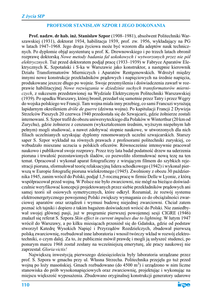 Z życia SEP PROFESOR STANISŁAW SZPOR I JEGO DOKONANIA Prof. nadzw. dr hab. inż. Stanisław Szpor (1908–1981), absolwent Politechniki Warszawskiej (1931), doktorat 1934, habilitacja 1939, prof. zw. 1956, wykładający na PG w latach 1947–1968. Jego droga życiowa może być wzorem dla adeptów nauk technicznych. Po dyplomie objął asystenturę u prof. K. Drewnowskiego i po trzech latach obronił rozprawę doktorską Nowe metody badania fal uskokowych i wytworzonych przez nie pól elektrycznych. Tuż przed doktoratem podjął pracę (1933–1939) w Fabryce Aparatów Elektrycznych K. Szpotański i S-ka w Warszawie jako konstruktor, a następnie kierownik Działu Transformatorów Mierniczych i Aparatów Rentgenowskich. Wdrożył między innymi nowe konstrukcje przekładników prądowych i napięciowych na średnie napięcia, produkowane jeszcze długo po wojnie. Swoje przemyślenia i doświadczenia zawarł w rozprawie habilitacyjnej Nowe rozwiązania w dziedzinie suchych transformatorów mierniczych, z sukcesem przedstawionej na Wydziale Elektrycznym Politechniki Warszawskiej (1939). Po upadku Warszawy, której bronił, przedarł się samotnie przez Tatry i przez Węgry do wojska polskiego we Francji. Tam wojna miała inny przebieg, co sami Francuzi wyrażają lapidarnym określeniem drôle de guerre (dziwna wojna). Po kapitulacji Francji 2 Dywizja Strzelców Pieszych 20 czerwca 1940 przedostała się do Szwajcarii, gdzie żołnierze zostali internowani. S. Szpor trafił do obozu uniwersyteckiego dla Polaków w Winterthur (20 km od Zurychu), gdzie żołnierze z cenzusem (wykształceniem średnim, wyższym niepełnym lub pełnym) mogli studiować, a nawet zdobywać stopnie naukowe, w utworzonych dla nich filiach uczelnianych uzyskując dyplomy renomowanych uczelni szwajcarskich. Starszy saper S. Szpor wykładał na równych prawach z profesorami politechniki zuryskiej, co wzbudzało mieszane uczucia u polskich oficerów. Równocześnie intensywnie pracował naukowo i publikował swoje rozprawy. Przez trzy lata badał podatność drzew na uderzenia pioruna i trwałość pozostawionych śladów, co pozwoliło sformułować nową tezę na ten temat. Opracował i wykonał aparat fotograficzny z wirującym filmem do szybkich rejestracji pioruna, sformułował teorię relaksacyjną lidera schodkowego (1942) i wykonał pierwszą w Europie fotografię pioruna wielokrotnego (1945). Zwolniony z obozu 30 października 1945, zanim wrócił do Polski, podjął 1,5-roczną pracę w firmie Delle w Lyonie, z którą współpracował przed wojną. W Polsce nie było zwarciowni, nie mógł na bieżąco doświadczalnie weryfikować koncepcji projektowanych przez siebie przekładników prądowych ani samej teorii sił osiowych symetrycznych, które odkrył. Rozumiał, że rozwój systemu elektroenergetycznego powojennej Polski zwiększy wymagania co do obciążalności zwarciowej aparatów oraz urządzeń i wymusi budowę niejednej zwarciowni. Chciał zatem poznać ich tajniki i dopiero z takim bagażem doświadczeń wrócić do Polski. Nie zaniedbywał swojej głównej pasji, już w programie pierwszej powojennej sesji CIGRE (1946) znalazł się referat S. Szpora Skin effect in current impulses due to lightning. W lutym 1947 wrócił do Warszawy, a po kilku miesiącach przeniósł się do Gdańska, gdzie od podstaw stworzył Katedrę Wysokich Napięć i Przyrządów Rozdzielczych, zbudował pierwszą polską zwarciownię, rozbudował inne laboratoria i wnosił twórczy wkład w rozwój elektrotechniki, o czym dalej. Za to, że publicznie mówił prawdę i mogli ją usłyszeć studenci, po ponurym marcu 1968 został zesłany na wcześniejszą emeryturę, ale pracy naukowej nie zaprzestał. Gloria victis! Największą inwestycją pierwszego dziesięciolecia były laboratoria urządzane przez prof. S. Szpora w gmachu przy ul. Własna Strzecha. Politechnika przejęła go tuż przed wojną po loży masońskiej. Gmach rozbudowano (do 4500 m3) i urządzono w nim liczne stanowiska do prób wysokonapięciowych oraz zwarciownię, projektując i wykonując na miejscu większość wyposażenia. Zbudowano oryginalnej konstrukcji generatory udarowe 110 Z życia SEP do 300 kV, do 500 kV (0,169 kJ) oraz do 1000 kV (10 kJ), mostek Scheringa, układ do badania ulotu i kilka innych stanowisk na napięcia probiercze przemienne i stałe. Wykonano nowy aparat fotograficzny z wirującym filmem do zdjęć pioruna (Henryk Dzierżek). Zbudowano i uruchomiono w 1953 roku pierwszą w Polsce zwarciownię. Początkowo miała ona układ jednofazowy i prąd zwarciowy do 100 kA przy napięciach do 1000 V (transformator 15 kV/110, 220, 440, 880 V; 5/15 MVA), a w 1955 została rozbudowana do układu trójfazowego o mocy zwarciowej 100 MVA na napięcia do 24 kV. Wyposażenie projektował i budował liczny zespół: Henryk Dzierżek (dławiki regulacyjne 15 kV), Wojciech Winiarski (boczniki wielkoprądowe), Jerzy Galotzy (nastawnik czasowy i fazowy), Władysław Borek (załącznik zwarciowy) i inni. Transformator zwarciowy według projektu dra Michała Jabłońskiego wykonała fabryka M3 w Łodzi. Dłuższy czas była to jedyna w Polsce zwarciownia; kierowali nią kolejno H. Dzierżek i W. Winiarski, a od kilku lat – Roman Partyka. S. Szpor w 1948 roku wydał dwa skrypty: Technika izolacyjna oraz Miernictwo wysokonapięciowe, w 1950 broszurę Piorun, w 1951 podręcznik Wytrzymałość elektryczna i technika izolacyjna (wznowiony 1959, 1965, 1967), a w latach 1953 i 1955 dwutomową fundamentalną monografię Ochrona odgromowa. Po uruchomieniu laboratoriów wiele zleceń otrzymywał Zakład Wysokich Napięć katedry prof. S. Szpora, dysponujący wyjątkowym wyposażeniem. Dotyczyły one zarówno prac najprostszych (badanie oleju izolacyjnego i sprzętu ochronnego, badania stanu izolacji linii kablowych), jak i projektów oraz badań konstruktorskich nowych aparatów i urządzeń, zwłaszcza badań zwarciowych w jedynej krajowej zwarciowni;