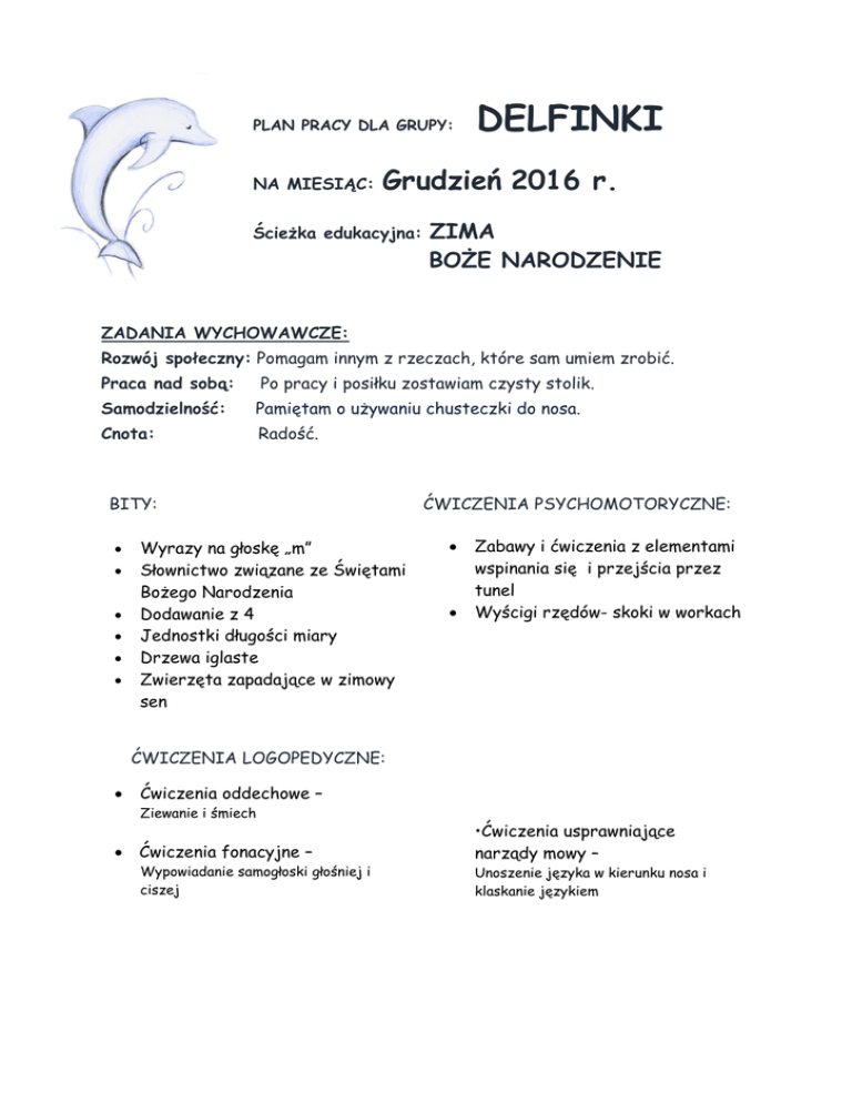 PLAN PRACY DLA GRUPY: NA MIESIĄC: DELFINKI Grudzień 2016 r. Ścieżka edukacyjna: ZIMA BOŻE NARODZENIE ZADANIA WYCHOWAWCZE: Rozwój społeczny: Pomagam innym z rzeczach, które sam umiem zrobić. Praca nad sobą: Po pracy i posiłku zostawiam czysty stolik. Samodzielność: Pamiętam o używaniu chusteczki do nosa. Cnota: Radość. BITY: Wyrazy na głoskę „m” Słownictwo związane ze Świętami Bożego Narodzenia Dodawanie z 4 Jednostki długości miary Drzewa iglaste Zwierzęta zapadające w zimowy sen ĆWICZENIA PSYCHOMOTORYCZNE: Zabawy i ćwiczenia z elementami wspinania się i przejścia przez tunel Wyścigi rzędów- skoki w workach ĆWICZENIA LOGOPEDYCZNE: Ćwiczenia oddechowe – Ziewanie i śmiech Ćwiczenia fonacyjne – Wypowiadanie samogłoski głośniej i ciszej •Ćwiczenia usprawniające narządy mowy – Unoszenie języka w kierunku nosa i klaskanie językiem Wiersz logopedyczny Hi hi hi Hi-hi-hi, pan hipopotam na hien punkcie miewał kota. Hie-hie, hie-hie, panie hieny łapał kiedyś dla higieny. Hi-hi-hi, hi-hi-hi! Jedną chciał dać mi. Wiersz „Bałwanek” A. Wojtowicz Jestem bałwanek malutki I mam brzuszek okrąglutki Oczka czarne – dwa węgielki I z marchewki nosek wielki. Mam też trzy złote guziczki Zamiast rączek mam patyczki Szalik mam od cioci Zosi Bardzo dobrze się go nosi. Garnek noszę też na głowie Często podśpiewuję sobie. Hejże ho, hejże hola! Jaka ciężka moja dola Kiedy odwilż, źle się dzieje, Bo ja natychmiast topnieje. „Zima” Gdy piecuchy i niedźwiedzie W ciepłych kątach będą siedzieć, Nas na pewno nie zatrzyma Pod pierzyną mroźna zima! Mamy kurtki i szaliki, Ciepłe czapki, nauszniki, Więc choć mrozek w nosy szczypie, Złapać się nie damy grypie! Piosenki „Zima lubi dzieci” 1. Zaspy zaspały śnieg we śnie, szybują szyby w białe kwiatki. Pan lód dziś blady ,pada śnieg, to mroźne kwiatki gubią płatki. Bieli nawiało dobry metr, słońce ma wąsy pobielone. Zimowe dzieci lubią biel, to od niej uszy są czerwone. REF: Zima lubi dzieci najbardziej na świecie, dorośli mi mówią nie wierzę. Dzieci roześmiane stawiają bałwana, dorośli stawiają kołnierze. 4X 2. Zima zimuje w swoim śnie, ciepło okryta puchem kołdry. Zima naprawdę lubi cię, więc ty bądź czasem dla niej dobry. Jadą kolędy w cichą noc, gorąca nuta z okien płynie. I w chłodnych ludziach taje śnieg, tak ciepło bywa tylko w zimie. „Świeć gwiazdeczko” Zaprowadź mnie, prosto do Betlejem zaprowadź mnie, gdzie Bóg narodził się zaprowadź mnie, nie mogę spóźnić się, nie mogę spóźnić się Ref: Świeć, gwiazdeczko, mała świeć do Jezusa prowadź mnie x2 Narodził się, Bóg stąpił na Ziemie Narodził się, by uratować mnie Narodził się i nie zostawił mnie x2 Czekaja tam, Józef i Maryja Śpiewają nam, śpiewają gloriia To gloriia, święta historiia x2 „Przybieżeli do Betlejem” Przybieżeli do Betlejem pasterze, Grając skocznie Dzieciąteczku na lirze. Chwała na wysokości, chwała na wysokości, a pokój na ziemi. Oddawali swe ukłony w pokorze Tobie z serca ochotnego, o Boże! Chwała na wysokości... Anioł Pański sam ogłosił te dziwy, Których oni nie słyszeli, jak żywi. Chwała na wysokości... Zagadki Co to za gwiazdeczki odpowiedzcie śmiało, które stroją ziemię w sukieneczkę białą? (śnieg) Wszystkie pojazdy na świecie muszą mieć koła, jak wiecie. A te, nie mają ich wcale! I zimą jeździ się na nich wspaniale. (sanki) Kapie z dachu woda, lecą zimne krople, ale gdy mróz chwyci, zamieni je w… (sople) Już słychać kolędy. Drzewka pachną wokół….Pora na kolację, najważniejszą w roku. (wigilia) Co to za kochany święty, co przynosi nam prezenty. Kiedy gwiazdka już zaświeci, on obdarza wszystkie dzieci. (św. Mikołaj) Co to za żeberka przy ścianie wiszące, co latem są zimne, a zimą gorące? (kaloryfer) Audycje muzyczne Jan Sebastian Bach – Chorał finałowy z „Oratorium na Boże Narodzenie” Sergiusz Rachmaninow –Koncert fortepianowy nr 2 c-moll op. 18 cz. II Język angielski: Nauka śpiewania alfabetu oraz piosenek świątecznych w języku angielskim. Słownictwo: •Christmas •Christmas tree •Star •Jingle bells •Alphabet song •Snowman •Snow flake •Santa Claus Struktura: Have a very Merry Christmas and a Happy New Year! Frosty The Snowman! This is a star. Piosenka: Jingle Bells Dashing through the snow On a one horse open sleigh Over the fields we go, Laughing all the way Bells on bob tail ring, making spirits bright What fun it is to laugh and sing A sleighing song tonight Oh, jingle bells, jingle bells Jingle all the way Oh, what fun it is to ride In a one horse open sleigh Jingle bells, jingle bells Jingle all the way Oh, what fun it is to ride In a one horse open sleigh Jingle Bells, Jingle Bells, Jingle all the way! Oh, What fun it is to ride In a one horse open sleigh x 4 The Alphabet song ABCDEFG HIJK LMNOP QRS TUV W X Y and Z Now I know my ABC's Next time won't you sing with me