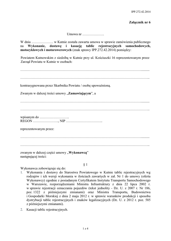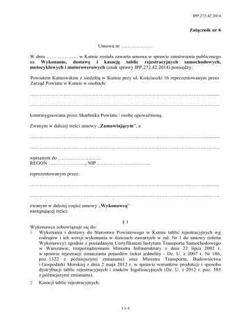 IPP.272.42.2014 Załącznik nr 6 Umowa nr ………………. W dniu ………………. w Kutnie została zawarta umowa w sprawie zamówienia publicznego na Wykonanie, dostawę i kasację tablic rejestracyjnych samochodowych, motocyklowych i motorowerowych (znak sprawy IPP.272.42.2014) pomiędzy: Powiatem Kutnowskim z siedzibą w Kutnie przy ul. Kościuszki 16 reprezentowanym przez Zarząd Powiatu w Kutnie w osobach: …………………………………………………………………………………………….......... ………………………………………………………………………………………………….. kontrasygnowana przez Skarbnika Powiatu / osobę upoważnioną. Zwanym w dalszej treści umowy „Zamawiającym”, a …………………………………………………………………………………………….......... ………………………………………………………………………………………………….. wpisanym do …………………….. REGON …………………., NIP ………………………….. reprezentowanym przez: …………………………………………………………………………………………….......... ………………………………………………………………………………………………….. zwanym w dalszej części umowy „Wykonawcą” następującej treści: §1 Wykonawca zobowiązuje się do: l. Wykonania i dostawy do Starostwa Powiatowego w Kutnie tablic rejestracyjnych wg rodzajów i ich wersji wykonania w ilościach zawartych w zał. Nr 1 do umowy (oferta Wykonawcy) zgodnie z posiadanym Certyfikatem Instytutu Transportu Samochodowego w Warszawie, rozporządzeniami Ministra Infrastruktury z dnia 22 lipca 2002 r. w sprawie rejestracji oznaczania pojazdów (tekst jednolity - Dz. U. z 2007 r. Nr 186, poz. 1322 z późniejszymi zmianami) oraz Ministra Transportu, Budownictwa i Gospodarki Morskiej z dnia 2 maja 2012 r. w sprawie warunków produkcji i sposobu dystrybucji tablic rejestracyjnych i znaków legalizacyjnych (Dz. U. z 2012 r. poz. 585 z późniejszymi zmianami). 2. Kasacji tablic rejestracyjnych. 1z4 IPP.272.42.2014 §2 1. Wykonawca zobowiązuje się do wykonania i dostawy ilości i rodzaju tablic, rejestracyjnych, sukcesywnie zgodnie z zamówieniami składanymi przez Zamawiającego, których łączna wartość nie przekroczy …………. zł brutto. 2. Ustala się następujące ceny jednostkowe netto tablic rejestracyjnych, zgodnie z załącznikiem Nr 1 do umowy (oferta Wykonawcy): Cena jednostkowa netto Lp. Rodzaj tablicy zł 1 Tablica samochodowa w każdej wersji 2 Tablica motocyklowa w każdej wersji 3 Tablica motorowerowa w każdej wersji 4 Wtórnik tablicy Słownie 3. Do cen podanych w ust. 2 wliczono wykonanie i dostawę zamawianych tablic rejestracyjnych do siedziby Wydziału Komunikacji Starostwa Powiatowego w Kutnie. 4. Termin dostawy wykonanych tablic rejestracyjnych ustala się na 14 dni od daty złożenia przez Zamawiającego zamówienia. 5. Zamawiający zastrzega sobie prawo ograniczenia ilości dostaw objętych zamówieniem w przypadku wystąpienia trudności finansowych albo zmniejszenia ilości rejestrowanych pojazdów z przyczyn niezależnych od Zamawiającego. 6. Fakturę należy wystawić na: Powiat Kutnowski NIP: 775 258 80 40, 99-300 Kutno, ul. Kościuszki 16. 7. Należność płatna będzie przelewem na konto Wykonawcy wskazane na fakturze, w terminie 30 dni od dnia złożenia faktury. §3 1. Wykonawca zobowiązuje się odbierać od Zamawiającego własną siłą i transportem tablice rejestracyjne przeznaczone do kasacji w terminach określonych przez Zamawiającego według sporządzonego wykazu. 2. Wykonawca zobowiązuję się do kasacji odebranych tablic rejestracyjnych (stalowych, aluminiowych i plastikowych) w sposób uniemożliwiający ich ponowne wykorzystanie tj. poprzez dwukrotne przecięcie każdej tablicy we własnym zakładzie produkcji tablic. Dodatkowo tablice plastikowe podlegają utylizacji. §4 1. Wykonawca udziela gwarancji na dostarczane tablice rejestracyjne na okres 36 miesięcy. 2. Wykonawca zobowiązuję się do przeprowadzenia ewidencji produkowanych odtwarzanych tablic zgodnie z obowiązującymi w tym zakresie przepisami prawa. 2z4 IPP.272.42.2014 §5 1. W przypadku braku zabezpieczenia środków na zobowiązania wynikające z niniejszej umowy w budżecie Zamawiającego, Zamawiający zastrzega sobie prawo odstąpienia od niniejszej umowy w terminie 20 dni od chwili powzięcia wiadomości o tych okolicznościach. 2. W razie zaistnienia istotnej zmiany okoliczności powodującej, że wykonanie umowy nie leży w interesie publicznym, czego nie można było przewidzieć w chwili zawarcia umowy, Zamawiający może odstąpić od umowy w terminie 30 dni od powzięcia wiadomości o tych okolicznościach. 3. W przypadku, o którym mowa w ust. 1, Wykonawca może żądać wyłącznie wynagrodzenia należnego z tytułu wykonania części umowy. 4. Odstąpienie od umowy powinno nastąpić w formie pisemnej pod rygorem nieważności takiego oświadczenia i powinno zawierać uzasadnienie. §6 1. W przypadkach: 1) nie wywiązywania się Wykonawcy z terminów określonych w zamówieniu, 2) niedostosowania jakości tablic do wymogów Certyfikatu Instytutu Transportu Samochodowego w Warszawie, rozporządzeń Ministra Infrastruktury z dnia 22 lipca 2002 r. w sprawie rejestracji oznaczania pojazdów (tekst jednolity - Dz.U. z 2007 r. Nr 186, poz.1322 z późniejszymi zmianami) oraz Ministra Transportu, Budownictwa i Gospodarki Morskiej z dnia 2 maja 2012 r. w sprawie warunków produkcji i sposobu dystrybucji tablic rejestracyjnych i znaków legalizacyjnych (Dz.U. z 2012 r. poz.585 z późniejszymi zmianami)., 3) braku aktualnego certyfikatu Instytutu Transportu Samochodowego w Warszawie lub zezwolenia Wojewody na produkcję tablic rejestracyjnych zgodnie z art. 75a ustawy z dnia 20 czerwca 1997 roku pr