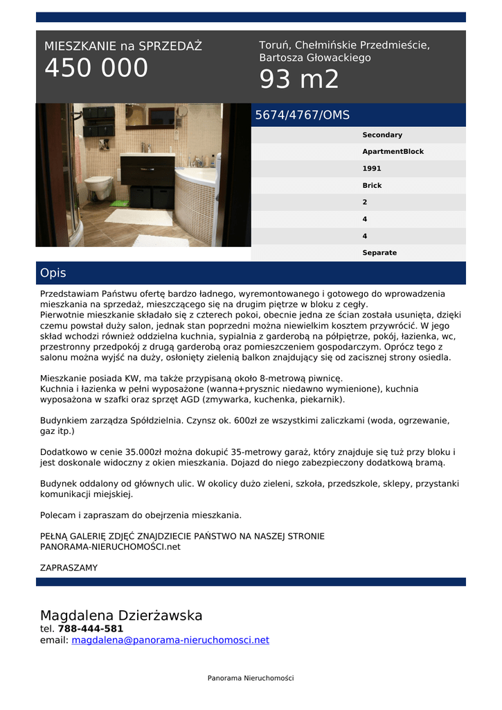 MIESZKANIE na SPRZEDAŻ 450 000 Toruń, Chełmińskie Przedmieście, Bartosza Głowackiego 93 m2 5674/4767/OMS Secondary ApartmentBlock 1991 Brick 2 4 4 Separate Opis Przedstawiam Państwu ofertę bardzo ładnego, wyremontowanego i gotowego do wprowadzenia mieszkania na sprzedaż, mieszczącego się na drugim piętrze w bloku z cegły. Pierwotnie mieszkanie składało się z czterech pokoi, obecnie jedna ze ścian została usunięta, dzięki czemu powstał duży salon, jednak stan poprzedni można niewielkim kosztem przywrócić. W jego skład wchodzi również oddzielna kuchnia, sypialnia z garderobą na półpiętrze, pokój, łazienka, wc, przestronny przedpokój z drugą garderobą oraz pomieszczeniem gospodarczym. Oprócz tego z salonu można wyjść na duży, osłonięty zielenią balkon znajdujący się od zacisznej strony osiedla. Mieszkanie posiada KW, ma także przypisaną około 8-metrową piwnicę. Kuchnia i łazienka w pełni wyposażone (wanna+prysznic niedawno wymienione), kuchnia wyposażona w szafki oraz sprzęt AGD (zmywarka, kuchenka, piekarnik). Budynkiem zarządza Spółdzielnia. Czynsz ok. 600zł ze wszystkimi zaliczkami (woda, ogrzewanie, gaz itp.) Dodatkowo w cenie 35.000zł można dokupić 35-metrowy garaż, który znajduje się tuż przy bloku i jest doskonale widoczny z okien mieszkania. Dojazd do niego zabezpieczony dodatkową bramą. Budynek oddalony od głównych ulic. W okolicy dużo zieleni, szkoła, przedszkole, sklepy, przystanki komunikacji miejskiej. Polecam i zapraszam do obejrzenia mieszkania. PEŁNĄ GALERIĘ ZDJĘĆ ZNAJDZIECIE PAŃSTWO NA NASZEJ STRONIE PANORAMA-NIERUCHOMOŚCI.net ZAPRASZAMY Magdalena Dzierżawska tel. 788-444-581 email: [email protected] Panorama Nieruchomości Panorama Nieruchomości Powered by TCPDF (www.tcpdf.org)