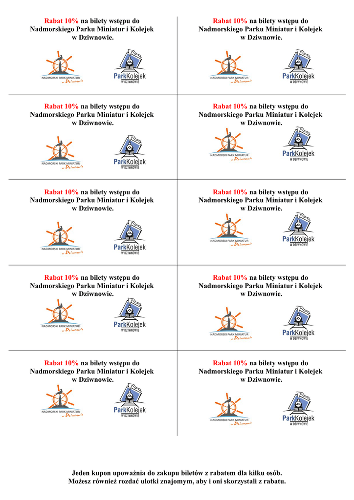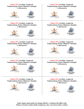 Rabat 10% na bilety wstępu do Nadmorskiego Parku Miniatur i Kolejek w Dziwnowie. Rabat 10% na bilety wstępu do Nadmorskiego Parku Miniatur i Kolejek w Dziwnowie. Rabat 10% na bilety wstępu do Nadmorskiego Parku Miniatur i Kolejek w Dziwnowie. Rabat 10% na bilety wstępu do Nadmorskiego Parku Miniatur i Kolejek w Dziwnowie. Rabat 10% na bilety wstępu do Nadmorskiego Parku Miniatur i Kolejek w Dziwnowie. Rabat 10% na bilety wstępu do Nadmorskiego Parku Miniatur i Kolejek w Dziwnowie. Rabat 10% na bilety wstępu do Nadmorskiego Parku Miniatur i Kolejek w Dziwnowie. Rabat 10% na bilety wstępu do Nadmorskiego Parku Miniatur i Kolejek w Dziwnowie. Rabat 10% na bilety wstępu do Nadmorskiego Parku Miniatur i Kolejek w Dziwnowie. Rabat 10% na bilety wstępu do Nadmorskiego Parku Miniatur i Kolejek w Dziwnowie. Jeden kupon upoważnia do zakupu biletów z rabatem dla kilku osób. Możesz również rozdać ulotki znajomym, aby i oni skorzystali z rabatu.