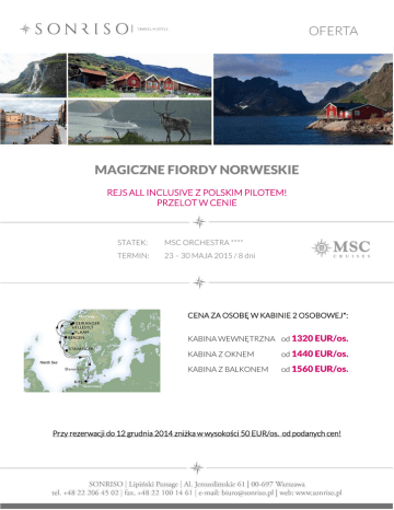MAGICZNE FIORDY NORWESKIE REJS ALL INCLUSIVE Z POLSKIM PILOTEM! PRZELOT W CENIE STATEK: MSC ORCHESTRA **** TERMIN: 23 – 30 MAJA 2015 / 8 dni CENA ZA OSOBĘ W KABINIE 2 OSOBOWEJ*: KABINA WEWNĘTRZNA od 1320 EUR/os. KABINA Z OKNEM od 1440 EUR/os. KABINA Z BALKONEM od 1560 EUR/os. Przy rezerwacji do 12 grudnia 2014 zniżka w wysokości 50 EUR/os. od podanych cen! CENA ZAWIERA: bezpośredni przelot na trasie Warszawa – Hamburg – Warszawa transfery lotnisko – port - lotnisko zakwaterowanie w 2 - os. kabinie wybranej kategorii (kabiny 3-4 os. na zapytanie) pełne wyżywienie na statku: 3 posiłki, przekąski między posiłkami, bufet o północy pakiet napojów ALL INCLUSIVE – napoje alkoholowe i bezalkoholowe bez limitów serwis bagażowy podczas wejścia i zejścia ze statku serwis kabinowy korzystanie z urządzeń sportowo - rekreacyjnych dostępnych na pokładzie (baseny, jacuzzi, boiska sportowe, kluby dla dzieci i młodzieży itp.) udział we wszystkich imprezach organizowanych na pokładzie (przedstawienia, pokazy, aukcje, animacje i inne) obowiązkowe opłaty portowe 120 EUR/os. obowiązkowe napiwki obowiązkowe ubezpieczenie turystyczne na okres trwania wyjazdu opiekę polskiego pilota podczas trwania rejsu DODATKOWE OPŁATY: wycieczki fakultatywne korzystanie z mini baru w kabinie korzystanie z usług typu: SPA, salon piękności, pralnia wydatki osobiste tj. zakupy w butikach, internet, kasyno itp. charytatywna dobrowolna opłata Unicef 1 EUR/os. ewentualna opłata paliwowa (linia w momencie wzrostu cen ropy zastrzega sobie prawo do dodania opłaty paliwowej do każdej rezerwacji) WAŻNE Udział w rejsie wymaga posiadania przez każdego uczestnika ważnego paszportu min. 6 miesięcy Realizacja grupy przy min. 20 osobach. REZERWACJA TEL.: 022 206 45 00 EMAIL: [email protected]