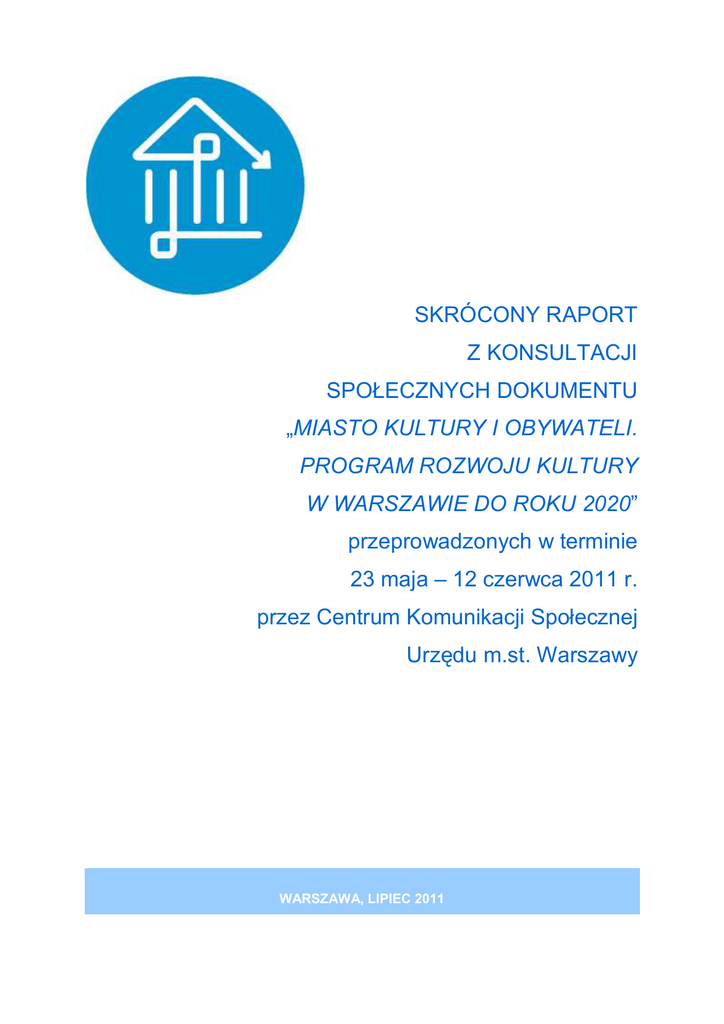 SKRÓCONY RAPORT Z KONSULTACJI SPOŁECZNYCH DOKUMENTU „MIASTO KULTURY I OBYWATELI. PROGRAM ROZWOJU KULTURY W WARSZAWIE DO ROKU 2020” przeprowadzonych w terminie 23 maja – 12 czerwca 2011 r. przez Centrum Komunikacji Społecznej Urzędu m.st. Warszawy WARSZAWA, LIPIEC 2011 W dniach 12 – 23 maja 2011 roku odbyły się konsultacje społeczne dokumentu „Miasto kultury i obywateli. Program rozwoju kultury w Warszawie do roku 2020”, który został napisany przez specjalnie do tego powołany zespół 22 ekspertów reprezentujących różne dziedziny. Pozwoliło to na partycypacyjny sposób tworzenia dokumentu zaś połączenie doświadczeń, umiejętności i wiedzy umożliwiło wypracowanie efektywniejszego Programu. Celem konsultacji było poinformowanie możliwie jak największej liczby osób mieszkających w Warszawie o opracowanym Programie, zapoznanie społeczeństwa z jego celami i założeniami, zawiadomienie o możliwości składania uwag i wniosków do treści dokumentu oraz zebranie opinii i uwag do konsultowanego Programu. Przeprowadzono szeroką akcję informacyjną na stronach internetowych urzędu oraz dzielnic, a także poprzez media, powieszono plakaty w większości instytucji kulturalnych w stolicy, uczelniach wyższych oraz komunikacji miejskiej. Wysyłano również indywidualne zaproszenia do organizacji pozarządowych oraz instytucji kultury. Na początku konsultacji zaś zorganizowano spotkanie informacyjne. Konsultacje społeczne odbyły się poprzez wyłożenie dokumentu Programu do publicznego wglądu oraz zamieszczenie pełnego tekstu dokumentu na platformie internetowej www.konsultacje.um.warszawa.pl przez okres 21 dni. Dokument w formie papierowej został wyłożony w siedzibie Biura Kultury i Europejskiej Stolicy Kultury „Warsztacie” przy pl. Konstytucji. Mieszkańcy mieli możliwość zgłaszania swoich uwag i wniosków na platformie internetowej oraz w miejscach wyłożenia dokumentu w trakcie godzin pracy na specjalnych formularzach. Informacja na ten temat ukazała się na platformie internetowej www.konsultacje.um.warszawa.pl , stronach Dzielnic i plakatach. Dodatkowo przeprowadzono warsztaty konsultacyjne w dniach 2 i 11 czerwca z przedstawicielami organizacji pozarządowych, instytucji oraz mieszkańcami miasta w celu prezentacji dokumentu Programu, a także poznania ich opinii na ten temat. W dwóch warsztatach wzięło udział ok. 35 osób. Z warsztatów powstał osobny raport opracowany przez moderatorów spotkania. Raport zawiera uwagi i opinie indywidualne, jaki i wypracowane w grupach podczas warsztatów. Na zakończenie konsultacji zaproszono uczestników warsztatów, przedstawicieli organizacji pozarządowych oraz instytucji kultury na spotkanie podsumowujące w dniu 28 czerwca w Pałacu Ślubów przy pl. Zamkowym 6, na którym zaprezentowany zostały raport z prac Zespołu Konsultacyjnego. Konsultacje społeczne Programu rozwoju kultury w Warszawie do roku 2020 trwały 21 dni, w ich trakcie zebrano ok. 40 rekomendacji w trakcie warsztatów, 3 wnioski przesłane mailem, 3 wnioski wpisane na platformie internetowej. Dotyczyły one celów głównych programu, a także obszarów: LUDZIE, KREACJA, MIEJSCA, WIZERUNEK, TOŻSAMOŚĆ, Skrócony raport z konsultacji społecznych dokumentu „Miasto kultury i obywateli. Program Rozwoju Kultury w Warszawie do roku 2020” ZARZĄDZANIE. Zespół Konsultacyjny postanowił przedłużyć konsultacje do końca lipca, które skierował do instytucji kultury. Zebrane w trakcie konsultacji wnioski zostały wykorzystane w ostatecznym opracowaniu projektu Programu rozwoju kultury. Autorzy dokumentu odnieśli się do zgłoszonych uwag i wniosków, oraz sporządzili raport zawierający szczegółowe informacje na temat uwzględnionych oraz odrzuconych propozycji zmian – z uzasadnieniem. Raport z prac Zespołu Konsultacyjnego ds. dokumentu „Miasto kultury i obywateli. Program Rozwoju Kultury w Warszawie do roku 2020” nad postulatami zgromadzonymi podczas konsultacji społecznych prowadzonych przez Centrum Komunikacji Społecznej w dniach 23 maja – 12 czerwca 2011r. I. Rekomendacje z pracy grupowej uczestników warsztatów konsultacyjnych dotyczące celów PRK L.p. postulat 1 Najważniejsze jest wspieranie kultury wysokiej, niekomercyjnej. 2 Uwzględniać potrzeby i opinie społeczności lokalnej. 3 Mniejszy nacisk na budowanie wizerunku miasta – należy budować kulturę, a wizerunek się zbuduje na tej podstawie. odpowiedź Zespołu Konsultacyjnego Warszawa ze względu na swoją stołeczność oraz rozmiar musi dbać o rozwój kultury we wszystkich jej aspektach. Uwzględniono poprzez dodanie punktu o włączaniu społeczności lokalnych w proces planowania działań kulturalnych - w obszarze LUDZIE. Za właściwe uznano podejście ujęte w strategicznej diagnozie marki Warszawa, zgodnie, z którym najpierw musi nastąpić pozytywna zmiana, a potem należy oprzeć na niej wizerunek. Jednak wizerunek „nie zbuduje się sam”. Zbudowanie dobrego, opartego na kulturze wizerunku Warszawy jest w interesie zarówno samych mieszkańców (wizerunek = napływ turystów = polepszenie sytuacji gospodarczej) jak tworzących tutaj artystów (władze miasta będą rozumiały wagę ich pracy). Skrócony raport z konsultacji społecznych dokumentu „Miasto kultury i obywateli. Program Rozwoju Kultury w Warszawie do roku 2020” 4 Zrównać dostęp do kultury w różnych dzielnicach. 5 Dbać o jakość kultury – nie tylko wysokiej – w połączeniu z edukacją kulturalną; kontrola tego, co jest finansowane, najlepiej w sposób uspołeczniony. Prowadzić działania duże, na skalę Warszawy, które włączałyby różne dzielnice i nie wzmacniały tylko lokalnych kultur, ale budowały kulturę ogólnowarszawską; zerwanie z kulturą martyrologiczną, włączanie ludzi, kultura przyjmowania ludzi, przybyszów, przyjezdnych, wchłanianie, miasto-port. Poprawić sytuację artystów. 6 7 8 9 10 II. L.p. 1. Uwzgl