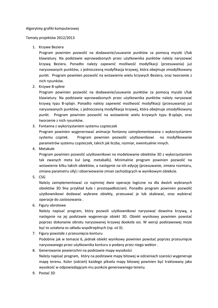 Algorytmy grafiki komputerowej Tematy projektów 2012/2013 1. Krzywe Beziera Program powinien pozwolić na dodawanie/usuwanie punktów za pomocą myszki i/lub klawiatury. Na podstawie wprowadzonych przez użytkownika punktów należy narysować krzywą Beziera. Ponadto należy zapewnić możliwość modyfikacji (przesuwania) już narysowanych punktów, z jednoczesną modyfikacja krzywej, która obejmuje zmodyfikowany punkt. Program powinien pozwolić na wstawienie wielu krzywych Beziera, oraz tworzenie z nich rysunków. 2. Krzywe B-spline Program powinien pozwolić na dodawanie/usuwanie punktów za pomocą myszki i/lub klawiatury. Na podstawie wprowadzonych przez użytkownika punktów należy narysować krzywą typu B-splajn. Ponadto należy zapewnić możliwość modyfikacji (przesuwania) już narysowanych punktów, z jednoczesną modyfikacja krzywej, która obejmuje zmodyfikowany punkt. Program powinien pozwolić na wstawienie wielu krzywych typu B-splajn, oraz tworzenie z nich rysunków. 3. Fontanna z wykorzystaniem systemu cząsteczek Program powinien wygenerować animacje fontanny zaimplementowana z wykorzystaniem systemu cząstek. Program powinien pozwolić użytkownikowi na modyfikowanie parametrów systemu cząsteczek, takich jak liczba, rozmiar, ewentualnie innych. 4. Metakule Program powinien pozwolić użytkownikowi na modelowanie obiektów 3D z wykorzystaniem tak zwanych meta kul (ang. metaballs). Minimalnie program powinien pozwolić na wstawienie kilku takich obiektów, a następnie na ich edycję (przesuwanie, zmiana rozmiaru, zmiana parametru siły) i obserwowanie zmian zachodzących w wynikowym obiekcie. 5. CSG Należy zaimplementować co najmniej dwie operacje logiczne na dla dwóch wybranych obiektów 3D 9na przykład kula i prostopadłościan). Ponadto program powinien pozwolić użytkownikowi dodawać wybrane obiekty, przesuwać je lub skalować, oraz wybierać operacje do zastosowania . 6. Figury obrotowe Należy napisać program, który pozwoli użytkownikowi narysować dowolna krzywą, a następnie na jej podstawie wygeneruje obiekt 3D. Obiekt wynikowy powinien powstać poprzez dokonanie obrotu narysowanej krzywej dookoła osi. W wersji podstawowej może być to ustalona os układu współrzędnych (np. oś X). 7. Figury powstałe z przesunięcia konturu Podobnie jak w temacie 6, jednak obiekt wynikowy powinien powstać poprzez przesunięcie narysowanego przez użytkownika konturu o podany przez niego wektor . 8. Generowanie powierzchni na podstawie mapy wysokości Należy napisać program, który na podstawie mapy bitowej w odcieniach szarości wygeneruje mapę terenu. Kolor (odcień) każdego piksela mapy bitowej powinien być traktowany jako wysokość w odpowiadającym mu punkcie generowanego terenu. 9. Postać 3D Należy zaimplementować prosty szkielet 3D (na przykład zbudowany z „patyczków”) oraz umożliwić użytkownikowi poruszanie nimi. Program powinien pozwolić zapisać do pliku sekwencję takich ruchów oraz odtworzyć ja w postaci prostej animacji. 10. Ruch tekstu po krzywej Należy napisać program pozwalający użytkownikowi narysować dowolną krzywą, wpisać tekst, a następnie na tej podstawie powinna zostać wygenerowana animacja pokazująca ruch wpisanego tekstu po narysowanej krzywej, 11. Przycinanie tekstu do kształtu Należy napisać aplikacje pozwalającą na narysowanie obiektu 2D (np. okręgu, kwadratu), wpisanie lub wczytanie z pliku fragmentu tekstu, a następnie obcięcie tego tekstu do narysowanego kształtu.