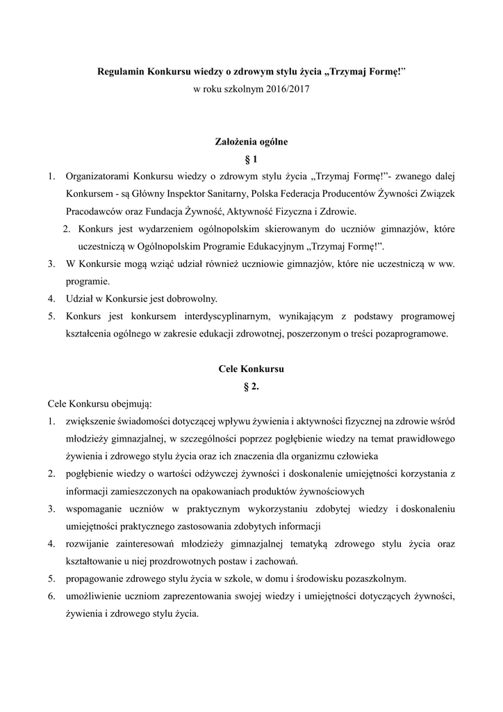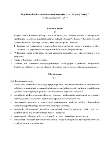 Regulamin Konkursu wiedzy o zdrowym stylu życia „Trzymaj Formę!” w roku szkolnym 2016/2017 Założenia ogólne §1 1. Organizatorami Konkursu wiedzy o zdrowym stylu życia „Trzymaj Formę!”- zwanego dalej Konkursem - są Główny Inspektor Sanitarny, Polska Federacja Producentów Żywności Związek Pracodawców oraz Fundacja Żywność, Aktywność Fizyczna i Zdrowie. 2. Konkurs jest wydarzeniem ogólnopolskim skierowanym do uczniów gimnazjów, które uczestniczą w Ogólnopolskim Programie Edukacyjnym „Trzymaj Formę!”. 3. W Konkursie mogą wziąć udział również uczniowie gimnazjów, które nie uczestniczą w ww. programie. 4. Udział w Konkursie jest dobrowolny. 5. Konkurs jest konkursem interdyscyplinarnym, wynikającym z podstawy programowej kształcenia ogólnego w zakresie edukacji zdrowotnej, poszerzonym o treści pozaprogramowe. Cele Konkursu § 2. Cele Konkursu obejmują: 1. zwiększenie świadomości dotyczącej wpływu żywienia i aktywności fizycznej na zdrowie wśród młodzieży gimnazjalnej, w szczególności poprzez pogłębienie wiedzy na temat prawidłowego żywienia i zdrowego stylu życia oraz ich znaczenia dla organizmu człowieka 2. pogłębienie wiedzy o wartości odżywczej żywności i doskonalenie umiejętności korzystania z informacji zamieszczonych na opakowaniach produktów żywnościowych 3. wspomaganie uczniów w praktycznym wykorzystaniu zdobytej wiedzy i doskonaleniu umiejętności praktycznego zastosowania zdobytych informacji 4. rozwijanie zainteresowań młodzieży gimnazjalnej tematyką zdrowego stylu życia oraz kształtowanie u niej prozdrowotnych postaw i zachowań. 5. propagowanie zdrowego stylu życia w szkole, w domu i środowisku pozaszkolnym. 6. umożliwienie uczniom zaprezentowania swojej wiedzy i umiejętności dotyczących żywności, żywienia i zdrowego stylu życia. Zakres i tematyka Konkursu § 3. 1. Konkurs jest przeznaczony dla uczniów klas I–III gimnazjów zainteresowanych zdobyciem i pogłębianiem wiedzy z zakresu zdrowego stylu życia w szczególności uwzględniającej tematykę zbilansowanej diety i aktywności fizycznej. Uczestnicy konkursu będą mieli możliwość wykazania się na wszystkich jego etapach umiejętnościami i wiedzą wynikającą z podstawy programowej kształcenia ogólnego w zakresie edukacji zdrowotnej na III etapie edukacyjnym, poszerzoną o treści pozaprogramowe. 2. Tematyka konkursu obejmuje: 1) Żywienie zgodne z zasadami zbilansowanej diety: a) grupy produktów żywnościowych i ich wartość odżywcza, b) podstawowe składniki odżywcze i ich rola dla organizmu człowieka, c) dobowe zapotrzebowanie na energię i składniki odżywcze, d) aktualne zalecenia żywieniowe, e) najczęstsze błędy żywieniowe i ich następstwa; 2) Aktywność fizyczna: a) rodzaje aktywności fizycznej, b) znaczenie aktywności fizycznej dla zdrowia, c) wydatek energetyczny przy różnych formach aktywności fizycznej, d) pożądana aktywność fizyczna dla dzieci i młodzieży oraz możliwości jej zwiększenia w życiu codziennym; 3) Wybrane elementy edukacji konsumenckiej: a) prawa konsumenta, b) znakowanie produktów żywnościowych, c) zagadnienia dotyczące ograniczenia marnowania żywności, d) zagadnienia dotyczące prawidłowego postępowania z żywnością. 3. Program merytoryczny Konkursu wiedzy o zdrowym stylu życia „Trzymaj Formę” stanowi załącznik nr 1, natomiast wykaz literatury został określony w załączniku nr 2 do niniejszego Regulaminu. Struktura organizacyjna § 4. 1. Pracami organizacyjnymi i merytorycznymi związanymi z przeprowadzeniem Konkursu kieruje Komitet Organizacyjny powołany przez organizatorów Konkursu z siedzibą w Polskiej Federacji Producentów Żywności Związek Pracodawców, adres: ul. Chałubińskiego 8, 00-613 Warszawa. 2. W skład Komitetu Organizacyjnego wchodzą: 1) Główny Inspektor Sanitarny; 2) Dyrektor Generalny Polskiej Federacji Producentów Żywności Związku Pracodawców; 3. Komitet Organizacyjny powołuje Komisję Konkursową. 4. Komisja Konkursowa odpowiada za przeprowadzenie Konkursu oraz za poziom merytoryczny konkursu, a w szczególności: 1) nadzoruje funkcjonowanie Internetowego Systemu Konkursowego; 2) opracowuje zadania dla poszczególnych etapów Konkursu; 3) przygotowuje klucze odpowiedzi oraz ustala wytyczne dotyczące sprawdzania i oceniania prac, w tym szczegółową punktację za każdy element rozwiązania; 4) ocenia rozwiązania zadań pierwszego, drugiego i trzeciego etapu Konkursu i na ich podstawie kwalifikuje uczestników na poszczególnych etapach konkursu; 5) w ciągu dziesięciu dni po zakończeniu każdego z etapów konkursu przygotowuje protokół z wykazem uczniów zakwalifikowanych do następnego etapu; 6) ustala listę finalistów; 7) ustala listę laureatów; 8) ustala listę zwycięzców. 5. W skład Komisji Konkursowej wchodzą: 1) Przedstawiciel Departamentu Promocji Zdrowia, Biostatystyki i Analiz w Głównym Inspektoracie Sanitarnym; 2) Przedstawiciel Polskiej Federacji Producentów Żywności Związku Pracodawców; 3) Przedstawiciel Wydziału Nauk o Żywieniu Człowieka i Konsumpcji SGGW w Warszawie będącego partnerem Konkursu. 6. Postępowanie Komisji Konkursowej określa załącznik nr 3 do niniejszego Regulaminu. Zgłoszenie do udziału w Konkursie § 5. 1. Warunkiem wzięcia udziału w Konkursie przez uczniów danej szkoły jest prawidłowe zgłoszenie placówki przez dyrektora szkoły do Komitetu Organizacyjnego. 2. Dyrektor zgłaszający szkołę do udziału w Konkursie jest zobowiązany przed dokonaniem zgłoszenia zapoznać uczniów, ich rodziców oraz nauczycieli z Regulaminem. 3. Zgłoszenia dokonuje się za pośrednictwem modułu rejestracji dostępnego w ramach Internetowego Systemu Konkursowego na stronie internetowej Ogólnopolskiego Programu Edukacyjnego „Trzymaj Formę!” – podstrona konkurs.trzymajforme.pl Szkoły zgłaszają się do udziału w konkursie nie później niż os
