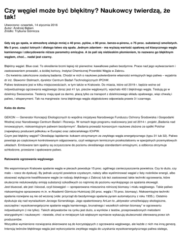 Czy węgiel może być błękitny? Naukowcy twierdzą, że tak! Utworzono: czwartek, 14 stycznia 2016 Autor: Andrzej Bęben Źródło: Trybuna Górnicza Gdy się go spala, w atmosferę ulatuje mniej o 40 proc. pyłów, o 90 proc. benzo-a-pirenu, o 75 proc. substancji smolistych. Ma 5 proc. części lotnych i dlatego łatwo się spala. Jednym zdaniem - ma wyższą wartość opałową od klasycznego węgla kamiennego i zdecydowanie niższe parametry emisyjne. A że pali się niebieskim płomieniem, to nazwano go błękitnym węglem, choć... nadal jest czarny. Błękitny węgiel. Blue coal. To określenie brzmi lepiej niż pierwotne: kawałkowe paliwo bezdymne. Prace nad jego wytwarzaniem i zastosowaniem prowadzi, a ściślej kończy, Instytut Chemicznej Przeróbki Węgla w Zabrzu. - Do kwietnia zakończone zostaną badania. Chodzi w nich o naukowe potwierdzenie własności emisyjnych tego paliwa – wyjaśnia dr inż. Sławomir Stelmach, dyrektor Centrum Badań Technologicznych IPChW. Paliwo testowane jest w kilku miejscowościach, w tym także w Krakowie. Do miasta, które od 2019 r. będzie wolne od indywidualnego ogrzewania węglowego (teraz jest 41 tys. pieców węglowych), wjechało 400 t błękitnego węgla. Testują go w dzielnicy Swoszowice. Testerzy mają opał za darmo, płacą tylko za transport z dzielnicowego składu opałowego, więc chwalą i paliwo, i eksperyment. Tak na marginesie: tona błękitnego węgla objętościowo odpowiada prawie 3 t czarnego. Koks do domu GEKON — Generator Koncepcji Ekologicznych to wspólna inicjatywa Narodowego Funduszu Ochrony Środowiska i Gospodarki Wodnej oraz Narodowego Centrum Badań i Rozwoju. W ramach tego programu realizowany jest od 2014 r. projekt „Badania nad innowacyjnym, niskoemisyjnym paliwem bezdymnym”. Badania prowadzi konsorcjum naukowe złożone ze spółki Polchar (największy producent półkoksu w Europie) oraz zabrzańskiego IChPW. Czym jest błękitny węgiel? Określając lapidarnie: koksem otrzymanym ze zwykłego węgla energetycznego (typu 31 lub 32). Paliwo powstaje po częściowym kontrolowanym odgazowaniu, czyli wstępnym termicznym przekształceniu w specjalnych przemysłowych układach. Emitowane tam spaliny są oczyszczane do poziomu określanego standardami emisyjnymi, a odbiorca otrzymuje schłodzone, przesiane i spakowane paliwo. Ratowanie ogrzewania węglowego We wspomnianym Krakowie spalanie węgla w piecach powoduje 15 proc. ogólnego zanieczyszczenia powietrza. Czy to dużo, czy mało – rzecz do dyskusji. By jednak uczynić powietrze czystszym, należy albo wyeliminować węgiel z listy nośników energii, albo stosować wyłącznie kwalifikowane węgle (w rodzaju błękitnego z Zabrza) lub też zastosować takie techniki ogrzewania, które skutecznie redukowałyby emisję substancji szkodliwych co najmniej do poziomu wynikającego ze spalania ekowęgli. Jest bluecoal, ale jest i biocoal, czyli biowęgiel — spreparowana mieszanina rolniczej biomasy i miału węglowego. Takie paliwo niskoemisyjne opracowano m.in. w Akademii Górniczo-Hutniczej (30 proc. węgla i 70 proc. biomasy). Niskoemisyjne techniki spalania rozwijane są nie od wczoraj (vide: przyrząd do bezdymnego spalania pyram automatyczny z roku 1935.). Ostatnio dyskutuje się nad wynalazkiem Jerzego Sznerskiego. Jego opatentowany AnLen to „aktywator umożliwiający ekologiczne, oszczędne i wysokoenergetyczne spalanie węgla kamiennego, brunatnego i wszelkich odmian biomasy” w ogrzewaniu indywidualnym (i nie tylko). Takich aktywatorów na rynku jest dużo, a wyników z testów, przeprowadzonych metodami wiarygodnymi i naukowymi - niewiele, choć w mniejszym lub większym wymiarze wykazują skuteczność oferowaną przez ich producentów. Wszystkie wymienione rozwiązania skierowane są do korzystających z ogrzewania węglowego, ale każde z nich ma inną genezę. Intencją twórców błękitnego węgla jest wykorzystanie zwykłego węgla do uzyskania wysokoenergetycznego paliwa stałego, którego spalanie spełniałoby coraz ostrzejsze normy środowiskowe. Twórcom biowęgla (kompozytowego paliwa stałego, w skrócie KPS) z AGH przyświecała inna idea: jak wykorzystać miliony ton słomy i miału, by zaspokoić na wsi zapotrzebowanie na węgiel opałowy? Ścieżką wytyczoną przez producentów nowoczesnych kotłów węglowych podążają autorzy różnych dodatków do węgla, czytaj: aktywatorów, chcąc wydusić z nienajwyższej jakości opału, jak najwięcej kalorii i sprawić, by kotły i kominy (i nasze płuca) były czystsze. Zapobiegnie osadzaniu się sadzy w kotle ma kolosalne znaczenie, bo brudna instalacja to mniejsza efektywność energetyczna systemu. Byt kształtuje świadomość Problem w tym, że aktywatory można produkować stosunkowo niskim kosztem, z prywatnym zaangażowaniem. Żeby bluecoal lub KPS weszły do masowej produkcji, to na te paliwa musi być popyt uzasadniający potrzebę przemysłowej produkcji. Jeżeli jednak bluecoal miałby kosztować ok. 1000-1100 zł za tonę, a KPS – 500 zł, to bez wsparcia państwa trudno wyrokować o sukcesie tych paliw, kiedy miał (nie mówiąc o mułach) można kupić znacznie taniej. – Naukowcy wykazali, że można z „brudnego” węgla uzyskać „czystszy”. Blue coal bezdyskusyjnie jest niskoemisyjnym paliwem. Jest rozwiązana również kwestia produkcji. W ciągu roku można wybudować fabrykę i wypuszczać na rynek rocznie ok. 100 tys. takiego paliwa. Owszem, to ułamek tego, co się w Polsce spala. Błękitny węgiel to propozycja przejściowa, na 10-12 lat, do czasu, gdy Polacy staną się bogatsi lub masowo będzie można przyłączać gospodarstwa domowe do sieci ciepłowniczych. Może być z powodzeniem stosowany np. w miejscowościach uzdrowiskowych, w których nie zrezygnowano całkowicie z ogrzewania węglowego. Pozostaje jeszcze jedna kwestia: cena błękitnego węgla. To już jest kwestia biznesu i polityki – konkluduje dr Stelmach. Teoretycz