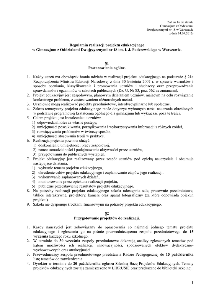 Zał. nr 16 do statutu Gimnazjum z Oddziałami Dwujęzycznymi nr 18 w Warszawie z dnia 14.09.2012r . Regulamin realizacji projektu edukacyjnego w Gimnazjum z Oddziałami Dwujęzycznymi nr 18 im. I. J. Paderewskiego w Warszawie. §1 Postanowienia ogólne. 1. Każdy uczeń ma obowiązek brania udziału w realizacji projektu edukacyjnego na podstawie § 21a Rozporządzenia Ministra Edukacji Narodowej z dnia 30 kwietnia 2007 r. w sprawie warunków i sposobu oceniania, klasyfikowania i promowania uczniów i słuchaczy oraz przeprowadzania sprawdzianów i egzaminów w szkołach publicznych (Dz. U. Nr 83, poz. 562 ze zmianami). 2. Projekt edukacyjny jest zespołowym, planowym działaniem uczniów, mającym na celu rozwiązanie konkretnego problemu, z zastosowaniem różnorodnych metod. 3. Uczniowie mogą realizować projekty przedmiotowe, interdyscyplinarne lub społeczne. 4. Zakres tematyczny projektu edukacyjnego może dotyczyć wybranych treści nauczania określonych w podstawie programowej kształcenia ogólnego dla gimnazjum lub wykraczać poza te treści. 5. Celem projektu jest kształcenie u uczniów: 1) odpowiedzialności za własne postępy, 2) umiejętności poszukiwania, porządkowania i wykorzystywania informacji z różnych źródeł, 3) rozwiązywania problemów w twórczy sposób, 4) umiejętności stosowania teorii w praktyce. 6. Realizacja projektu powinna służyć: 1) doskonaleniu umiejętności pracy zespołowej, 2) nauce samodzielności i podejmowania aktywności przez uczniów, 3) przygotowaniu do publicznych wystąpień. 7. Projekt edukacyjny jest realizowany przez zespół uczniów pod opieką nauczyciela i obejmuje następujące działania: 1) wybranie tematu projektu edukacyjnego, 2) określenie celów projektu edukacyjnego i zaplanowanie etapów jego realizacji, 3) wykonywanie zaplanowanych działań, 4) monitorowanie przez opiekuna realizacji projektu, 5) publiczne przedstawienie rezultatów projektu edukacyjnego. 8. Na potrzeby realizacji projektu edukacyjnego szkoła udostępnia sale, pracownie przedmiotowe, tablice interaktywne, projektory, kamerę oraz aparat fotograficzny (za które odpowiada opiekun projektu). 9. Szkoła nie dysponuje środkami finansowymi na potrzeby projektu edukacyjnego. §2 Przygotowanie projektów do realizacji. 1. Każdy nauczyciel jest zobowiązany do opracowania co najmniej jednego tematu projektu edukacyjnego i zgłoszenia go na piśmie przewodniczącemu zespołu przedmiotowego do 15 września każdego roku szkolnego. 2. W terminie do 30 września zespoły przedmiotowe dokonują analizy zgłoszonych tematów pod kątem możliwości ich realizacji, innowacyjności, spodziewanych efektów dydaktycznowychowawczych oraz atrakcyjności. 3. Przewodniczący zespołu przedmiotowego przedstawia Radzie Pedagogicznej do 15 października listę tematów do zatwierdzenia. 4. Dyrektor w terminie do 20 października ogłasza Szkolną Bazę Projektów Edukacyjnych. Tematy projektów edukacyjnych zostają zamieszczone w LIBRUSIE oraz przekazane do biblioteki szkolnej. 1 §3 Terminy realizacji projektów. Tworzenie grup uczniowskich. 1. Projekty realizowane są przez uczniów klas drugich. 2. Termin realizacji projektów nie powinien przekraczać 3 – 4 miesięcy. 3. Dyrektor Szkoły może zezwolić na realizację projektu uczniowi klasy trzeciej w przypadku: 1) długotrwałej, udokumentowanej choroby ucznia w klasie drugiej, w sytuacji gdy uczeń nie jest zwolniony z realizacji projektu, 2) przyjęcia ucznia z innej szkoły, w której nie realizował projektu. 10 W terminie do 30 października opiekunowie projektów przeprowadzają spotkania z uczniami, udzielając im wskazówek i odpowiadając na pytania. 11 W terminie do 10 listopada uczniowie dokonują wyboru określonego tematu, składając opiekunowi projektu i wychowawcy wspólną pisemną deklarację ze wskazaniem wszystkich członków. 12 Zespół uczniów realizujących dany projekt edukacyjny powinien liczyć nie mniej niż 5 i nie więcej niż 8 uczniów. Dopuszcza się zwiększenie liczebności grupy w przypadku, gdy będzie tego wymagała forma projektu. Ostateczną liczbę członków każdego zespołu ustala opiekun projektu. 13 W przypadku, gdy uczeń: 1) nie zdecyduje o wyborze tematu, 2) nie określi zespołu, z którym będzie realizował projekt, wychowawca w porozumieniu z koordynatorem projektu włącza go do jednego z zespołów. 8. Realizacja projektu zaczyna się od spotkania opiekuna projektu z zespołem uczniowskim, podczas którego ustala się: 1) czas realizacji projektu, 2) formy pracy, zbierania informacji i dokumentowania prac, 3) podział zadań w zespole i zasady współpracy, 4) sposób prezentacji i podsumowania projektu. §4 Zwolnienie ucznia z realizacji projektu. 1. Dyrektor szkoły na pisemny, umotywowany wniosek rodziców (prawnych opiekunów), w uzasadnionych przypadkach może zwolnić ucznia z realizacji projektu. 2. Przyjmuje się, że szczególnie uzasadnionymi przypadkami uprawniającymi do zwolnienia ucznia z realizacji projektu edukacyjnego mogą być: 1) długotrwała nieobecność w szkole spowodowana chorobą, 2) realizacja przez ucznia nauczania indywidualnego, 3) udokumentowane zdarzenia losowe uniemożliwiające pracę w zespole zadaniowym. 3. W sytuacji, o której mowa w ust. 1 na świadectwie w miejscu przeznaczonym na wpisanie informacji o udziale ucznia w realizacji projektu edukacyjnego wpisuje się „zwolniony” albo „zwolniona”. 4. Uczeń, który nie zaliczył projektu a powtarza klasę drugą, obowiązany jest do ponownej realizacji projektu. §5 Zadania wychowawców, opiekunów i koordynatora projektu. 1. Zadania wychowawcy klasy związane z realizacją projektu: 1) poinformowanie do 30 września każdego roku uczniów i ich rodziców (prawnych opiekunów) o warunkach realizacji projektu edukacyjnego na pierwszym w danym roku szkolnym zebraniu z rodzicami. Informacje o projekcie i jego zasadach rodzice uzyskują również poprzez sys