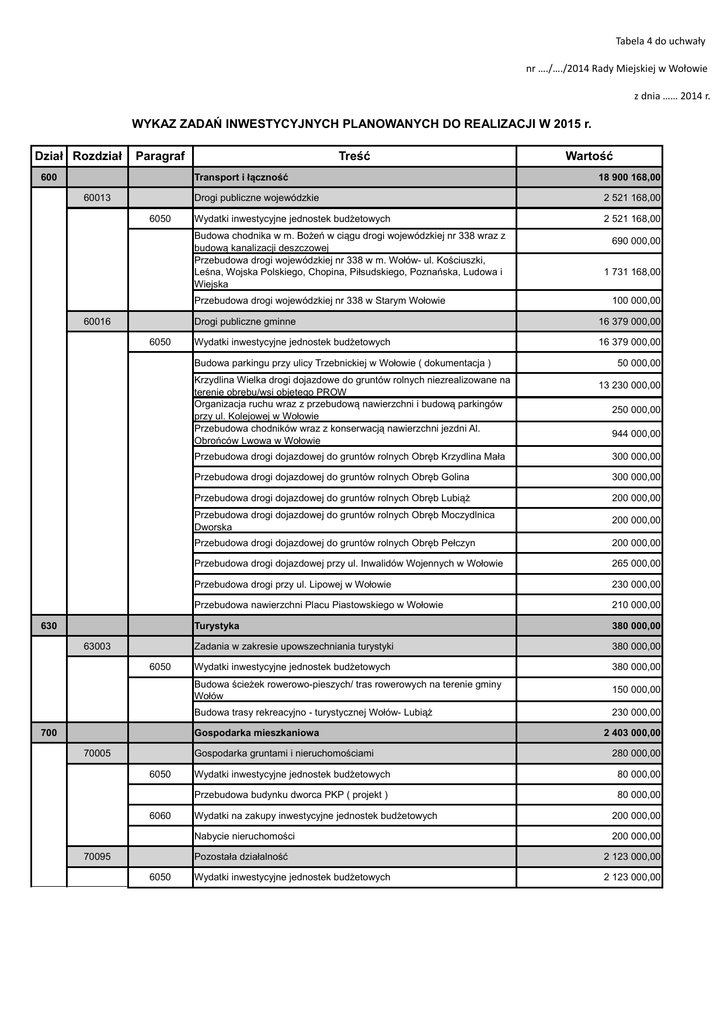 Tabela 4 do uchwały nr …./…./2014 Rady Miejskiej w Wołowie z dnia …… 2014 r. WYKAZ ZADAŃ INWESTYCYJNYCH PLANOWANYCH DO REALIZACJI W 2015 r. Dział Rozdział Paragraf 600 Treść Transport i łączność 60013 6050 2 521 168,00 Wydatki inwestycyjne jednostek budżetowych 2 521 168,00 Przebudowa drogi wojewódzkiej nr 338 w Starym Wołowie 6050 6050 700 16 379 000,00 6060 70095 6050 50 000,00 13 230 000,00 250 000,00 944 000,00 Przebudowa drogi dojazdowej do gruntów rolnych Obręb Krzydlina Mała 300 000,00 Przebudowa drogi dojazdowej do gruntów rolnych Obręb Golina 300 000,00 Przebudowa drogi dojazdowej do gruntów rolnych Obręb Lubiąż 200 000,00 Przebudowa drogi dojazdowej do gruntów rolnych Obręb Moczydlnica Dworska 200 000,00 Przebudowa drogi dojazdowej do gruntów rolnych Obręb Pełczyn 200 000,00 Przebudowa drogi dojazdowej przy ul. Inwalidów Wojennych w Wołowie 265 000,00 Przebudowa drogi przy ul. Lipowej w Wołowie 230 000,00 Przebudowa nawierzchni Placu Piastowskiego w Wołowie 210 000,00 Turystyka 380 000,00 Zadania w zakresie upowszechniania turystyki 380 000,00 Wydatki inwestycyjne jednostek budżetowych 380 000,00 Budowa ścieżek rowerowo-pieszych/ tras rowerowych na terenie gminy Wołów 150 000,00 Budowa trasy rekreacyjno - turystycznej Wołów- Lubiąż 230 000,00 Gospodarka gruntami i nieruchomościami 6050 100 000,00 Wydatki inwestycyjne jednostek budżetowych Gospodarka mieszkaniowa 70005 1 731 168,00 16 379 000,00 Krzydlina Wielka drogi dojazdowe do gruntów rolnych niezrealizowane na terenie obrębu/wsi objętego PROW Organizacja ruchu wraz z przebudową nawierzchni i budową parkingów przy ul. Kolejowej w Wołowie Przebudowa chodników wraz z konserwacją nawierzchni jezdni Al. Obrońców Lwowa w Wołowie 63003 690 000,00 Drogi publiczne gminne Budowa parkingu przy ulicy Trzebnickiej w Wołowie ( dokumentacja ) 630 18 900 168,00 Drogi publiczne wojewódzkie Budowa chodnika w m. Bożeń w ciągu drogi wojewódzkiej nr 338 wraz z budową kanalizacji deszczowej Przebudowa drogi wojewódzkiej nr 338 w m. Wołów- ul. Kościuszki, Leśna, Wojska Polskiego, Chopina, Piłsudskiego, Poznańska, Ludowa i Wiejska 60016 Wartość 2 403 000,00 280 000,00 Wydatki inwestycyjne jednostek budżetowych 80 000,00 Przebudowa budynku dworca PKP ( projekt ) 80 000,00 Wydatki na zakupy inwestycyjne jednostek budżetowych 200 000,00 Nabycie nieruchomości 200 000,00 Pozostała działalność 2 123 000,00 Wydatki inwestycyjne jednostek budżetowych 2 123 000,00 Kompleksowa termomodernizacja budynków gminnych: Publiczne Gimnazjum w Wołowie, Przedszkole " Chatka Puchatka" w Wołowie, budynki OSIR przy ul. Trzebnickiej w Wołowie, budynek Ratusza w Wołowie Przebudowa budynku z przeznaczeniem na mieszkania socjalne w miejscowości Mojęcice- Kąty 750 75023 6060 801 80195 6050 900 90001 6050 90003 6060 90095 6050 921 92109 6050 926 92601 633 000,00 Administracja publiczna 106 000,00 Urzędy gmin (miast i miast na prawach powiatu) 106 000,00 Wydatki na zakupy inwestycyjne jednostek budżetowych 106 000,00 Zakup sprzętu i wyposażenia na potrzeby Urzędu Miejskiego w Wołowie 106 000,00 Oświata i wychowanie 812 000,00 Pozostała działalność 812 000,00 Wydatki inwestycyjne jednostek budżetowych 712 000,00 Likwidacja barier architektonicznych 250 000,00 Remont i modernizacja pomieszczeń kuchennych w Przedszkolu nr 2 Słoneczko w Wołowie Remont parkingu oraz nawierzchni przy Publicznym Gimnazjum nr 1 w Wołowie Remont pomieszczeń (sal dla dzieci) w budynku przedszkola Zespołu Szkół Publicznych w Lubiążu 6060 1 490 000,00 50 000,00 150 000,00 100 000,00 Remont pomieszczeń przedszkolnych (sal dla dzieci) w Przedszkolu nr 2 Słoneczko w Wołowie 80 000,00 Remont schodów wewnętrznych - dokończenie zadania w Przedszkolu nr 2 Słoneczko w Wołowie 22 000,00 Wykonanie ogrodzenia Szkoły Podstawowej w Warzęgowie 50 000,00 Wymiana tablicy rozdzielczej w Szkole Podstawowej w Starym Wołowie 10 000,00 Wydatki na zakupy inwestycyjne jednostek budżetowych 100 000,00 Zakup sprzętu kuchennego w ramach wyposażenia kuchni przedszkolnych 50 000,00 Zakup wyposażenia (meble) do jednostek oświatowych 50 000,00 Gospodarka komunalna i ochrona środowiska 59 000,00 Gospodarka ściekowa i ochrona wód 30 000,00 Wydatki inwestycyjne jednostek budżetowych 30 000,00 Sieć kanalizacyjna i wodociągowa dla Gminy Wołów- uzupełnienia i przyłączenia obiektów gminnych ( dokumentacja ) 30 000,00 Oczyszczanie miast i wsi 24 000,00 Wydatki na zakupy inwestycyjne jednostek budżetowych 24 000,00 Zakup kosiarki biajkowej dla sołectwa Boraszyn 3 500,00 Zakup kosiarki dla sołectwa Straszowice 3 500,00 Zakup kosiarki samojezdnej dla sołectwa Uskorz Mały 6 000,00 Zakup kosiarki samojezdnej dla sołectwa Warzęgowo 11 000,00 Pozostała działalność 5 000,00 Wydatki inwestycyjne jednostek budżetowych 5 000,00 Zakup i montaż monitoringu na terenie sołectwa Lubiąż 5 000,00 Kultura i ochrona dziedzictwa narodowego 6 000,00 Domy i ośrodki kultury, świetlice i kluby 6 000,00 Wydatki inwestycyjne jednostek budżetowych 6 000,00 Zakup i montaż klimatyzacji dla sołectwa Krzydlina Wielka 6 000,00 Kultura fizyczna 740 800,00 Obiekty sportowe 735 800,00 6050 92605 6050 Wydatki inwestycyjne jednostek budżetowych 735 800,00 Budowa obiektów rekreacji i sportu na działce nr 7 AM-27 w Wołowie 700 000,00 Doposażenie placu zabaw w sołectwie Zagórzyce 7 000,00 Wyposażenie placu zabaw dla sołectwa Stary Wołów 5 000,00 Zakup altanki - wiaty dla sołectwa Bożeń 5 000,00 Zakup i montaż zestawu do fitness dla sołectwa Pełczyn 6 800,00 Zakup wiaty dla sołectwa Sławowice 6 000,00 Zakup wiaty dla sołectwa Tarchalice 6 000,00 Zadania w zakresie kultury fizycznej 5 000,00 Wydatki inwestycyjne jednostek budżetowych 5 000,00 Zakup bramek na boisko sportowe w sołectwie Stary Wołów 5 000,00 Razem: 23 406 968,00