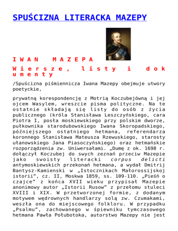 SPUŚCIZNA LITERACKA MAZEPY I W A N M A Z E P A W i e r s z e , u m e n t y l i s t y i d o k /Spuścizna piśmiennicza Iwana Mazepy obejmuje utwory poetyckie, prywatną korespondencję z Motrią Koczubejówną i jej ojcem Wasylem, wreszcie pisma polityczne. Na te ostatnie składają się listy do osób z życia publicznego (króla Stanisława Leszczyńskiego, cara Piotra I, posła moskiewskiego przy polskim dworze, pułkownika starodubowskiego Iwana Skoropadskiego, późniejszego ostatniego hetmana, referendarza koronnego Stanisława Mateusza Rzewuskiego, starosty ułanowskiego Jana Piasoczyńskiego) oraz hetmańskie rozporządzenia zw. Uniwersałami. „Dumę z ok. 1698 r. dołączył Koczubej do swych zeznań przeciw Mazepie jako swoisty literacki corpus delicti antymoskiewskich przekonań hetmana, a wydał Dmitrij Bantysz-Kamienski w „Istocznikach Małorossijskoj istorii”, cz. II, Moskwa 1859, ss. 109-110. „Pieśń o czajce” z końca XVII wieku przypisał Mazepie anonimowy autor „Istorii Rusow” z przełomu stuleci XVIII i XIX. W przetworzonej formie, z dodanym motywem wędrownych handlarzy solą zw. Czumakami, weszła ona do miejscowego folkloru. W przypadku „Psalmu”, zachowanego w śpiewniku tymczasowego hetmana Pawła Połubotoka, autorstwo Mazepy nie jest bezsporne, ale wskazywałyby na nie pewne cechy stylistyczne. Wiersz o Iwanie Samojłowiczu przytoczył w swej kronice „Letopis sobytij w JugoZapadnoj Rossii”Samojło Wełyczko, podając, że powstał on po obaleniu hetmana, a więc w roku 1687, w kręgu jego najbliższych współpracowników. A jedyną osobą z tego grona piszącą wiersze był Mazepa. Przekłady trech pierwszuch utworów dokonałem w oparciu o: Iwan Mazepa „Pysannja”, Krakiw-Lwiw 1943, a czwartego na podstawie publikacji „Iwan Mazepa”, Kyjiw 1992. Również listy miłosne do Motrii wykorzystane zostały jako załą cznik do donosu jej ojca, a wydał je wspomniany Dmitrij BantyszKamienski. Ja tłumaczę je za podaną wyżej edycją pism Mazepy. List do Stanisława Leszczyńskiego oraz korespondencję z Wasylem Koczubejem przytaczam za Aleksandrem Przeździeckim (Atenaeum, t. I, Wilno 1842, ss. 37-40), a listy pomiędzy Mazepą a carem Piotrem I za Janem Nepomucenem Czarnowskim „Ukraina i Zaporoże czyli Historia Kozaków”, t. II, Warszawa 1854, ss. 214-217. Tłumaczenie listu do Iwana Skoropadskiego dokonane zostało na podstawie wzmiankowanej publikacji „Iwan Mazepa”./ D U M A Choć pokoju wszyscy pragną, To w rzędzie jednym nie staną! Ten na prawo, ów na lewo, A braćmi się ponoć zowią! Brak morale, brak i zgody Już od Żółtej wszakże Wody. Wiele przez to straciliśmy, Samych siebie zgubiliśmy. Ej, bracia, czas się przekonać, Że nie wszem dano panować. Nie wszyscy mogą mędrkować I tym światem zawiadywać. Gdy na okręt popatrzymy Wielu ludzi zobaczymy, Lecz wszystkim sternik kieruje I okrętem nawiguje. Pszczoły też swą matkę mają I jej to jednej słuchają. Boże, użal się nad nami, Że jedności wciąż nie znamy! Jeden lgnie do bisurmanów I przyzywa Tomanów! Na ratunek przybywajmy Zginąć Matce swej nie dajmy! Drugi Lachom nadskakuje, Choć ojczyzny swej żałuje. Matko moja uwielbiona! Czemuś taka osłabiona? W różne strony Cię szarpali Turkom po Dniepr darowali. W tym fortelu stawka cała, Byś w końcu bez tchu ostała! Trzeci Moskwie już hołduje I jej wiernie usługuje. Ten na Matkę swą się skarży, Że niewolą synów darzy: Lepiej było nie urodzić Niźli w takiej biedzie płodzić! Zewsząd przeciw nam coś knują, Ogniem, mieczem wciąż rujnują. Znikąd nie ma życzliwości, Ni zwykłej sprawiedliwości. Kmiotkami nas nazywają, A takich wszak za nic mają. Czemuś nas nie uprzedziła, Czemuś braci porzuciła? Lepiej było nam spróbować Wspólnie całe zło pokonać! Ja sam przecież nie podołam, Chyba tylko tak zawołam: Hej, panowie atamani, Czemuście tacy niemrawi? Wy panowie pułkownicy Dajcie spokój polityce, Razem chwyćcie się za ręce, Nie dozwólcie srogiej męce Matki Waszej dalej gnębić! Idźcie więc z wrogami się bić! Samopały nabijajcie, Ostrych szabel dobywajcie! A choć za wiarę zginiecie, To swobodę zdobędziecie: Niechaj wieczna będzie chwała, Że nam szabla prawa dała!… Pieśń o czajce – niebodze Oj, biada, biada Czajce – niebodze, Że uwiła sobie gniazdo Przy samej drodze!… Stęku!…Stęku!… Lecąc w przestworzu, Runie jak kamień, Utonie w morzu!… Stęku!… Żyto dojrzało, Lato nastało, Wnet żeńcy przyjdą żąć Co ma z dziećmi począć… Stęku!…Stęku!… Lecąc w przestworzu, Runie jak kamień, Utonie w morzu!… Stęku!… Czajka się miota, Skrzydłem trzepota! Na próżno jej latać, Na próżno jej płakać! Stęku!…Stęku!… Lecąc w przestworzu, Runie jak kamień, Utonie w morzu! Stęku!… Jakże nie ma płakać? Jakże nie ma latać? Małe pisklątka, To jej dzieciątka! Stęku!…Stęku!… Lecąc w przestworzu, Runie jak kamień, Utonie w morzu!… Stęku!… Oj, dzieci, dzieci, Gdzie się schronicie? Czy mam się utopić, Czy z rozpaczy zabić? Stęku!…Stęku!… Lecąc w przestworzu, Runie jak kamień, Utonie w morzu! Stęku!… P S A L M Bieda moja głowę gniecie, Bom sierota na tym świecie; Nie mam mamy, nie mam taty, W pieszczoty jam niebogaty. Przytulę się do Jezusa, On mi ociec i mamusia. To mi radość i pociecha, Że się zbędę wszego licha. Ale licha dola wszędzie, Bo nienawiść żywią ludzie. Ni spokoju, ni radości, Jeno smutki i żałości. Jeden drugiego upomina, A sam o czci zapomina. Ja o to jednak nie staję, Bo na Jezusa się zdaję; Ten w niedoli mi doradzi, Z wrogami sobie poradzi. On mi nie dozwoli polec, Ani smutkom w pełni ulec. Teraz prawda za nic stoi, Za to fałsz się w cnotę stroi; Teraz jest miłości mało, Bo na świecie zło nastało. Boże, spraw, by nas kochano, A Twe imię wysławiano, Aż na Ostatecznym Sądzie Światłość Twa ujrzaną będzie