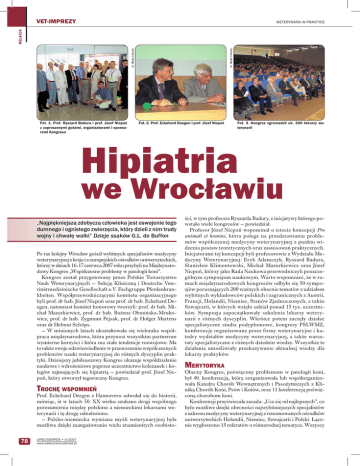 VET-IMPREZY Fot. 1. Prof. Ryszard Badura i prof. Józef Nicpoń z zaproszonymi gośćmi, organizatorami i sponsorami Kongresu fot. Monika Cukiernik fot. Monika Cukiernik RELACJA WETERYNARIA W PRAKTYCE Fot. 2. Prof. Eckehard Deegen i prof. Józef Nicpoń Fot. 3. Kongres zgromadził ok. 300 lekarzy weterynarii Hipiatria we Wrocławiu „Najpiękniejszą zdobyczą człowieka jest oswojenie tego dumnego i ognistego zwierzęcia, który dzieli z nim trudy wojny i chwałę walki” Dzieje ssaków G.L. de Buffon Po raz kolejny Wrocław gościł wybitnych specjalistów medycyny weterynaryjnej z kraju i z europejskich ośrodków uniwersyteckich, którzy w dniach 16-17 czerwca 2007 roku przybyli na Międzynarodowy Kongres „Współczesne problemy w patologii koni”. Kongres został przygotowany przez Polskie Towarzystwo Nauk Weterynaryjnych – Sekcję Kliniczną i Deutsche Veterinärmedizinische Gesellschaft e.V. Fachgruppe Pferdenkrankheiten. Współprzewodniczącymi komitetu organizacyjnego byli prof. dr hab. Józef Nicpoń oraz prof. dr hab. Eckehard Deegen, natomiast komitet honorowy tworzyli: prof. dr hab. Michał Mazurkiewicz, prof. dr hab. Bożena Obmińska-Mrukowicz, prof. dr hab. Zygmunt Pejsak, prof. dr Holger Martens oraz dr Helmut Schöps. – W minionych latach ukształtowała się wieloraka współpraca międzynarodowa, która przynosi wszystkim partnerom wymierne korzyści i która ma stałe tendencje rozwojowe. Ma to także swoje odzwierciedlenie w przenoszeniu współczesnych problemów nauki weterynaryjnej do różnych dyscyplin praktyki. Dzisiejszy jubileuszowy Kongres ukazuje współdziałanie naukowe i wdrożeniowe poprzez uczestnictwo koleżanek i kolegów zajmujących się hipiatrią – powiedział prof. Józef Nicpoń, który otworzył tegoroczny Kongres. TROCHĘ WSPOMNIEŃ Prof. Eckehard Deegen z Hannoveru odwołał się do historii, mówiąc, iż w latach 50. XX wieku szukano drogi wspólnego porozumienia między polskimi a niemieckimi lekarzami weterynarii i tę drogę odnaleziono. – Polsko-niemiecka wymiana myśli weterynaryjnej była możliwa dzięki zaangażowaniu wielu znamienitych osobisto- 78 LIPIEC-SIERPIEŃ • 4/2007 www.weterynaria.elamed.pl ści, w tym profesora Ryszarda Badury, z inicjatywy którego powstało wiele kongresów – powiedział. Profesor Józef Nicpoń wspominał o istocie koncepcji Pro animali et homine, która polega na przedstawianiu problemów współczesnej medycyny weterynaryjnej z punktu widzenia postaw teoretycznych oraz zastosowań praktycznych. Inicjatorami tej koncepcji byli profesorowie z Wydziału Medycyny Weterynaryjnej: Eryk Adamczyk, Ryszard Badura, Stanisław Klimentowski, Michał Mazurkiewicz oraz Józef Nicpoń, którzy jako Rada Naukowa przewodniczyli poszczególnym sympozjom naukowym. Warto wspomnieć, że w ramach międzynarodowych kongresów odbyło się 50 sympozjów poruszających 200 ważnych obecnie tematów z udziałem wybitnych wykładowców polskich i zagranicznych z Austrii, Francji, Holandii, Niemiec, Stanów Zjednoczonych, a także Szwajcarii, w których wzięło udział ponad 15 tys. uczestników. Sympozja zapoczątkowały szkolenia lekarzy weterynarii z różnych dyscyplin. Wkrótce potem zaczęły działać specjalistyczne studia podyplomowe, kongresy PSLWMZ, konferencje organizowane przez firmy weterynaryjne i katedry wydziałów medycyny weterynaryjnej, a także warsztaty specjalistyczne z różnych dziedzin wiedzy. Wszystkie te działania umożliwiały przekazywanie aktualnej wiedzy dla lekarzy praktyków. MERYTORYKA Obecny Kongres, poświęcony problemom w patologii koni, był 40. konferencją, którą zorganizowała lub współorganizowała Katedra Chorób Wewnętrznych i Pasożytniczych z Kliniką Chorób Koni, Psów i Kotów, oraz 11 konferencją poświęconą chorobom koni. Konferencji przyświecała zasada: „Ucz się od najlepszych”, co było możliwe dzięki obecności najwybitniejszych specjalistów z zakresu medycyny weterynaryjnej z renomowanych ośrodków uniwersyteckich Holandii, Niemiec, Szwajcarii i Polski. Łącznie wygłoszono 15 referatów o różnorodnej tematyce. Wszyscy VET-IMPREZY prelegenci zaprezentowali wysoki poziom referatów, trafność ich doboru, wszechstronność oraz kompleksowość przedstawionych zagadnień. WYSTAWCY W sympozjum wzięło udział około 300 lekarzy weterynarii, a wystawcy zaprezentowali leki, instrumenty, aparaturę i inne urządzenia, które przydatne są lekarzom weterynarii w ich codziennej praktyce. Organizatorzy stworzyli w ten sposób dogodne warunki do nawiązywania kontaktów pomiędzy praktykującymi lekarzami i firmami. Głównymi sponsorami przedsięwzięcia był Boehringer Ingelheim i Vétoquinol Biowet. Oprócz nich sponsorami były także takie firmy, jak: Sigmed, Pavo-Stopa, Laboklin, Gierth, Novartis, Multi-Bank, International Publishing Service, VetZ, dr Fritz oraz Biowet (Drwalew). PODZIĘKOWANIA Redakcja „Weterynarii w Praktyce” dziękuje za możliwość uczestnictwa w Kongresie i kieruje słowa uznania do współprzewodniczących i wszystkich organizatorów, którzy swoim wielkim zaangażowaniem przyczynili się do realizacji tak potrzebnego i ciekawego tematycznie Kongresu. Konferencja wskazała kierunki rozwiązań istotnych problemów w zakresie nowoczesnych technik diagnostyki chorób koni oraz stosowanych obecnie metod ich leczenia. Zorganizowane spotkanie towarzyskie na terenie wrocławskiego Ogrodu Zoologicznego stało się ważnym miejscem wymiany poglądów, doskonalenia wiedzy i spotkań wszystkich, którzy w swej codziennej praktyce zajmują się hipiatrią. Stawy koni wymagają regularnej i stałej opieki. LubriSyn to zapewnia. WETERYNARIA W PRAKTYCE Opracowany przez lekarzy weterynarii LubriSyn jest opatentowanym doustnym suplementem kwasu hialuronowego (HA) dla koni w postaci żelu. Codzienne podawanie preparatu LubriSyn pozwala uniknąć wahań stężenia kwasu hialuronowego w surowicy krwi, co ma miejsce podcza