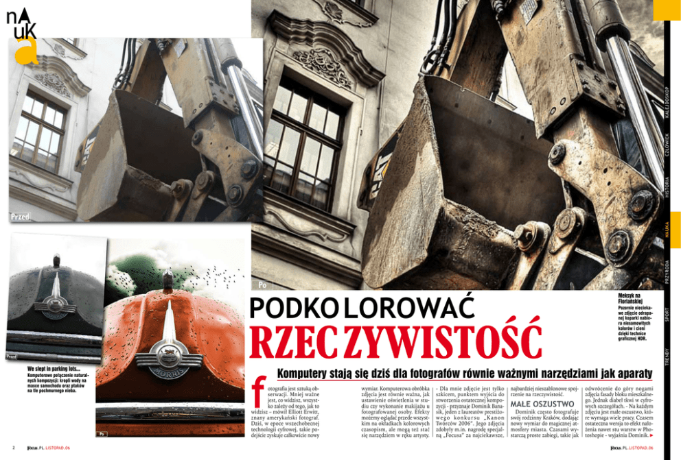 KALEJDOSKOP CZŁOWIEK HISTORIA PRZYRODA NAUKA Przed Po Podkolorować We slept in parking lots... SPORT Komputery stają się dziś dla fotografów równie ważnymi narzędziami jak aparaty Komputerowe połączenie naturalnych kompozycji: kropli wody na masce samochodu oraz ptaków na tle pochmurnego nieba. Po .PL.LISTOPAD.06 Pozornie nieciekawe zdjęcie odrapanej koparki nabiera niesamowitych kolorów i cieni dzięki technice graficznej HDR. TRENDY rzeczywistość f Przed Meksyk na Floriańskiej otografia jest sztuką obserwacji. Mniej ważne jest, co widzisz, wszystko zależy od tego, jak to widzisz – mówił Elliott Erwitt, znany amerykański fotograf. Dziś, w epoce wszechobecnej technologii cyfrowej, takie podejście zyskuje całkowicie nowy wymiar. Komputerowa obróbka zdjęcia jest równie ważna, jak ustawienie oświetlenia w studiu czy wykonanie makijażu u fotografowanej osoby. Efekty możemy oglądać przede wszystkim na okładkach kolorowych czasopism, ale mogą też stać się narzędziem w ręku artysty. - Dla mnie zdjęcie jest tylko szkicem, punktem wyjścia do stworzenia ostatecznej kompozycji - przyznaje Dominik Banasik, jeden z laureatów prestiżowego konkursu „Kanon Twórców 2006”. Jego zdjęcia zdobyły m.in. nagrodę specjalną „Focusa” za najciekawsze, najbardziej nieszablonowe spojrzenie na rzeczywistość. Małe oszustwo Dominik często fotografuje swój rodzinny Kraków, dodając nowy wymiar do magicznej atmosfery miasta. Czasami wystarczą proste zabiegi, takie jak odwrócenie do góry nogami zdjęcia fasady bloku mieszkalnego. Jednak diabeł tkwi w cyfrowych szczegółach. - Na każdym zdjęciu jest małe oszustwo, które wymaga wiele pracy. Czasem ostateczna wersja to efekt nałożenia nawet stu warstw w Photoshopie - wyjaśnia Dominik. 4 .PL.LISTOPAD.06 Przed 4Jego zdjęcia często są podko- lorowywane. Inne zabiegi to wmontowywanie obiektów lub tła w kadr czy zmienianie wyglądu powierzchni obiektów. Ten ostatni efekt można osiągnąć za pomocą techniki HDR (high dynamic range), często wykorzystywanej przez Dominika. Widać to chociażby na wyróżnionym przez „Focusa” zdjęciu z koparką zatytułowanym „Meksyk na Floriańskiej”. HDR polega na wykonaniu kilku zdjęć tego samego kadru z różnymi ustawieniami ekspozycji: jedno zdjęcie może być poprawne, drugie prześwietlone, trzecie niedoświetlone itd. Nakładając je na siebie w komputerze można uzyskać obraz, na którym widać zarówno grę świateł, jak i detale albo przyciągający uwagę układ cieni. Zdjęcia nabierają wówczas głębi i nierzeczywistego charakteru. Bilie Jean meets Cracow Początek ulicy Szerokiej w żydowskiej dzielnicy Kazimierz po podkolorowaniu wygląda jak scenografia z filmu „Amelia”. Po Dominik Banasik, laureat konkursu „Kanon Twórców”, z wykształcenia jest informatykiem foto na blogu Jednak komputery pozwalają dziś artystom nie tylko na obrabianie obrazu, ale również na prezentowanie go innym. Początkujący fotograf nie musi ograniczać się do grona znajomych czy organizować wystawy w domu kultury. Wystarczy zarejestrować się w jednym z internetowych serwisów do udostępniania zdjęć, gdzie zaglądają artyści i zwykli internauci z całego świata. Prace Dominika można znaleźć w słynnym Flickr.com, gdzie występuje on pod pseudonimem dElay. Nie kryje, że zamierza zajmować się fotografią i cyfrowym obrazem także profesjonalnie. - Chciałbym spróbować współpracy z jakimś wydawnictwem czy agencją reklamową - mówi. Trzymamy kciuki. Przed Turbo Opium Zabawy montażem: zwielokrotnione anteny, kamery i domofony plus samotnie tocząca się opona. Jan Stradowski Dla głodnych wiedzy Fotoblog Dominika Banasika – www.flickr.com/photos/delay Strona konkursu Kanon Twórców – www.kanontworcow.pl Więcej o technice fotograficznej HDR – www.wiecek.biz/technika_hdr_-_high_dynamic_range.html .PL.LISTOPAD.06 Po