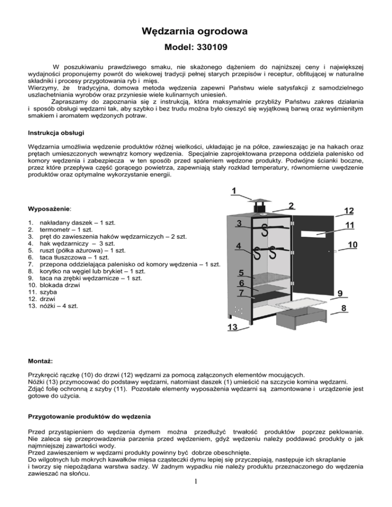 Wędzarnia ogrodowa Model: 330109 W poszukiwaniu prawdziwego smaku, nie skażonego dążeniem do najniższej ceny i największej wydajności proponujemy powrót do wiekowej tradycji pełnej starych przepisów i receptur, obfitującej w naturalne składniki i procesy przygotowania ryb i mięs. Wierzymy, że tradycyjna, domowa metoda wędzenia zapewni Państwu wiele satysfakcji z samodzielnego uszlachetniania wyrobów oraz przyniesie wiele kulinarnych uniesień. Zapraszamy do zapoznania się z instrukcją, która maksymalnie przybliży Państwu zakres działania i sposób obsługi wędzarni tak, aby szybko i bez trudu można było cieszyć się wyjątkową barwą oraz wyśmienitym smakiem i aromatem wędzonych potraw. Instrukcja obsługi Wędzarnia umożliwia wędzenie produktów różnej wielkości, układając je na półce, zawieszając je na hakach oraz prętach umieszczonych wewnątrz komory wędzenia. Specjalnie zaprojektowana przepona oddziela palenisko od komory wędzenia i zabezpiecza w ten sposób przed spaleniem wędzone produkty. Podwójne ścianki boczne, przez które przepływa część gorącego powietrza, zapewniają stały rozkład temperatury, równomierne uwędzenie produktów oraz optymalne wykorzystanie energii. Wyposażenie: 1. 2. 3. 4. 5. 6. 7. 8. 9. 10. 11. 12. 13. nakładany daszek – 1 szt. termometr – 1 szt. pręt do zawieszenia haków wędzarniczych – 2 szt. hak wędzarniczy – 3 szt. ruszt (półka ażurowa) – 1 szt. taca tłuszczowa – 1 szt. przepona oddzielająca palenisko od komory wędzenia – 1 szt. korytko na węgiel lub brykiet – 1 szt. taca na zrębki wędzarnicze – 1 szt. blokada drzwi szyba drzwi nóżki – 4 szt. Montaż: Przykręcić rączkę (10) do drzwi (12) wędzarni za pomocą załączonych elementów mocujących. Nóżki (13) przymocować do podstawy wędzarni, natomiast daszek (1) umieścić na szczycie komina wędzarni. Zdjąć folię ochronną z szyby (11). Pozostałe elementy wyposażenia wędzarni są zamontowane i urządzenie jest gotowe do użycia. Przygotowanie produktów do wędzenia Przed przystąpieniem do wędzenia dymem można przedłużyć trwałość produktów poprzez peklowanie. Nie zaleca się przeprowadzenia parzenia przed wędzeniem, gdyż wędzeniu należy poddawać produkty o jak najmniejszej zawartości wody. Przed zawieszeniem w wędzarni produkty powinny być dobrze obeschnięte. Do wilgotnych lub mokrych kawałków mięsa cząsteczki dymu lepiej się przyczepiają, następuje ich skraplanie i tworzy się niepożądana warstwa sadzy. W żadnym wypadku nie należy produktu przeznaczonego do wędzenia zawieszać na słońcu. 1 Wędzenie: 1. Otworzyć drzwi wędzarni. 2. Umieścić w komorze wędzenia wcześniej przygotowane produkty. Większe i dłuższe (np. węgorze) zaleca się zawiesić na prętach w górnej części komory lub przy użyciu haków wędzarniczych tak, aby się ze sobą nie stykały. Zapobiegnie to nierównomiernemu uwędzeniu produktów. Mniejsze zaleca się ułożyć na ruszcie tak, aby w jak najmniejszym stopniu miały kontakt ze ściankami. Dzięki temu potrawa nie będzie przylegała do ścian i uwędzoną będzie łatwiej wyciągnąć z wędzarni. 3. Wysunąć z komory paleniskowej korytko (8), rozpalić w nim węgiel lub brykiet drzewny umieścić z powrotem w komorze. i po rozżarzeniu 4. Na dole komory, nad paleniskiem umieścić tacę (9) z równomiernie rozłożonymi zrębkami wędzarniczymi a nad nią tacę tłuszczową (6). Aby uzyskać smaczny i zdrowy produkt, dym wędzarniczy musi spełniać określone kryteria. O powstaniu specyficznego jego składu decydują ostatecznie użyte gatunki drewna i temperatura spalania. Dlatego najlepiej kupować sprawdzone i odpowiednio oczyszczone zrębki wędzarnicze. Przy stosowaniu niewłaściwego gatunku drewna w uwędzonych produktach może pojawić się nawet smak smoły. Obecnie najpopularniejsze są zrębki pochodzące z naturalnego drewna: buku, olch, czereśni czy jabłoni. W skutek połączenia dymu, mięsa i przypraw powstaje odpowiedni aromat wędzenia. Zrębki przed wędzeniem zaleca się zwilżyć wodą, aby ich spalanie i jednoczesne wytwarzanie dymu trwało dłużej. W momencie kiedy potrawy przybiorą pożądaną barwę złotożółtą / złotobrązową zaprzestajemy dokładania zrębków do procesu wędzenia. 5. Zamknąć wędzarnię. Proces wędzenia zostaje rozpoczęty. Uwaga: Podczas całego procesu wędzenia należy kontrolować temperaturę w wędzarni – co ułatwi zamontowany termometr (2). W zależności od temperatury proponujemy Państwu następujące metody wędzenia: wędzenie zimne Odbywa się ono w temperaturze od 8 do 25ºC i powoduje najsilniejsze schnięcie wędzonek, wymaga również długiego czasu. Powinno być ono przeprowadzane z przerwami, w kilku fazach. Jedna faza wędzenia trwa zwykle 5-12 godzin. Między fazami następuje wietrzenie (ok. 5 godzin), mające na celu doprowadzenie świeżego powietrza. Powoduje to dodatkowe obsuszanie wędzonek, a także tworzenie się odpowiedniego aromatu. W zależności od produktu cały proces wędzenia na zimno składa się z 3 – 5 faz. Metodę tą stosuje się do wędzenia kiełbas surowych i wyrobów surowych po peklowaniu (głównie na sucho). Wyroby przygotowywane w ten sposób są trwałe, smaczne i można przechowywać je bardzo długo. Należy pamiętać aby odbywało się to w chłodnym, zaciemnionym i przewiewnym miejscu. Produkty nie powinny stykać się ze sobą, należy je również chronić przed kurzem i światłem. wędzenie ciepłe Tym sposobem wędzi się przede wszystkim wyroby parzone i gotowane. Jest to wędzenie w temperaturze od 24 do 60ºC. Przeprowadza się je bez przerw przez ok. 24 godziny, dlatego w pomieszczeniu wędzarniczym temperatura musi być podtrzymywana przez dodatkowe źródło ogrzewania (np.: elektryczne). Sam proces spalania materiału drzewnego nie wystarcza do zachowania odpowiednich warunków termicznych. wędzen