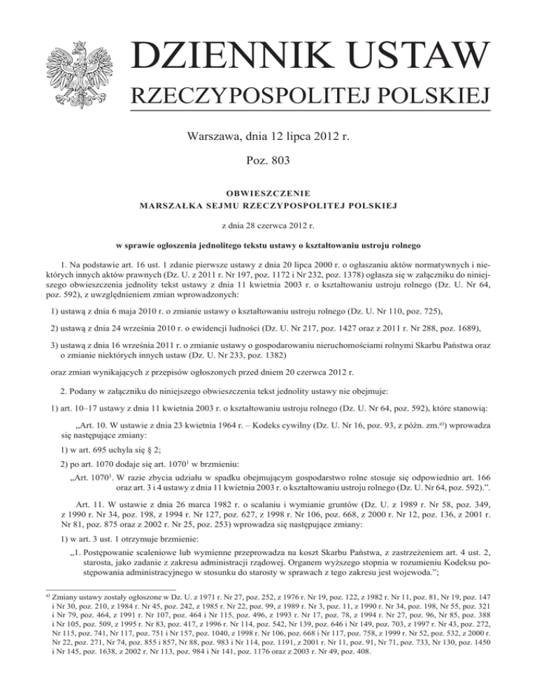 DZIENNIK USTAW RZECZYPOSPOLITEJ POLSKIEJ Warszawa, dnia 12 lipca 2012 r. Poz. 803 OBWIESZCZENIE MARSZAŁKA SEJMU RZECZYPOSPOLITEJ POLSKIEJ z dnia 28 czerwca 2012 r. w sprawie ogłoszenia jednolitego tekstu ustawy o kształtowaniu ustroju rolnego 1. Na podstawie art. 16 ust. 1 zdanie pierwsze ustawy z dnia 20 lipca 2000 r. o ogłaszaniu aktów normatywnych i niektórych innych aktów prawnych (Dz. U. z 2011 r. Nr 197, poz. 1172 i Nr 232, poz. 1378) ogłasza się w załączniku do niniejszego obwieszczenia jednolity tekst ustawy z dnia 11 kwietnia 2003 r. o kształtowaniu ustroju rolnego (Dz. U. Nr 64, poz. 592), z uwzględnieniem zmian wprowadzonych: 1) ustawą z dnia 6 maja 2010 r. o zmianie ustawy o kształtowaniu ustroju rolnego (Dz. U. Nr 110, poz. 725), 2) ustawą z dnia 24 września 2010 r. o ewidencji ludności (Dz. U. Nr 217, poz. 1427 oraz z 2011 r. Nr 288, poz. 1689), 3) ustawą z dnia 16 września 2011 r. o zmianie ustawy o gospodarowaniu nieruchomościami rolnymi Skarbu Państwa oraz o zmianie niektórych innych ustaw (Dz. U. Nr 233, poz. 1382) oraz zmian wynikających z przepisów ogłoszonych przed dniem 20 czerwca 2012 r. 2. Podany w załączniku do niniejszego obwieszczenia tekst jednolity ustawy nie obejmuje: 1) art. 10–17 ustawy z dnia 11 kwietnia 2003 r. o kształtowaniu ustroju rolnego (Dz. U. Nr 64, poz. 592), które stanowią: „Art. 10. W ustawie z dnia 23 kwietnia 1964 r. – Kodeks cywilny (Dz. U. Nr 16, poz. 93, z późn. zm.a)) wprowadza się następujące zmiany: 1) w art. 695 uchyla się § 2; 2) po art. 1070 dodaje się art. 10701 w brzmieniu: „Art. 10701. W razie zbycia udziału w spadku obejmującym gospodarstwo rolne stosuje się odpowiednio art. 166 oraz art. 3 i 4 ustawy z dnia 11 kwietnia 2003 r. o kształtowaniu ustroju rolnego (Dz. U. Nr 64, poz. 592).”. Art. 11. W ustawie z dnia 26 marca 1982 r. o scalaniu i wymianie gruntów (Dz. U. z 1989 r. Nr 58, poz. 349, z 1990 r. Nr 34, poz. 198, z 1994 r. Nr 127, poz. 627, z 1998 r. Nr 106, poz. 668, z 2000 r. Nr 12, poz. 136, z 2001 r. Nr 81, poz. 875 oraz z 2002 r. Nr 25, poz. 253) wprowadza się następujące zmiany: 1) w art. 3 ust. 1 otrzymuje brzmienie: „1. Postępowanie scaleniowe lub wymienne przeprowadza na koszt Skarbu Państwa, z zastrzeżeniem art. 4 ust. 2, starosta, jako zadanie z zakresu administracji rządowej. Organem wyższego stopnia w rozumieniu Kodeksu postępowania administracyjnego w stosunku do starosty w sprawach z tego zakresu jest wojewoda.”; a) Zmiany ustawy zostały ogłoszone w Dz. U. z 1971 r. Nr 27, poz. 252, z 1976 r. Nr 19, poz. 122, z 1982 r. Nr 11, poz. 81, Nr 19, poz. 147 i Nr 30, poz. 210, z 1984 r. Nr 45, poz. 242, z 1985 r. Nr 22, poz. 99, z 1989 r. Nr 3, poz. 11, z 1990 r. Nr 34, poz. 198, Nr 55, poz. 321 i Nr 79, poz. 464, z 1991 r. Nr 107, poz. 464 i Nr 115, poz. 496, z 1993 r. Nr 17, poz. 78, z 1994 r. Nr 27, poz. 96, Nr 85, poz. 388 i Nr 105, poz. 509, z 1995 r. Nr 83, poz. 417, z 1996 r. Nr 114, poz. 542, Nr 139, poz. 646 i Nr 149, poz. 703, z 1997 r. Nr 43, poz. 272, Nr 115, poz. 741, Nr 117, poz. 751 i Nr 157, poz. 1040, z 1998 r. Nr 106, poz. 668 i Nr 117, poz. 758, z 1999 r. Nr 52, poz. 532, z 2000 r. Nr 22, poz. 271, Nr 74, poz. 855 i 857, Nr 88, poz. 983 i Nr 114, poz. 1191, z 2001 r. Nr 11, poz. 91, Nr 71, poz. 733, Nr 130, poz. 1450 i Nr 145, poz. 1638, z 2002 r. Nr 113, poz. 984 i Nr 141, poz. 1176 oraz z 2003 r. Nr 49, poz. 408. Dziennik Ustaw –2– Poz. 803 2) w art. 4 w ust. 1 pkt 1 otrzymuje brzmienie: „1) grunty Zasobu Własności Rolnej Skarbu Państwa, których powierzchnia przekracza 10% projektowanego obszaru scalenia i nie mogą być racjonalnie zagospodarowane bez scalenia,”; 3) w art. 5: a) ust. 1 otrzymuje brzmienie: „1. Jeżeli do racjonalnego ukształtowania gruntów wchodzących w skład gospodarstw rolnych zachodzi potrzeba zmiany ich położenia w drodze wzajemnej wymiany, wymiana taka może być dokonana na zgodny wniosek właścicieli tych gruntów, a w przypadku gruntów Zasobu Własności Rolnej Skarbu Państwa – za zgodą Agencji. Wymianą mogą być objęte również grunty z zabudowaniami.”, b) ust. 3 otrzymuje brzmienie: „3. W przypadku wymiany gruntów z zabudowaniami wartość budynków określa się według wyceny dokonanej przez rzeczoznawcę majątkowego na zasadach określonych w przepisach o gospodarce nieruchomościami, chyba że strony uzgodnią inne zasady rozliczeń.”; 4) w art. 8: a) ust. 5–7 otrzymują brzmienie: „5. Dopłaty uczestnikom scalenia są wypłacane ze środków powiatu jednorazowo, w terminie dwóch miesięcy po zakończeniu scalenia. 6. Uczestnik scalenia zobowiązany do dopłaty uiszcza ją w terminie dwóch miesięcy po zakończeniu scalenia, na rachunek powiatu. 7. Dopłaty między uczestnikami wymiany są regulowane bezpośrednio między nimi.”, b) dodaje się ust. 8 i 9 w brzmieniu: „8. Na wniosek uczestników postępowania scaleniowego grunty Zasobu Własności Rolnej Skarbu Państwa objęte postępowaniem mogą, za zgodą Agencji, zostać w całości lub w części rozdysponowane za dopłaty na rzecz uczestników postępowania. 9. Do należności Agencji z tytułu dopłat stosuje się przepisy o gospodarowaniu nieruchomościami rolnymi Skarbu Państwa dotyczące sprzedaży nieruchomości rolnych.”; 5) w art. 9 ust. 3 otrzymuje brzmienie: „3. W przypadku niedokonania wyboru rady uczestników scalenia w terminie określonym przez starostę funkcję tej rady sprawuje powołany postanowieniem tego organu zespół, w skład którego wchodzi rada sołecka, sołtys oraz przedstawiciel Agencji będącej uczestnikiem scalenia oraz przedstawiciel społeczno-zawodowych organizacji rolników; w przypadku gdy postępowaniem scaleniowym objęto grunty więcej niż jednej wsi, w skład zespołu wchodzą sołtysi tych wsi, przedstawiciele rad sołeckich po jednym z każdej wsi, przedstawiciel Agencji będącej uczestnikiem scalenia oraz przedstawiciel społeczno-zawodowych 