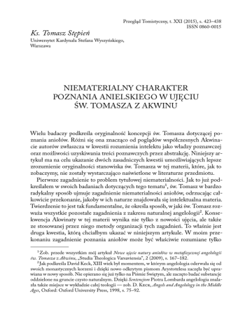 Przegląd Tomistyczny, t. XXI (2015), s. 423–438 ISSN 0860-0015 Ks. Tomasz Stępień Uniwersytet Kardynała Stefana Wyszyńskiego, Warszawa NIEMATERIALNY CHARAKTER POZNANIA ANIELSKIEGO W UJĘCIU ŚW. TOMASZA Z AKWINU Wielu badaczy podkreśla oryginalność koncepcji św. Tomasza dotyczącej poznania aniołów. Różni się ona znacząco od poglądów współczesnych Akwinacie autorów zwłaszcza w kwestii rozumienia intelektu jako władzy poznawczej oraz możliwości uzyskiwania treści poznawczych przez abstrakcję. Niniejszy artykuł ma na celu ukazanie dwóch zasadniczych kwestii umożliwiających lepsze zrozumienie oryginalności stanowiska św. Tomasza w tej materii, które, jak to zobaczymy, nie zostały wystarczająco naświetlone w literaturze przedmiotu. Pierwsze zagadnienie to problem tytułowej niematerialności. Jak to już podkreślałem w swoich badaniach dotyczących tego tematu¹, św. Tomasz w bardzo radykalny sposób ujmuje zagadnienie niematerialności aniołów, odrzucając całkowicie przekonanie, jakoby w ich naturze znajdowała się intelektualna materia. Twierdzenie to jest tak fundamentalne, że określa sposób, w jaki św. Tomasz rozważa wszystkie pozostałe zagadnienia z zakresu naturalnej angelologii². Konsekwencja Akwinaty w tej materii wynika nie tylko z nowości ujęcia, ale także ze stosowanej przez niego metody organizacji tych zagadnień. To właśnie jest druga kwestia, którą chciałbym ukazać w niniejszym artykule. W moim przekonaniu zagadnienie poznania aniołów może być właściwie rozumiane tylko ¹ Zob. przede wszystkim mój artykuł Nowe ujęcie natury aniołów w metafizycznej angelologii św. Tomasza z Akwinu, „Studia Theologica Varsaviensia”, 2 (2009), s. 167–182. ² Jak podkreśla David Keck, XIII wiek był momentem, w którym angelologia oderwała się od swoich monastycznych korzeni i dzięki nowo odkrytym pismom Arystotelesa zaczęła być uprawiana w nowy sposób. Nie opierano się już tylko na Piśmie Świętym, ale zaczęto badać substancje oddzielone na gruncie czysto naturalnym. Dzięki Sentencjom Piotra Lombarda angelologia znalazła także miejsce w wykładzie całej teologii — zob. D. Keck, Angels and Angelology in the Middle Ages, Oxford: Oxford University Press, 1998, s. 75–92. 424 KS. TOMASZ STĘPIEŃ w kontekście całej nauki o substancjach oddzielonych. Przedstawienie zagadnienia poznania anielskiego w tym kontekście pozwala dostrzec, że św. Tomasz nie proponuje własnych rozwiązań w poszczególnych kwestiach niejako w oderwaniu od całości traktatu, ale że wypracowanie tych rozwiązań jest możliwe właśnie dzięki ustaleniu metafizycznego pryncypium i konsekwentnemu odnoszeniu do niego kolejnych problemów. 1. Istota, władza, działanie Metodologia, którą św. Tomasz stosuje, podejmując problem aniołów, jest widoczna we wstępach do poszczególnych traktatów. We fragmentach Summy, w których przedstawia on zagadnienia związane z rozumieniem Boga, anioła i człowieka, odwołuje się do podziału na substancję (substantia), władze (potentiae) i działania (operationes). Taka kolejność rozważanych zagadnień miała przed św. Tomaszem długą historię, która sięga samego Arystotelesa. W swoim traktacie O duszy po próbie zdefiniowania tego, czym dusza jest, i krótkim przedstawieniu rodzajów duszy Stagiryta przechodzi do omawiania władz, stwierdzając: „Kto zamierza studiować te [formy duszy], ten musi najpierw odkryć istotę (ti estin) każdej z nich, a dopiero potem badać w ten sam sposób ich właściwości i inne tym podobne rzeczy”³. Pisząc dalej o działaniu, Arystoteles zwraca uwagę, że ponieważ działania wyprzedzają władze w porządku poznania, to aby móc powiedzieć coś o władzach, najpierw należy poznać przedmioty działań i same działania⁴. Zatem już u Stagiryty rysuje się niejasno ów podział, przy czym w porządku poznawczym jest on odwrotny, ponieważ najpierw postrzegamy działanie, a dopiero później możemy wnioskować o władzy i istocie. Metodologia zaproponowana przez Arystotelesa była niewątpliwie decydująca, lecz nie dociera ona do św. Tomasza w czystej postaci. Podział na istotę, władze i działanie był bowiem niezwykle popularny wśród pogańskich neoplatoników. W Enneadach Plotyn wykorzystuje go, by opisać proces pochodzenia wszystkich rzeczy z Jednego⁵. Porfiriusz posługiwał się zaś tym podziałem, opisując obecność duszy w ciele⁶. Jednak dla naszych rozważań najważniejszy ³ Arysoteles, O duszy, II, 4, 415a (Aristotle, De anima, red. W.D. Ross, Oxford: Clarendon Press, 1961; Arystoteles, Dzieła wszystkie, t. III, tłum. P. Siwek, Warszawa: PWN, 2003). ⁴ Zob. tamże. ⁵ Jeden z najbardziej znaczących fragmentów, w których Plotyn to czyni, to Enneady, IV, 8, 7 (Plotini, Enneades, t. II, red. P. Henry, H.R. Schwyzer, Paris – Bruxelles: Desclée de Brouwer, 1959; Plotyn, Enneady, tłum. A. Krokiewicz, Warszawa: Akme, 2000). ⁶ Jego koncepcję przedstawiam w moim opracowaniu: Pseudo-Dionizy Areopagita, chrześcijanin i platonik. Polemiczne aspekty pism „Corpus Dionysiacum” w kontekście mowy św. Pawła na Areopagu (Dz 17, 22–31), Warszawa: Fronda, 2010, s. 302–306. POZNANIE ANIELSKIE W UJĘCIU ŚW. TOMASZA Z AKWINU 425 jest fakt, że Pseudo-Dionizy Areopagita przejął to rozróżnienie od swoich pogańskich poprzedników i za pomocą terminów: istota (ousia), władza (dynamis) i działanie (energeia) wprowadził podział chórów i stopni w hierarchii anielskiej⁷. Święty Tomasz z Akwinu w najbardziej klarowny sposób wykorzystuje ów schemat w traktacie o człowieku z Summy teologii. We wstępie powołuje się właśnie na Pseudo-Dionizego Areopagitę, pisząc: „A ponieważ Dionizy, w 11 rozdziale O hierarchii niebiańskiej, wyróżnia w substancjach duchowych trzy rzeczy, mianowicie ich istotę, władzę i działanie, dlatego najpierw poruszymy problem istoty duszy, potem prz