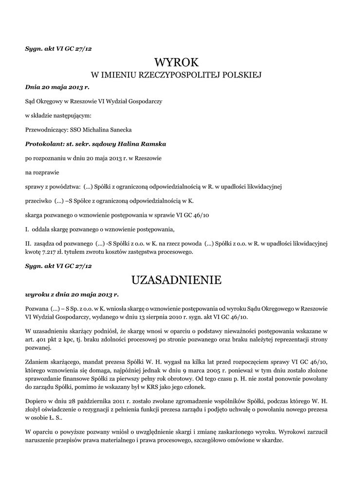 Sygn. akt VI GC 27/12 WYROK W IMIENIU RZECZYPOSPOLITEJ POLSKIEJ Dnia 20 maja 2013 r. Sąd Okręgowy w Rzeszowie VI Wydział Gospodarczy w składzie następującym: Przewodniczący: SSO Michalina Sanecka Protokolant: st. sekr. sądowy Halina Ramska po rozpoznaniu w dniu 20 maja 2013 r. w Rzeszowie na rozprawie sprawy z powództwa: (...) Spółki z ograniczoną odpowiedzialnością w R. w upadłości likwidacyjnej przeciwko (...) –S Spółce z ograniczoną odpowiedzialnością w K. skarga pozwanego o wznowienie postępowania w sprawie VI GC 46/10 I. oddala skargę pozwanego o wznowienie postępowania, II. zasądza od pozwanego (...) -S Spółki z o.o. w K. na rzecz powoda (...) Spółki z o.o. w R. w upadłości likwidacyjnej kwotę 7.217 zł. tytułem zwrotu kosztów zastępstwa procesowego. Sygn. akt VI GC 27/12 UZASADNIENIE wyroku z dnia 20 maja 2013 r. Pozwana (...) – S Sp. z o.o. w K. wniosła skargę o wznowienie postępowania od wyroku Sądu Okręgowego w Rzeszowie VI Wydział Gospodarczy, wydanego w dniu 13 sierpnia 2010 r. sygn. akt VI GC 46/10. W uzasadnieniu skarżący podniósł, że skargę wnosi w oparciu o podstawy nieważności postępowania wskazane w art. 401 pkt 2 kpc, tj. braku zdolności procesowej po stronie pozwanego oraz braku należytej reprezentacji strony pozwanej. Zdaniem skarżącego, mandat prezesa Spółki W. H. wygasł na kilka lat przed rozpoczęciem sprawy VI GC 46/10, którego wznowienia się domaga, najpóźniej jednak w dniu 9 marca 2005 r. ponieważ w tym dniu zostało złożone sprawozdanie finansowe Spółki za pierwszy pełny rok obrotowy. Od tego czasu p. H. nie został ponownie powołany do zarządu Spółki, pomimo że wskazany był w KRS jako jego członek. Dopiero w dniu 28 października 2011 r. zostało zwołane zgromadzenie wspólników Spółki, podczas którego W. H. złożył oświadczenie o rezygnacji z pełnienia funkcji prezesa zarządu i podjęto uchwałę o powołaniu nowego prezesa w osobie Ł. S.. W oparciu o powyższe pozwany wniósł o uwzględnienie skargi i zmianę zaskarżonego wyroku. Wyrokowi zarzucił naruszenie przepisów prawa materialnego i prawa procesowego, szczegółowo omówione w skardze. W stosunku do powodowej Spółki została orzeczona upadłość likwidacyjna postanowieniem Sądu Rejonowego w Rzeszowie Wydział V Gospodarczy – Sekcja ds. upadłościowych i naprawczych z dnia 25 października 2011 r. sygn. akt V GU 32/11. Pismem procesowym z dnia 5 listopada 2012 r. Syndyk Masy Upadłości powodowej Spółki oświadczył, że przystępuje do niniejszego postępowania i złożył odpowiedź na skargę. Syndyk Masy Upadłości powoda wniósł o odrzucenie lub oddalenie skargi uzasadniając, że od dnia 7 marca 2002 r. tj. od wpisania spółki do KRS figurował jako prezes W. H.. Jego mandat wygasł dopiero po złożeniu przez niego rezygnacji z funkcji członka zarządu. Z wpisu do KRS wynika, że były składane sprawozdania finansowe za okresy od 2. 2002 r. do 31 grudnia 2002 r. od 1 stycznia 2003 r. do 31 grudnia 2003 r. od 1 stycznia 2004 r. do 31 grudnia 2004 r. Ponieważ nie zapadła uchwała wspólników zatwierdzająca sprawozdanie za 2002 r. mandat W. H. nie wygasł. Sąd ustalił co następuje: Powodowa Spółka została zawarta aktem założycielskim w dniu 12 grudnia 2001 r. Uchwałą z pierwszego Zgromadzenia Wspólników został powołany jednoosobowy zarząd w osobie W. H., który został ujawniony w KRS. Kadencja zarządu nie została określona. Prezes W. H. reprezentował powodową Spółkę, podejmował decyzje w imieniu Spółki, składał do akt sprawozdania finansowe. Należy zauważyć, że Zgromadzenie Wspólników w dniu 28 października 2011 r. na którym prezes H. zrezygnował z funkcji prezesa i członka zarządu Spółki było przez niego zwołane i prowadzone. W czasie trwania postępowania VI GC 46/10 W. H. jako członek zarządu – prezes ustanowił pełnomocnika, który reprezentował interesy powodowej Spółki. W trakcie postępowania nigdy nie podał zarzutu braku zdolności procesowej oraz braku należytej reprezentacji Spółki. Twierdzenie skarżącego, że mandat prezesa Spółki wygasł najpóźniej 9 marca 2005 r. jest bezzasadne. W twierdzeniach swoich skarżący jest niekonsekwentny ; jeżeli bowiem mandat prezesa Spółki wygasł w 2005 r. to nie mógł on skutecznie w 2011 r. zwołać Zgromadzenia Wspólników, na którym zrezygnował z członkostwa w Spółce, a nowym prezesem został wybrany Ł. S.. Uchwały te byłyby sprzeczne z umową i godziłyby w interesy Spółki. Sąd zważył co następuje : Zgodnie z art. 401 pkt 2 kpc można żądać wznowienia postępowania z powodu nieważności , jeżeli strona nie miała zdolności sądowej lub procesowej albo nie była należycie reprezentowana bądź jeżeli wskutek naruszenia przepisów prawa była pozbawiona możliwości działania. Nie może jednak żądać wznowienia, jeżeli przed uprawomocnieniem się wyroku niemożność działania ustała lub brak reprezentacji był podniesiony w drodze zarzutu albo strona potwierdziła dokonane czynności procesowe. Jak wykazano wyżej, w sprawie nie zachodzą przesłanki wynikające z art. 401 pkt 2 kpc do wznowienia postępowania i Sąd skargę oddalił. O kosztach orzeczono w myśl art. 98 § 1 kpc. zarządzenie : - odpis wyroku z uzasadnieniem doręczyć pełn. skarżącego.