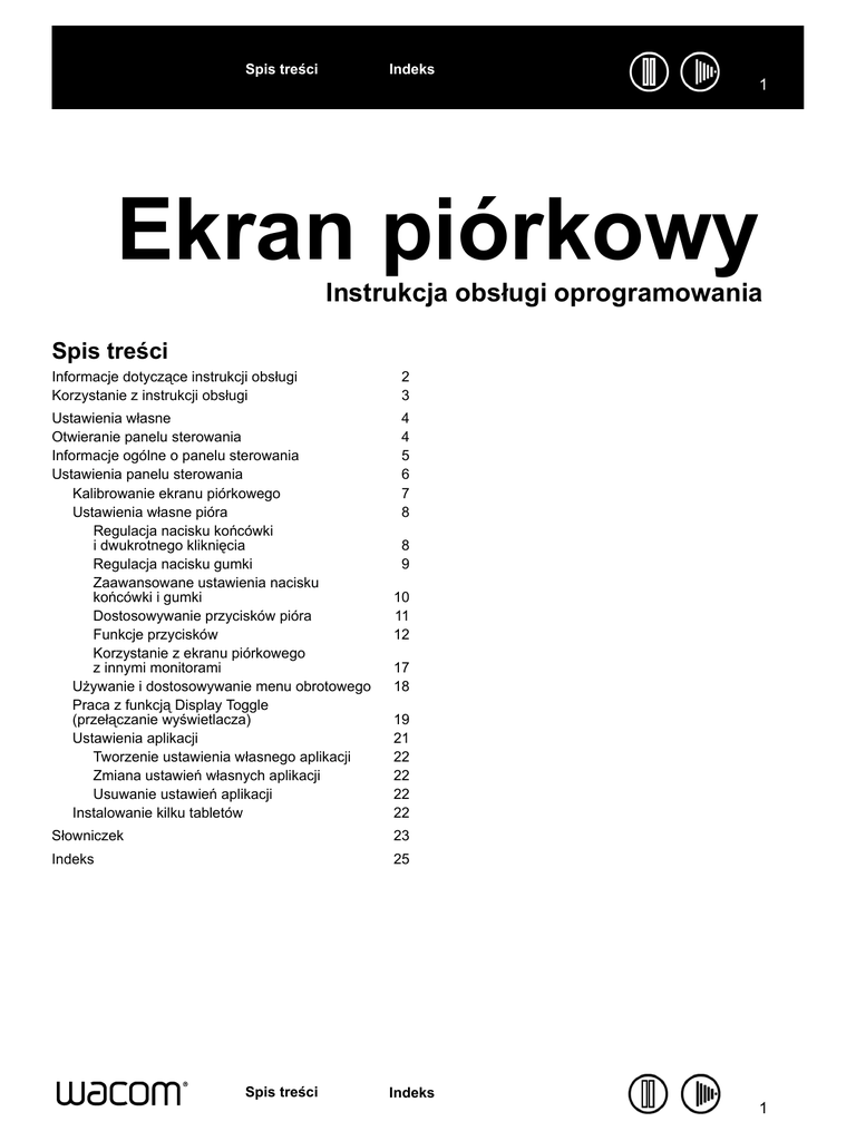 Spis treści Indeks 1 Ekran piórkowy Instrukcja obsługi oprogramowania Spis treści Informacje dotyczące instrukcji obsługi Korzystanie z instrukcji obsługi 2 3 Ustawienia własne Otwieranie panelu sterowania Informacje ogólne o panelu sterowania Ustawienia panelu sterowania Kalibrowanie ekranu piórkowego Ustawienia własne pióra Regulacja nacisku końcówki i dwukrotnego kliknięcia Regulacja nacisku gumki Zaawansowane ustawienia nacisku końcówki i gumki Dostosowywanie przycisków pióra Funkcje przycisków Korzystanie z ekranu piórkowego z innymi monitorami Używanie i dostosowywanie menu obrotowego Praca z funkcją Display Toggle (przełączanie wyświetlacza) Ustawienia aplikacji Tworzenie ustawienia własnego aplikacji Zmiana ustawień własnych aplikacji Usuwanie ustawień aplikacji Instalowanie kilku tabletów 4 4 5 6 7 8 10 11 12 Słowniczek 23 Indeks 25 Spis treści 8 9 17 18 19 21 22 22 22 22 Indeks 1 Spis treści Indeks 2 Informacje dotyczące instrukcji obsługi Niniejszy dokument umożliwia szybki dostęp do informacji dotyczących ekranu piórkowego. Kliknięcie przycisku nawigacji lub podkreślonego słowa umożliwia przemieszczanie się po dokumencie. Podane informacje dotyczą zarówno systemu operacyjnego Windows, jak i komputerów Macintosh. Przedstawione obrazy pochodzą z systemu Windows, o ile nie wskazano inaczej. Uwaga: Podręcznik nie zawiera informacji na temat instalacji ekranu piórkowego. Szczegółowe informacje na temat instalowania tabletu można znaleźć w instrukcji instalacji produktu. Użytkownicy nie mający doświadczenia w pracy z dokumentacją elektroniczną powinni zapoznać się z częścią Korzystanie z instrukcji obsługi. • Dla wyróżnienia nazw klawiszy, okien dialogowych oraz opcji panelu sterowania użyto kursywy. • Podgląd instrukcji na ekranie można zawsze powiększyć, korzystając z narzędzia powiększania w przeglądarce. • Niniejsza publikacja nie uwzględnia następujących informacji: informacje na temat szczegółów sprzętu komputerowego lub systemu operacyjnego, a także informacje na temat używanych aplikacji. Najpewniejszym źródłem tego typu informacji są instrukcje oraz nośniki dostarczane wraz ze sprzętem, systemem operacyjnym lub aplikacją. • Wiele aplikacji graficznych ma wbudowaną obsługę funkcji ekranu piórkowego (np. czułość nacisku). Listę aplikacji obsługujących te funkcje można znaleźć w witrynie internetowej firmy Wacom. W celu uzyskania informacji na temat prawidłowego wykorzystywania funkcji ekranu piórkowego w poszczególnych aplikacjach należy odwołać się do instrukcji obsługi danej aplikacji. Filozofia firmy Wacom opiera się na ciągłej poprawie wszystkich swoich produktów. W rezultacie, co pewien czas dokonywane są zmiany i ulepszenia inżynieryjne. W związku z taką sytuacją, niektóre zmiany, modyfikacje i ulepszenia mogą nie być opisane w tym dokumencie. Spis treści Indeks 2 Spis treści Indeks 3 Korzystanie z instrukcji obsługi Do przemieszczania się po instrukcji należy używać przycisków nawigacji: Przejdź do strony głównej. Spis treści Indeks Przejdź do spisu treści. Przejdź do indeksu. Przejdź do poprzedniego widoku. Poprzednia strona lub następna strona. temat Przejdź do tematu. Kontynuacja tematu. Program Adobe Reader zapewnia dodatkowe narzędzia do korzystania z instrukcji oraz jej drukowania. Więcej informacji na ten temat można znaleźć w pliku pomocy programu Adobe Reader. Spis treści Indeks 3 Spis treści Indeks 4 Ustawienia własne Po zapoznaniu się z podstawową obsługą ekranu piórkowego można dostosować sposób jego pracy. W tym rozdziale został opisany sposób wykorzystania panelu sterowania tabletu Wacom w celu regulacji ustawień ekranu piórkowego i jego opcji. Zaawansowani użytkownicy mogą dowiedzieć się, w jaki sposób można jeszcze bardziej zoptymalizować pracę ekranu piórkowego przez utworzenie ustawień aplikacji. Otwieranie panelu sterowania Informacje ogólne o panelu sterowania Ustawienia panelu sterowania Otwieranie panelu sterowania Aby otworzyć panel sterowania tabletu Wacom, użyj pióra na ekranie piórkowym: • Systemy operacyjne Windows. Kliknij przycisk start i wybierz pozycję Wszystkie programy. Następnie wybierz pozycję Tablet Wacom i wskaż opcję Właściwości tabletu Wacom. • Komputery Macintosh. Otwórz okno System Preferences z doku, menu Apple lub z folderu Applications. Następnie kliknij ikonę Tablet Wacom. Po otwarciu panelu sterowania można rozpocząć dostosowywanie ustawień ekranu piórkowego. Uwaga: Preferowane ustawienia skonfigurowane przez użytkownika są obsługiwane. Po zalogowaniu każdy użytkownik może dostosować swoje ustawienia osobiste w panelu sterowania tabletu Wacom. Przełączenie na innego użytkownika spowoduje automatyczne wczytania jego ustawień. Spis treści Indeks 4 Spis treści Indeks 5 Informacje ogólne o panelu sterowania Użyj panelu sterowania tabletu Wacom, aby go skonfigurować. Górna część panelu sterowania zawiera ikony przedstawiające ustawienia Tablet, Narzędzia i Aplikacja. Wybierz opcję Funkcje, aby dostosować ustawienia Menu obrotowego. Wybierz opcję Pióro, aby dostosować ustawienia pióra. Na kartach wyświetlane są ustawienia dla wybranego Narzędzia, które można zmienić. Więcej informacji na ten temat można znaleźć w części Ustawienia panelu sterowania. Wyświetla okno dialogowe zawierające informacje na temat tabletu i oprogramowania oraz opcję dostępu do okna dialogowego Diagnostyka. Przycisk Domyślne umożliwia przywrócenie domyślnych ustawień na karcie. Wyświetla tę instrukcję. Umożliwia wyświetlenie zaawansowanych opcji. Podczas zapoznawania się z panelem sterowania warto poeksperymentować z różnymi ustawieniami w celu wypracowania najbardziej optymalnych. Jakiekolwiek dokonane zmiany są uwzględniane natychmiast, jednak zawsze można przywrócić ustawienia fabryczne