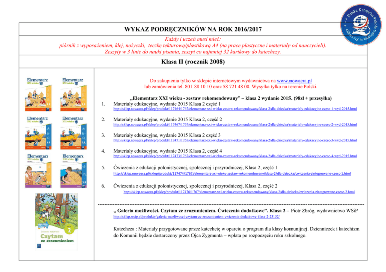 WYKAZ PODRĘCZNIKÓW NA ROK 2016/2017 Każdy i uczeń musi mieć: piórnik z wyposażeniem, klej, nożyczki, teczkę tekturową/plastikową A4 (na prace plastyczne i materiały od nauczycieli). Zeszyty w 3 linie do nauki pisania, zeszyt co najmniej 32 kartkowy do katechezy. Klasa II (rocznik 2008) Do zakupienia tylko w sklepie internetowym wydawnictwa na www.nowaera.pl lub zamówienia tel. 801 88 10 10 oraz 58 721 48 00. Wysyłka tylko na terenie Polski. 1. „Elementarz XXI wieku - zestaw rekomendowany” – klasa 2 wydanie 2015. (98zł + przesyłka) Materiały edukacyjne, wydanie 2015 Klasa 2 część 1 http://sklep.nowaera.pl/sklep/produkt/117464/1767/elementarz-xxi-wieku-zestaw-rekomendowany/klasa-2/dla-dziecka/materialy-edukacyjne-czesc-1-wyd-2015.html 2. Materiały edukacyjne, wydanie 2015 Klasa 2, część 2 http://sklep.nowaera.pl/sklep/produkt/117467/1767/elementarz-xxi-wieku-zestaw-rekomendowany/klasa-2/dla-dziecka/materialy-edukacyjne-czesc-2-wyd-2015.html 3. Materiały edukacyjne, wydanie 2015 Klasa 2 część 3 http://sklep.nowaera.pl/sklep/produkt/117471/1767/elementarz-xxi-wieku-zestaw-rekomendowany/klasa-2/dla-dziecka/materialy-edukacyjne-czesc-3-wyd-2015.html 4. Materiały edukacyjne, wydanie 2015 Klasa 2, część 4 http://sklep.nowaera.pl/sklep/produkt/117473/1767/elementarz-xxi-wieku-zestaw-rekomendowany/klasa-2/dla-dziecka/materialy-edukacyjne-czesc-4-wyd-2015.html 5. Ćwiczenia z edukacji polonistycznej, społecznej i przyrodniczej, Klasa 2, część 1 http://sklep.nowaera.pl/sklep/produkt/117474/1767/elementarz-xxi-wieku-zestaw-rekomendowany/klasa-2/dla-dziecka/cwiczenia-zintegrowane-czesc-1.html 6. Ćwiczenia z edukacji polonistycznej, społecznej i przyrodniczej, Klasa 2, część 2 http://sklep.nowaera.pl/sklep/produkt/117476/1767/elementarz-xxi-wieku-zestaw-rekomendowany/klasa-2/dla-dziecka/cwiczenia-zintegrowane-czesc-2.html --------------------------------------------------------------------------------------------------------------------------------------------------------------„ Galeria możliwości. Czytam ze zrozumieniem. Ćwiczenia dodatkowe”. Klasa 2 – Piotr Zbróg, wydawnictwo WSiP http://sklep.wsip.pl/produkty/galeria-mozliwosci-czytam-ze-zrozumieniem-cwiczenia-dodatkowe-klasa-2-23152/ Katecheza : Materiały przygotowane przez katechetę w oparciu o program dla klasy komunijnej. Dzienniczek i katechizm do Komunii będzie dostarczony przez Ojca Zygmunta – wpłata po rozpoczęciu roku szkolnego.