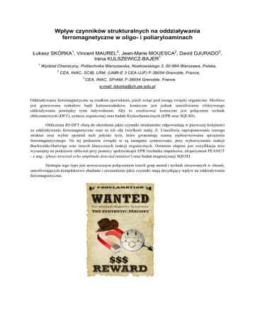 Wpływ czynników strukturalnych na oddziaływania ferromagnetyczne w oligo- i poliaryloaminach Łukasz SKÓRKA1, Vincent MAUREL2, Jean-Marie MOUESCA2, David DJURADO3, Irena KULSZEWICZ-BAJER1 1 Wydział Chemiczny, Politechnika Warszawska, Noakowskiego 3, 00-664 Warszawa, Polska, 2 CEA, INAC, SCIB, LRM, (UMR-E 3 CEA-UJF) F-38054 Grenoble, France, 3 CEA, INAC, SPrAM, F-38054 Grenoble, France e-mail: [email protected] Oddziaływania ferromagnetyczne są rzadkim zjawiskiem, jeżeli wziąć pod uwagę związki organiczne. Możliwe jest generowane rodników bądź kationorodników, konieczne jest jednak umożliwienie efektywnego oddziaływania pomiędzy tymi indywiduami. Aby to zrealizować konieczne jest połączenie technik obliczeniowych (DFT), syntezy organicznej oraz badań fizykochemicznych (EPR oraz SQUID). Obliczenia BS-DFT służą do określenia jakie czynniki strukturalne odpowiadają w pierwszej kolejności za oddziaływania ferromagnetyczne oraz za ich siłę (wielkość stałej J). Umożliwia zaproponowanie szeregu struktur oraz wybór spośród nich jedynie tych, które gwarantują szansę zaobserwowania sprzężenia ferromagnetycznego. Na tej podstawie związki te są następnie syntezowane, przy wykorzystaniu reakcji Buchwalda-Hartwiga oraz innych klasycznych reakcji organicznych. Ostatnim etapem jest weryfikacja tezy wysuniętej na podstawie obliczeń przy pomocy spektroskopii EPR (technika impulsowa, eksperyment PEANUT - z ang.: 'phase-inverted echo amplitude detected nutation') oraz badań magnetyzacji SQUID. Strategia tego typu jest nowoczesnym połączeniem trzech grup metod i technik stosowanych w chemii, umożliwiających kompleksowe zbadanie i zrozumienie jakie czynniki mają decydujący wpływ na oddziaływania ferromagnetyczne.