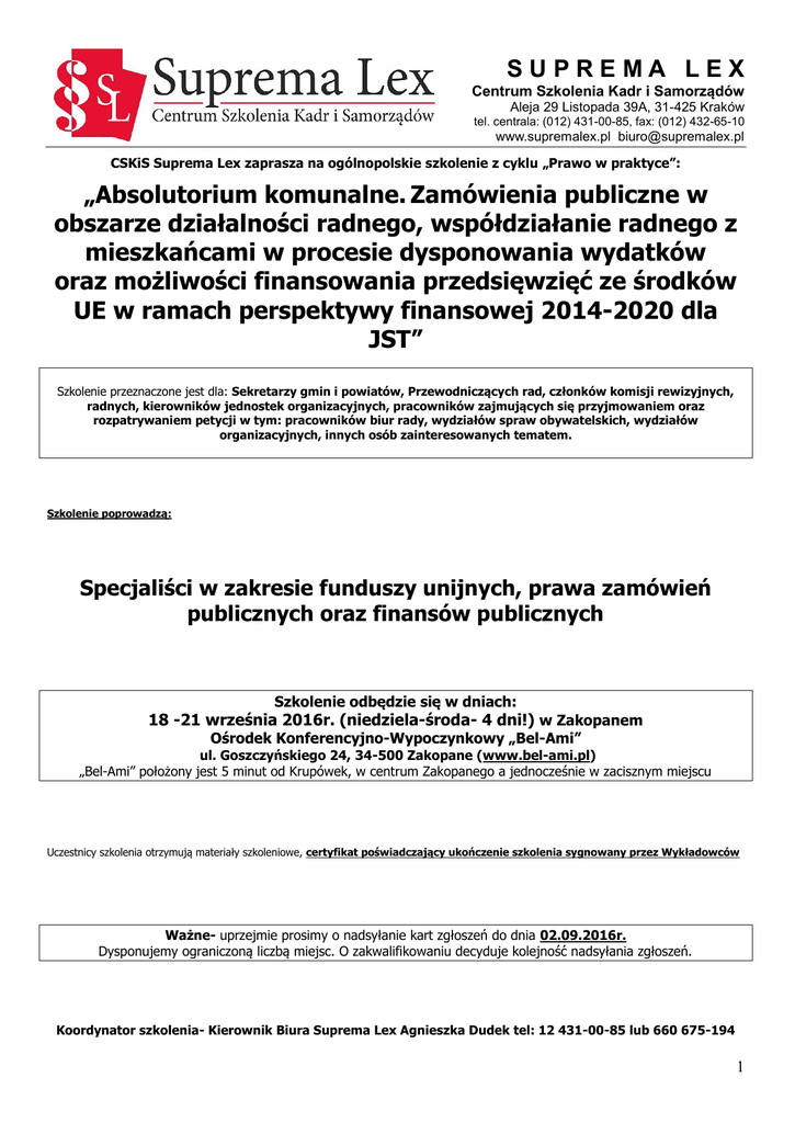 SUPREMA LEX Centrum Szkolenia Kadr i Samorządów Aleja 29 Listopada 39A, 31-425 Kraków tel. centrala: (012) 431-00-85, fax: (012) 432-65-10 www.supremalex.pl [email protected] CSKiS Suprema Lex zaprasza na ogólnopolskie szkolenie z cyklu „Prawo w praktyce”: „Absolutorium komunalne. Zamówienia publiczne w obszarze działalności radnego, współdziałanie radnego z mieszkańcami w procesie dysponowania wydatków oraz możliwości finansowania przedsięwzięć ze środków UE w ramach perspektywy finansowej 2014-2020 dla JST” Szkolenie przeznaczone jest dla: Sekretarzy gmin i powiatów, Przewodniczących rad, członków komisji rewizyjnych, radnych, kierowników jednostek organizacyjnych, pracowników zajmujących się przyjmowaniem oraz rozpatrywaniem petycji w tym: pracowników biur rady, wydziałów spraw obywatelskich, wydziałów organizacyjnych, innych osób zainteresowanych tematem. Szkolenie poprowadzą: Specjaliści w zakresie funduszy unijnych, prawa zamówień publicznych oraz finansów publicznych Szkolenie odbędzie się w dniach: 18 -21 września 2016r. (niedziela-środa- 4 dni!) w Zakopanem Ośrodek Konferencyjno-Wypoczynkowy „Bel-Ami” ul. Goszczyńskiego 24, 34-500 Zakopane (www.bel-ami.pl) „Bel-Ami” położony jest 5 minut od Krupówek, w centrum Zakopanego a jednocześnie w zacisznym miejscu Uczestnicy szkolenia otrzymują materiały szkoleniowe, certyfikat poświadczający ukończenie szkolenia sygnowany przez Wykładowców Ważne- uprzejmie prosimy o nadsyłanie kart zgłoszeń do dnia 02.09.2016r. Dysponujemy ograniczoną liczbą miejsc. O zakwalifikowaniu decyduje kolejność nadsyłania zgłoszeń. Koordynator szkolenia- Kierownik Biura Suprema Lex Agnieszka Dudek tel: 12 431-00-85 lub 660 675-194 1 SUPREMA LEX Centrum Szkolenia Kadr i Samorządów Aleja 29 Listopada 39A, 31-425 Kraków tel. centrala: (012) 431-00-85, fax: (012) 432-65-10 www.supremalex.pl [email protected] PROGRAM SZKOLENIA „Absolutorium komunalne. Zamówienia publiczne w obszarze działalności radnego, współdziałanie radnego z mieszkańcami w procesie dysponowania wydatków oraz możliwości finansowania przedsięwzięć ze środków UE w ramach perspektywy finansowej 2014-2020 dla JST”: 18-21.09.2016r. - BEL Ami 18.09.2016r. (niedziela) Przyjazd i zakwaterowanie uczestników szkolenia od godz. 15.00 - „BEL Ami” 19.09.2016 r. (poniedziałek) Możliwości finansowania przedsięwzięć ze środków ue w ramach perspektywy finansowej 2014-2020 dla JST 07.00-9.00 Śniadanie (13.00-14.00 Obiad) 09.00 Powitanie, omówienie harmonogramu, rozpoczęcie szkolenia 09.00-15.30 Możliwości finansowania przedsięwzięć ze środków ue w ramach perspektywy finansowej 2014-2020 1. Wprowadzenie w tematykę zagadnień związanych z funduszami unijnymi oraz zasadami obowiązującymi kraje członkowskie, w tym Polskę, w perspektywie finansowej 2014-2020 a. Środki z budżetu Unii Europejskiej – cel i przedmiot wydatkowania b. Na czym polega polityka spójności Unii Europejskiej? c. Wybrane instrumenty finansowe polityki regionalnej. Rodzaje funduszy (Europejski Fundusz Rozwoju Regionalnego - EFRR, Europejski Fundusz Społeczny - EFS, Fundusz Spójności - FS) 2. Nowa perspektywa finansowa UE 2014-2020 w Polsce. Możliwości współfinansowania projektów w ramach programów operacyjnych o zasięgu ogólnopolskim oraz programach regionalnych – analiza wg. kluczowych grup odbiorców - podmioty JST (zakres wsparcia, stosowane instrumenty, , poziom dofinansowania, rodzaje wydatków kwalifikowanych) a. Program Infrastruktura i Środowisko b. Program Operacyjny Polska Wschodnia c. Regionalny Program Operacyjny dla wybranych województw 3. Ogólne zasady dotyczące aplikowania w procedurze konkursowej a. Zasady dotyczące procedury wyboru projektu b. Ogólne zasady dotyczące kwalifikowania kosztów c. Procedura oceny wniosku d. Źródła informacji o dostępnych konkursach 15.30-19.00 Czas wolny. Dla zainteresowanych wycieczka piesza z przewodnikiem tatrzańskim od 19.45 Kolacja regionalna z udziałem kapeli góralskiej 20.09.2016 r. (wtorek) Absolutorium komunalne 07.00-09.00 Śniadanie 13.00-14.00 Obiad 09.00-15.30 Absolutorium komunalne ABSOLUTORIUM –MERYTORYCZNE PODSTAWY OCENY PRZEZ RADNEGO STOPNIA WYKONANIA 2 SUPREMA LEX Centrum Szkolenia Kadr i Samorządów Aleja 29 Listopada 39A, 31-425 Kraków tel. centrala: (012) 431-00-85, fax: (012) 432-65-10 www.supremalex.pl [email protected] BUDŻETU 1. Znaczenie prawnych podstaw określających absolutorium komunalne, czyli o wymogach postępowania określonych w regulacjach ustrojowych (ustawa o samorządzie gminnym, ustawa o samorządzie powiatowym), ustawie o finansach publicznych oraz ustawie o regionalnych izbach obrachunkowych. 2. Zakres kompetencji komisji rewizyjnej na tle podstawy sformułowania wniosku w sprawie udzielenia lub nieudzielenia absolutorium - praktyczne wskazania na tle sposobu wypełnienia wymogów art. 270 ust. 2 ustawy o finansach publicznych, czyli jakie czynności należy wykonać w ramach realizacji obowiązku rozpatrzenia sprawozdań i informacji, o których mowa w powołanym przepisie. 3. Podstawy prawidłowej oceny przez radnego stanu finansowego jednostki samorządu terytorialnego na tle samodzielnej analizy kluczowych wskaźników ekonomicznych. 4. Rola i znaczenie wydawanych przez regionalne izby obrachunkowe opinii w sprawach: 1) przedkładanych przez zarządy powiatów oraz wójtów (burmistrzów, prezydentów miast) sprawozdań z wykonania budżetów (wraz z informacjami o stanie mienia komunalnego), 2) wniosków komisji rewizyjnych organów stanowiących jednostek samorządu terytorialnego w sprawie absolutorium oraz opinii w sprawie uchwały rady gminy o nieudzieleniu wójtowi absolutorium. Prezentacja stwierdzanych przez składy orzekające regionalnych izb obrachunkowych typowych uchybień i nieprawidłowości związanych z przedmiotem wydawanych przez komisje rewizyjne wniosków oraz opinii. 
