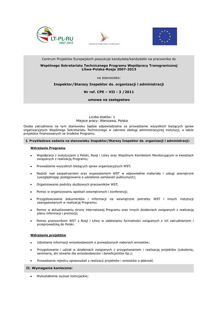 Centrum Projektów Europejskich poszukuje kandydata/kandydatki na pracownika do Wspólnego Sekretariatu Technicznego Programu Współpracy Transgranicznej Litwa-Polska-Rosja 2007-2013 na stanowisko: Inspektor/Starszy Inspektor ds. organizacji i administracji Nr ref. CPE – VII - 3 /2011 umowa na zastępstwo Liczba etatów: 1 Miejsce pracy: Warszawa, Polska Osoba zatrudniona na tym stanowisku będzie odpowiedzialna za prowadzenie wszystkich bieżących spraw organizacyjnych Wspólnego Sekretariatu Technicznego w zakresie obsługi administracyjnej instytucji, a także projektów finansowanych ze środków Programu. I. Przykładowe zadania na stanowisku Inspektor/Starszy Inspektor ds. organizacji i administracji: Wdrażanie Programu Współpraca z instytucjami z Polski, Rosji i Litwy oraz Wspólnym Komitetem Monitorującym w kwestiach związanych z realizacją Programu; Prowadzenie wszystkich bieżących spraw organizacyjnych WST; Nadzór nad zaopatrzeniem oraz wyposażeniem WST w odpowiednie materiały i usługi zewnętrzne (uwzględniając postępowania o udzielenie zamówień publicznych); Organizowanie podróży służbowych pracowników WST; Pomoc w organizowaniu spotkań wewnętrznych i konferencji; Przygotowywanie dokumentów i informacji zaangażowanych w realizację Programu; na wewnętrzne potrzeby WST i innych instytucji Pomoc w aktualizowaniu strony internetowej Programu oraz innych działaniach związanych z realizacją planu informacji i promocji; Pomoc pracownikom WST z Rosji i Litwy w załatwianiu formalności związanych z ich zatrudnieniem i przeprowadzką do Polski. Wdrażanie projektów Udzielanie informacji wnioskodawcom o prowadzonych naborach wniosków; Przygotowanie i udział w działaniach związanych z przygotowaniem i realizacją projektów (szkolenia, seminaria, dni otwarte dla wnioskodawców i beneficjentów itp.); Prowadzenie rejestru sprawozdań z realizacji projektów i wniosków o płatność. II. Wymagania konieczne: Wykształcenie wyższe licencjackie; Udokumentowany staż pracy w administracji; Biegła znajomość języka polskiego i angielskiego w mowie i piśmie; Znajomość obsługi komputera (MS Office, Internet) i urządzeń biurowych; Umiejętność pracy w zespole, sumienność; Samodzielność w działaniu oraz dobra organizacja pracy; Dyspozycyjność. III. Wymagania pożądane: Doświadczenie w pracy w programach/projektach finansowanych ze środków UE, programach współpracy regionalnej lub międzynarodowej (preferowane: Fundusze Strukturalne, INTERREG, Tacis, programy przedakcesyjne); Dobra znajomość języka rosyjskiego i/lub litewskiego w mowie i piśmie; Doświadczenie w pracy w międzynarodowym środowisku; Prawo jazdy kat. B. IV. Wymagane dokumenty: 1. Życiorys zawodowy wraz z listem motywacyjnym 2. Kopie dokumentów potwierdzających wykształcenie oraz przebieg dotychczasowego zatrudnienia 3. Podpisane własnoręcznie oświadczenie Kandydata o wyrażeniu zgody na przetwarzanie danych osobowych do celów rekrutacji: „Wyrażam zgodę na przetwarzanie moich danych osobowych zawartych w ofercie pracy do realizacji procesu naboru prowadzonego przez Centrum Projektów Europejskich z siedzibą w Warszawie, zgodnie z ustawą z dnia 29.08.1997 r. o ochronie danych osobowych (Dz. U. z 2002 Nr 101, poz.926 ze zm.)". Informujemy, iż zgłoszenia aplikacyjne nie zawierające powyższego oświadczenia nie będą rozpatrywane. 4. W przypadku osób niepełnosprawnych - kopia orzeczenia o stopniu niepełnosprawności lub kopia równoważnego dokumentu zgodnie z art. 5 lub 5a Ustawy z dnia 27 sierpnia 1997 r. o rehabilitacji zawodowej i społecznej oraz zatrudnianiu osób niepełnosprawnych Oferty w języku polskim lub angielskim oznaczone numerem referencyjnym, zawierające wymagane dokumenty należy składać osobiście w siedzibie Centrum Projektów Europejskich w Warszawie lub przesyłać najpóźniej do dnia 02.12.2011 na adres: Centrum Projektów Europejskich ul. Domaniewska 39 A 02-672 Warszawa Inne informacje: Oferty nie zawierające numeru referencyjnego nie będą rozpatrywane. Oferty dostarczone po terminie nie będą rozpatrywane (liczy się data wpływu). Uprzejmie informujemy, iż skontaktujemy się tylko z wybranymi Kandydatami oraz, że nie zwracamy nadesłanych dokumentów. Oferty kandydatów nie spełniających wymagań formalnych oraz oferty kandydatów, którzy nie zostaną wybrani w wyniku rekrutacji do zatrudnienia zostaną zniszczone. Oferujemy zatrudnienie na podstawie umowy o pracę według obowiązującego prawa Rzeczypospolitej Polskiej w tym zakresie.