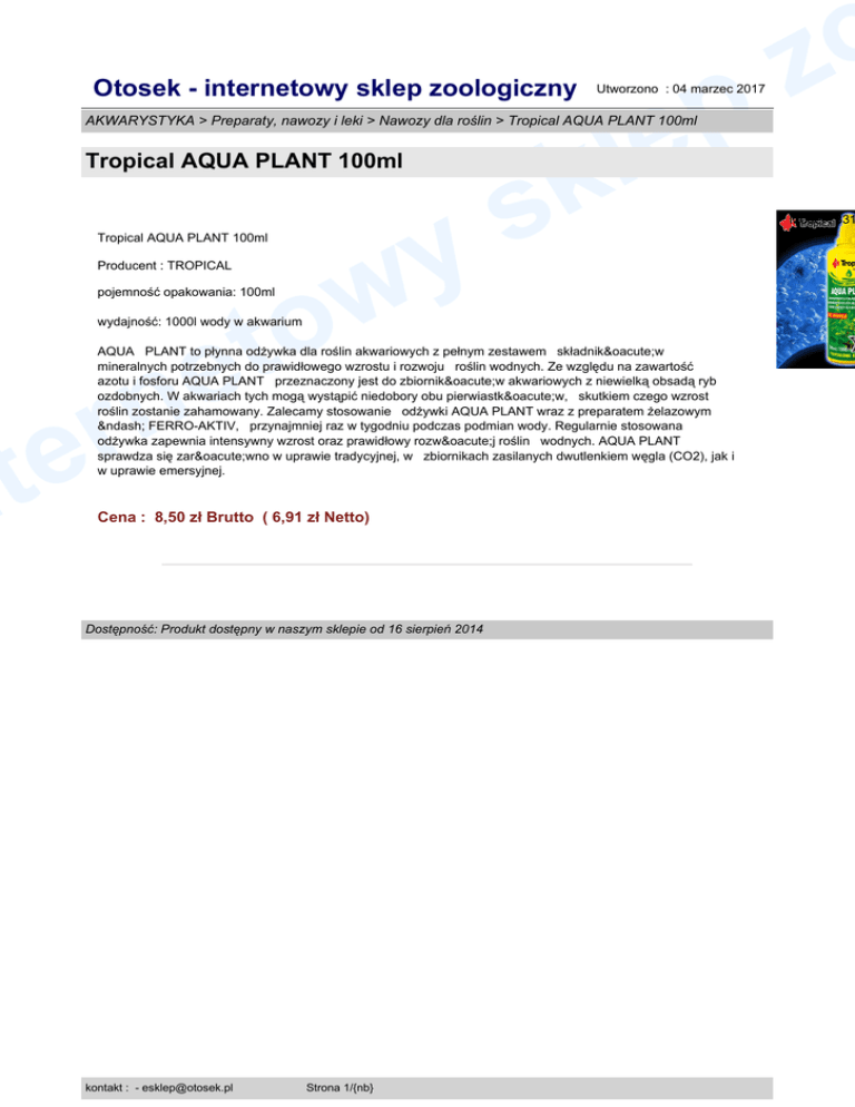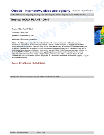 Otosek - internetowy sklep zoologiczny p le Utworzono : 04 marzec 2017 AKWARYSTYKA > Preparaty, nawozy i leki > Nawozy dla roślin > Tropical AQUA PLANT 100ml Tropical AQUA PLANT 100ml y w to Tropical AQUA PLANT 100ml Producent : TROPICAL k s pojemność opakowania: 100ml wydajność: 1000l wody w akwarium e n r e t n AQUA PLANT to płynna odżywka dla roślin akwariowych z pełnym zestawem składników mineralnych potrzebnych do prawidłowego wzrostu i rozwoju roślin wodnych. Ze względu na zawartość azotu i fosforu AQUA PLANT przeznaczony jest do zbiorników akwariowych z niewielką obsadą ryb ozdobnych. W akwariach tych mogą wystąpić niedobory obu pierwiastków, skutkiem czego wzrost roślin zostanie zahamowany. Zalecamy stosowanie odżywki AQUA PLANT wraz z preparatem żelazowym – FERRO-AKTIV, przynajmniej raz w tygodniu podczas podmian wody. Regularnie stosowana odżywka zapewnia intensywny wzrost oraz prawidłowy rozwój roślin wodnych. AQUA PLANT sprawdza się zarówno w uprawie tradycyjnej, w zbiornikach zasilanych dwutlenkiem węgla (CO2), jak i w uprawie emersyjnej. Cena : 8,50 zł Brutto ( 6,91 zł Netto) Dostępność: Produkt dostępny w naszym sklepie od 16 sierpień 2014 kontakt : - [email protected] Strona 1/{nb} o z Model : 331