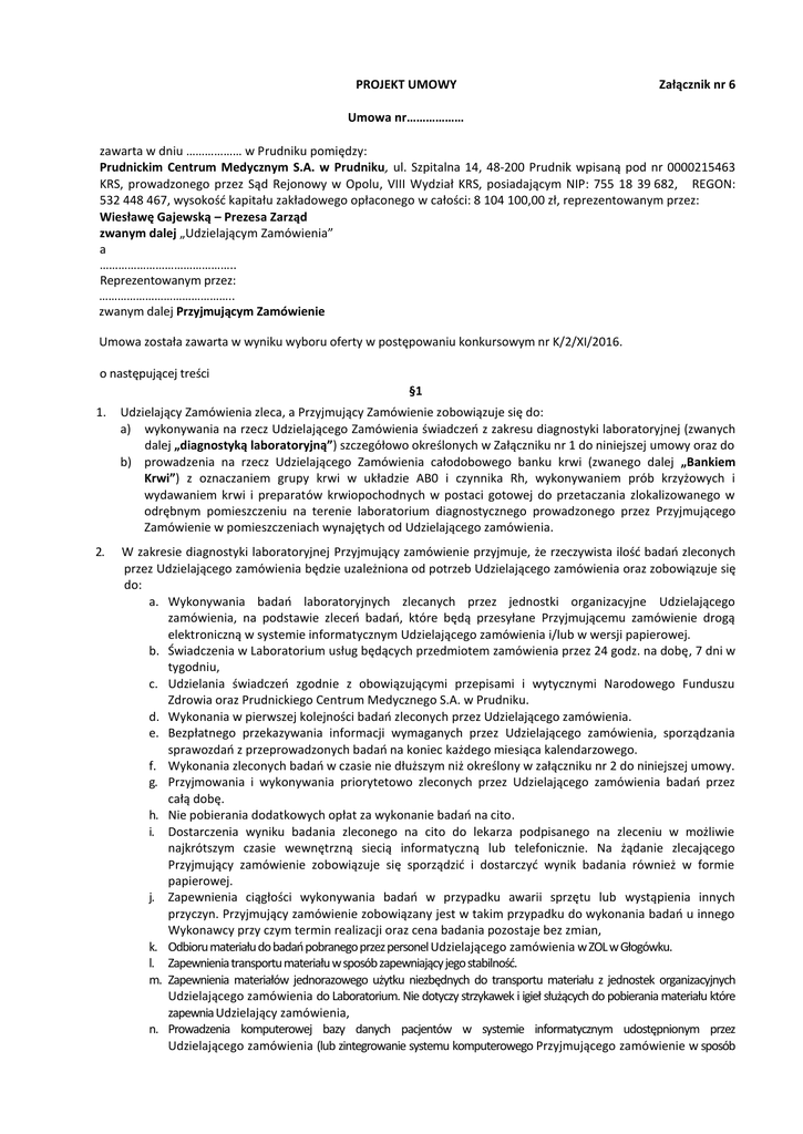 PROJEKT UMOWY Załącznik nr 6 Umowa nr……………… zawarta w dniu ……………… w Prudniku pomiędzy: Prudnickim Centrum Medycznym S.A. w Prudniku, ul. Szpitalna 14, 48-200 Prudnik wpisaną pod nr 0000215463 KRS, prowadzonego przez Sąd Rejonowy w Opolu, VIII Wydział KRS, posiadającym NIP: 755 18 39 682, REGON: 532 448 467, wysokość kapitału zakładowego opłaconego w całości: 8 104 100,00 zł, reprezentowanym przez: Wiesławę Gajewską – Prezesa Zarząd zwanym dalej „Udzielającym Zamówienia” a …………………………………….. Reprezentowanym przez: …………………………………….. zwanym dalej Przyjmującym Zamówienie Umowa została zawarta w wyniku wyboru oferty w postępowaniu konkursowym nr K/2/XI/2016. o następującej treści §1 1. Udzielający Zamówienia zleca, a Przyjmujący Zamówienie zobowiązuje się do: a) wykonywania na rzecz Udzielającego Zamówienia świadczeń z zakresu diagnostyki laboratoryjnej (zwanych dalej „diagnostyką laboratoryjną”) szczegółowo określonych w Załączniku nr 1 do niniejszej umowy oraz do b) prowadzenia na rzecz Udzielającego Zamówienia całodobowego banku krwi (zwanego dalej „Bankiem Krwi”) z oznaczaniem grupy krwi w układzie AB0 i czynnika Rh, wykonywaniem prób krzyżowych i wydawaniem krwi i preparatów krwiopochodnych w postaci gotowej do przetaczania zlokalizowanego w odrębnym pomieszczeniu na terenie laboratorium diagnostycznego prowadzonego przez Przyjmującego Zamówienie w pomieszczeniach wynajętych od Udzielającego zamówienia. 2. W zakresie diagnostyki laboratoryjnej Przyjmujący zamówienie przyjmuje, że rzeczywista ilość badań zleconych przez Udzielającego zamówienia będzie uzależniona od potrzeb Udzielającego zamówienia oraz zobowiązuje się do: a. Wykonywania badań laboratoryjnych zlecanych przez jednostki organizacyjne Udzielającego zamówienia, na podstawie zleceń badań, które będą przesyłane Przyjmującemu zamówienie drogą elektroniczną w systemie informatycznym Udzielającego zamówienia i/lub w wersji papierowej. b. Świadczenia w Laboratorium usług będących przedmiotem zamówienia przez 24 godz. na dobę, 7 dni w tygodniu, c. Udzielania świadczeń zgodnie z obowiązującymi przepisami i wytycznymi Narodowego Funduszu Zdrowia oraz Prudnickiego Centrum Medycznego S.A. w Prudniku. d. Wykonania w pierwszej kolejności badań zleconych przez Udzielającego zamówienia. e. Bezpłatnego przekazywania informacji wymaganych przez Udzielającego zamówienia, sporządzania sprawozdań z przeprowadzonych badań na koniec każdego miesiąca kalendarzowego. f. Wykonania zleconych badań w czasie nie dłuższym niż określony w załączniku nr 2 do niniejszej umowy. g. Przyjmowania i wykonywania priorytetowo zleconych przez Udzielającego zamówienia badań przez całą dobę. h. Nie pobierania dodatkowych opłat za wykonanie badań na cito. i. Dostarczenia wyniku badania zleconego na cito do lekarza podpisanego na zleceniu w możliwie najkrótszym czasie wewnętrzną siecią informatyczną lub telefonicznie. Na żądanie zlecającego Przyjmujący zamówienie zobowiązuje się sporządzić i dostarczyć wynik badania również w formie papierowej. j. Zapewnienia ciągłości wykonywania badań w przypadku awarii sprzętu lub wystąpienia innych przyczyn. Przyjmujący zamówienie zobowiązany jest w takim przypadku do wykonania badań u innego Wykonawcy przy czym termin realizacji oraz cena badania pozostaje bez zmian, k. Odbioru materiału do badań pobranego przez personel Udzielającego zamówienia w ZOL w Głogówku. l. Zapewnienia transportu materiału w sposób zapewniający jego stabilność. m. Zapewnienia materiałów jednorazowego użytku niezbędnych do transportu materiału z jednostek organizacyjnych Udzielającego zamówienia do Laboratorium. Nie dotyczy strzykawek i igieł służących do pobierania materiału które zapewnia Udzielający zamówienia, n. Prowadzenia komputerowej bazy danych pacjentów w systemie informatycznym udostępnionym przez Udzielającego zamówienia (lub zintegrowanie systemu komputerowego Przyjmującego zamówienie w sposób 3. 4. 5. 6. 7. 8. 9. 1. 2. zapewniający kompatybilność z systemem informatycznym stosowanym przez Udzielającego Zamówienia bez ponoszenia dodatkowych kosztów przez Udzielającego Zamówienia). o. Zapewnienia wiarygodności wyników w oparciu o zewnętrzną i wewnętrzną kontrolę wszystkich parametrów oznaczonych w Laboratorium Przyjmującego zamówienie. p. Wydawania wyników badań oraz dokumentacji upoważnionym do tego osobom zgodnie z przepisami obowiązującymi w zakładach opieki zdrowotnej. q. Pobierania krwi w systemie zamkniętym. r. Wykonywania obowiązków wynikających z niniejszej umowy wyłącznie na własny koszt. s. Zapewnienia niezbędnego wyposażenia laboratorium w sprzęt i materiały zapewniające wykonanie badań objętych przedmiotem zamówienia. Do zadań Przyjmującego Zamówienie w zakresie prowadzenia Banku Krwi należy w szczególności: 1) składanie w formie pisemnej, w najbliższym Regionalnym Centrum Krwiodawstwa i Krwiolecznictwa zamówień zbiorczych i indywidualnych na krew i jej składniki zgodnie z zamówieniami składanymi przez Udzielającego Zamówienia, po uprzednim uzyskaniu akceptacji tych zamówień przez lekarza odpowiedzialnego za gospodarkę krwią; 2) odbiór krwi i jej składników; 3) przechowywanie krwi i jej składników do czasu ich wydania Udzielającemu Zamówienia; 4) wydawanie krwi i jej składników Udzielającemu Zamówienia; 5) prowadzenie dokumentacji: a) przychodów i rozchodów krwi i jej składników, b) zapewniającej identyfikację dawcy i biorcy krwi i jej składników, c) prowadzenie protokołów kontroli temperatur, d) prowadzenie sprawozdawczości zużycia krwi i jej składników, e) przekazywanie sprawozdań, o których mowa w pkt d) do właściwego centrum krwiodawstwa i krwiolecznictwa, f) składanie z