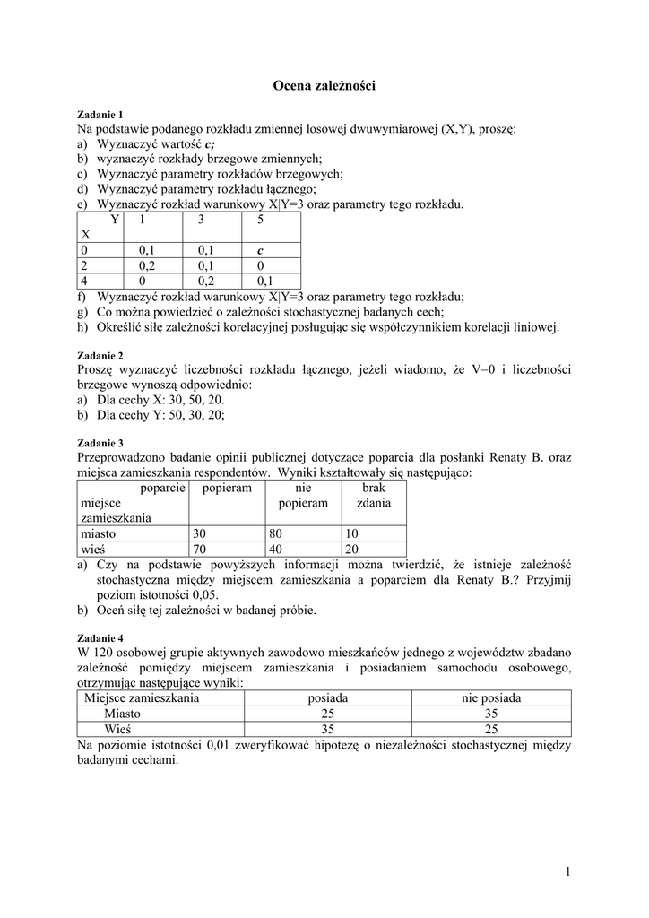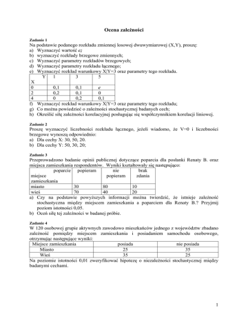 Ocena zależności Zadanie 1 Na podstawie podanego rozkładu zmiennej losowej dwuwymiarowej (X,Y), proszę: a) Wyznaczyć wartość c; b) wyznaczyć rozkłady brzegowe zmiennych; c) Wyznaczyć parametry rozkładów brzegowych; d) Wyznaczyć parametry rozkładu łącznego; e) Wyznaczyć rozkład warunkowy X|Y=3 oraz parametry tego rozkładu. Y 1 3 5 X 0 0,1 0,1 c 2 0,2 0,1 0 4 0 0,2 0,1 f) Wyznaczyć rozkład warunkowy X|Y=3 oraz parametry tego rozkładu; g) Co można powiedzieć o zależności stochastycznej badanych cech; h) Określić siłę zależności korelacyjnej posługując się współczynnikiem korelacji liniowej. Zadanie 2 Proszę wyznaczyć liczebności rozkładu łącznego, jeżeli wiadomo, że V=0 i liczebności brzegowe wynoszą odpowiednio: a) Dla cechy X: 30, 50, 20. b) Dla cechy Y: 50, 30, 20; Zadanie 3 Przeprowadzono badanie opinii publicznej dotyczące poparcia dla posłanki Renaty B. oraz miejsca zamieszkania respondentów. Wyniki kształtowały się następująco: poparcie popieram nie brak miejsce popieram zdania zamieszkania miasto 30 80 10 wieś 70 40 20 a) Czy na podstawie powyższych informacji można twierdzić, że istnieje zależność stochastyczna między miejscem zamieszkania a poparciem dla Renaty B.? Przyjmij poziom istotności 0,05. b) Oceń siłę tej zależności w badanej próbie. Zadanie 4 W 120 osobowej grupie aktywnych zawodowo mieszkańców jednego z województw zbadano zależność pomiędzy miejscem zamieszkania i posiadaniem samochodu osobowego, otrzymując następujące wyniki: Miejsce zamieszkania posiada nie posiada Miasto 25 35 Wieś 35 25 Na poziomie istotności 0,01 zweryfikować hipotezę o niezależności stochastycznej między badanymi cechami. 1 Zadanie 5 Badając związek miedzy miejscem zamieszkania i wydatkami na rozrywkę i kulturę ( w zł) uzyskano na podstawie 1000 – elementowej próby losowej następującą postać tablicy korelacyjnej: Kategorie cech Wydatki w zł: 0-20 20-40 40-60 60-80 Wieś 100 20 0 0 Miejscowość o liczbie mieszkańców do 75 000 80 220 100 60 Miejscowość o liczbie mieszkańców powyżej 75 000 0 0 200 220 Określić siłę zależności statystycznej badanych cech. Czy zależność ta jest istotna? Zadanie 6 Wylosowano grupę 200 osób, a następnie zbadano zależność pomiędzy ich płcią (x), a faktem posiadania przez nich prawa jazdy (y).Sprawdź hipotezę o stochastycznej niezależności pomiędzy badanymi zmiennymi, wiedząc, że współczynnik V- Cramera przyjął dla tej próby wartość 0,2 (przyjąć poziom istotności 0,05). Zadanie 7 (5.3.1 ze zbioru) OECD podaje dane dla wybranych krajów o wydatkach na szkolnictwo wyższe oraz wysokości nakładów na jednego studenta w 2000 roku: Kraj Wydatki [%PKB] Nakłady [$/studenta] USA 1,1 20358 Szwajcaria 1,2 18450 Szwecja 2,0 15097 Holandia 1,3 11934 Japonia 0,5 10914 Niemcy 1,1 10898 Austria 1,4 10851 Francja 1,0 8373 Włochy 0,8 8065 Polska 0,2 1235 a) Jaka jest kolejność państw w każdym z ciągu danych? b) Wyznaczyć współczynnik korelacji rang Spearmana i zinterpretować jego wynik. Zadanie 8 W celu zbadania zależności pomiędzy wysokością płacy a długością stażu w firmie wylosowano 5 pracowników. Na podstawie poniższych informacji należy stwierdzić czy zależność taka istnieje oraz wyznaczyć jej siłę i kierunek. Czy na poziomie istotności 0,05 zależność ta jest istotna w populacji pracowników jeżeli rozkład stażu pracy w firmie i zarobków pracowników mają rozkład normalny? Staż pracy 1 1,5 2,5 3 2 Płaca 800 2500 2000 3000 1500 2 Zadanie 9 Wysokość kosztów (x) oraz miesięcznych zysków (y) uzyskanych przez firmę w sześciu wybranych losowo miesiącach (mln USD) przedstawiono w zestawieniu: x 10 9 7 5 3 2 y 3 7 9 8 12 15 Określ siłę zależności pomiędzy zmiennymi, wiedząc, że sx= 3,22 oraz sy = 4,15. Czy badaną zależność można uznać za istotnie ujemną (przyjąć α = 0,05) jeżeli miesięczne koszty i zyski firmy mają rozkład normalny? Zadanie 10 Zbadano 180 hurtowni ze względu na: x - liczbę zatrudnionych osób i y -wartość sprzedaży (tys.zł). Uzyskano następujące informacje: ∑xi = 1440; ∑yi = 32,4; ∑xiyi =11000; Sx= 8; Sy=35. Ocenić siłę zależności wartości sprzedaży względem liczby zatrudnionych. Czy zależność ta jest istotna na poziomie istotności 0,05? Jakie założenia należy poczynić w celu sprawdzenia istotności zależności? Zadanie 11 W oparciu o informacje ustalone dla 100 losowo wybranych studentów, dotyczące liczby egzaminów w sesji letniej (x) i liczby wizyt w kinie w maju br. zbadaj istotność tego związku dla ogółu studentów. Przyjąć poziom istotności 0,01. Jeżeli wymaga tego metoda, zapisz stosowne założenia. L.wizyt w kinie 0 1 2 L.egzaminów 4 0 20 10 5 20 20 0 6 20 10 0 Zadanie 12 120 losowo wybranych osób zapytano o wydatki (w zł) na prasę w ciągu ostatniego miesiąca (X) oraz o to, czy w ubiegłym roku przeczytały przynajmniej jedną książkę (Y). Dane zostały pogrupowane według przedziałów klasowych cechy X : 0–10; 10-20; powyżej 20 oraz cechy Y: tak; nie. Na podstawie uzyskanych odpowiedzi wyznaczono współczynnik V-Cramera =0,28. a) Czy związek miedzy zmiennymi można uznać za statystycznie istotny (dla α=0,01)? b) Uzasadnić, czy charakter cech X i Y pozwala wykorzystać do oceny siły zależności współczynnik korelacji liniowej Pearsona r ? Dodatkowe zadania do rozwiązania w domu: Zbiór zadań: ▪ dwuwymiarowa zmienna losowa:1.3.2-1.3.4; 1.3.1, 1.3.5, 1.3.6. ▪ ocena zależności w rozkładach empirycznych: 5.2 (przykład); 5.2.2; 5.2.4; 5.3.1; 5.3.3; 5.3.5; 5.3.6; 5.5.1 Zestaw dr Wieczorek: 1-7, 12-18, 19 bez b). 3