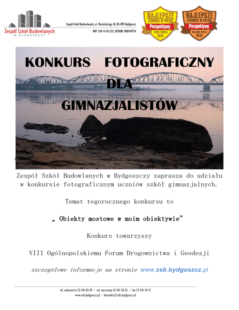 KONKURS FOTOGRAFICZNY DLA GIMNAZJALISTÓW Z Zespół Szkół Budowlanych w Bydgoszczy zaprasza do udziału w konkursie fotograficznym uczniów szkół gimnazjalnych. Temat tegorocznego konkursu to „ Obiekty mostowe w moim obiektywie” Konkurs towarzyszy VIII Ogólnopolskiemu Forum Drogownictwa i Geodezji szczegółowe informacje na stronie www.zsb.bydgoszcz.pl