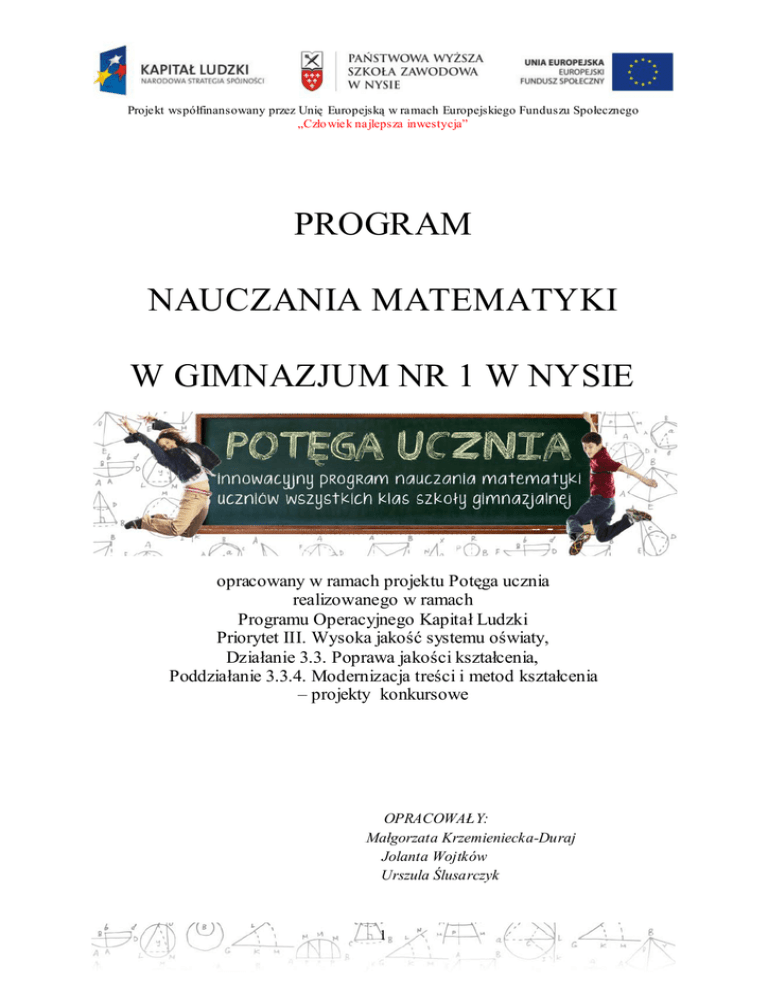 Projekt współfinansowany przez Unię Europejską w ramach Europejskiego Funduszu Społecznego „Czło wiek najlepsza inwestycja” PROGRAM NAUCZANIA MATEMATYKI W GIMNAZJUM NR 1 W NYSIE opracowany w ramach projektu Potęga ucznia realizowanego w ramach Programu Operacyjnego Kapitał Ludzki Priorytet III. Wysoka jakość systemu oświaty, Działanie 3.3. Poprawa jakości kształcenia, Poddziałanie 3.3.4. Modernizacja treści i metod kształcenia – projekty konkursowe 0 B OPRACOWAŁY: Małgorzata Krzemieniecka-Duraj Jolanta Wojtków Urszula Ślusarczyk 1 SPIS TREŚCI Dział Nr Strona I Wstęp 3 II Cele ogólne i szczegółowe 4 III Procedury osiągania wymagań 6 IV Treści nauczania: klasa I 8 klasa II 15 klasa III 20 V Ramowy rozkład materiału nauczania 26 VI Rozkład materiału nauczania: klasa I 27 klasa II 30 klasa III 33 VII Przewidywane osiągnięcia uczniów 37 VIII Sprawdzanie i ocenianie osiągnięć uczniów 42 Program wychowawczy przedmiotu matematyka 43 IX 2 9 3 B I.WSTĘP Program powstał w związku z przystąpieniem szkoły do realizacji projektu „POTĘGA UCZNIA” realizowanego przez Państwową Wyższą Szkołę Zawodową w Nysie w ramach Programu Operacyjnego Kapitał Ludzki (osi priorytetowej 3.3.5 - Modernizacja treści i metod kształcenia projekty konkursowe). Głównym celem projektu "Potęga ucznia" jest podniesienie jakości kształcenia w zakresie matematyki uczniów Gimnazjum nr 1 w Nysie poprzez wprowadzenie innowacyjnego programu nauczania. Projekt ma na celu opracowanie programu nauczania matematyki oraz wdrożenie go dzięki wprowadzeniu nowych narzędzi dydaktycznych. Program zawiera szczegółowe cele kształcenia zawarte w podstawie programowej, w dużej mierze jest oparty na wykorzystaniu technologii informacyjno-komunikacyjnej (TIK), które aktualnie proces dydaktyczny wykorzystuje w niewystarczającej mierze. W trakcie realizacji programu opracowanych zostanie 60 scenariuszy lekcyjnych, w których pokazany będzie sposób wykorzystania zakupionych w ramach projektu pomocy: tablicy interaktywnej, programów komputerowych, gier logicznych, zbiorów zadań itp. oraz elementów oceniania kształtującego wprowadzanego w szkole. Program ten ma na celu wzbudzenie zainteresowania przyjazną matematyką wśród uczniów gimnazjum, zwiększenie wiedzy nauczycieli w zakresie zastosowania innowacyjnych form przekazu wiedzy (TIK), jak również zmianę formy kształcenia w ramach przedmiotu matematyka. Korzyści, które odniesie szkoła w związku z realizacją programu to wzrost efektywności nauczania, wzbogacenie bazy dydaktycznej o dodatkowe pomoce naukowe i materiały do ćwiczeń oraz uzupełnienie kwalifikacji nauczycieli w zakresie wykorzystania nowoczesnych narzędzi w nauczaniu. W związku ze zróżnicowanym poziomem wiedzy matematycznej uczniów rozpoczynających naukę w gimnazjum koniecznością stało się uwzględnienie w programie dodatkowych godzin na wyrównania poziomu uczniów. Zwiększenie liczby godzin nauczania matematyki do pięciu tygodniowo w klasach pierwszych i drugich ma pomóc uczniowi słabemu w opanowaniu wiadomości i umiejętności zawartych w „Podstawie programowej kształcenia ogólnego”, natomiast uczniowi uzdolnionemu rozwijać zdolności. To nauczyciel będzie decydował, ile godzin na ten cel musi poświęcić, aby z sukcesem mógł realizować zagadnienia zawarte w podstawie programowej matematyki w gimnazjum. Zwiększenie ilości godzin na ten przedmiot ma także dać nauczycielom oraz ich uczniom czas na powtarzanie i bieżące utrwalanie wiadomości. Uczniom uzdolnionym, nauczyciel przy zwiększonej liczbie godzin do dyspozycji będzie mógł wprowadzać zagadnienia wykraczające poza podstawę programową i proponować zadania o podwyższonym stopniu trudności. Zakupione w ramach projektu zbiory zadań oraz programy komputerowe dadzą nauczycielom większą możliwość wyboru zadań o różnym stopniu trudności, w zależności od poziomu i zainteresowania klasy. Zastosowanie w nauczaniu matematyki technologii informacyjno-komunikacyjnej (TIK) ma uatrakcyjnić lekcje matematyki i spowodować większe nimi zainteresowanie ze strony uczniów. Dużo czasu planujemy poświęcić na ćwiczenie z uczniami nabytych umiejętności i wiadomości, ich stałe powtarzanie i utrwalanie nie zapominając przy tym o zwróceniu szczególnej uwagi na kształcenie logicznego myślenia i samodzielnego dochodzenia przez uczniów do rozwiązywania problemów. Istotnym elementem tego programu mającego na celu podniesienie efektywności nauczania matematyki w gimnazjum jest wdrażane obecnie w szkole ocenianie kształtujące. Realizacja zaproponowanego przez nas programu nauczania matematyki ma w istotny sposób pomóc uczniom na kolejnym, czwartym, etapie edukacyjnym. 3 9 4 B II. CELE EDUKACYJNE 1. Cele ogólne Nauczanie matematyki w gimnazjum ma za zadanie nie tylko zapoznać uczniów z podstawowymi pojęciami matematycznymi i ich własnościami, ale przede wszystkim powinno być ukierunkowane na wspieranie rozwoju ucznia. Dążymy w związku z tym do tego, aby ucząc matematyki pomóc uczniowi poznać i zrozumieć otaczający świat poprzez: rozwijanie uzdolnień i zainteresowań rozwijanie samodzielnego, logicznego i twórczego myślenia rozwijanie umiejętności wyciągania wniosków, stawiania i weryfikowania hipotez kształcenie umiejętności precyzyjnego wyrażania myśli Mamy również na uwadze realizowanie typowo matematycznych celów nauczania, jakimi są: poznawanie podstawowych pojęć i faktów matematycznych rozumienie poznanych pojęć i faktów matematycznych stosowanie poznanych faktów matematycznych do rozwiązywania problemów analizowanie otrzymanych rozwiązań Pamiętamy o konieczności wiązania teorii z praktyką uwzględniając przy tym: matematyzowanie danych sytuacji z różnych dziedzin nauki i życia stosowanie metod matematycznych do opisu i interpretacji konkretnej sytuacji dyskutowanie sposob
