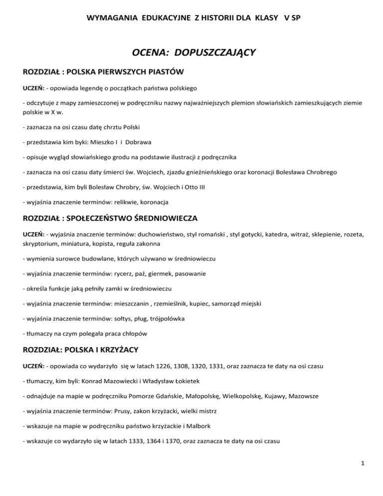 WYMAGANIA EDUKACYJNE Z HISTORII DLA KLASY V SP OCENA: DOPUSZCZAJĄCY ROZDZIAŁ : POLSKA PIERWSZYCH PIASTÓW UCZEŃ: - opowiada legendę o początkach paostwa polskiego - odczytuje z mapy zamieszczonej w podręczniku nazwy najważniejszych plemion słowiaoskich zamieszkujących ziemie polskie w X w. - zaznacza na osi czasu datę chrztu Polski - przedstawia kim byki: Mieszko I i Dobrawa - opisuje wygląd słowiaoskiego grodu na podstawie ilustracji z podręcznika - zaznacza na osi czasu daty śmierci św. Wojciech, zjazdu gnieźnieoskiego oraz koronacji Bolesława Chrobrego - przedstawia, kim byli Bolesław Chrobry, św. Wojciech i Otto III - wyjaśnia znaczenie terminów: relikwie, koronacja ROZDZIAŁ : SPOŁECZEŃSTWO ŚREDNIOWIECZA UCZEŃ: - wyjaśnia znaczenie terminów: duchowieostwo, styl romaoski , styl gotycki, katedra, witraż, sklepienie, rozeta, skryptorium, miniatura, kopista, reguła zakonna - wymienia surowce budowlane, których używano w średniowieczu - wyjaśnia znaczenie terminów: rycerz, paź, giermek, pasowanie - określa funkcje jaką pełniły zamki w średniowieczu - wyjaśnia znaczenie terminów: mieszczanin , rzemieślnik, kupiec, samorząd miejski - wyjaśnia znaczenie terminów: sołtys, pług, trójpolówka - tłumaczy na czym polegała praca chłopów ROZDZIAŁ: POLSKA I KRZYŻACY UCZEŃ: - opowiada co wydarzyło się w latach 1226, 1308, 1320, 1331, oraz zaznacza te daty na osi czasu - tłumaczy, kim byli: Konrad Mazowiecki i Władysław Łokietek - odnajduje na mapie w podręczniku Pomorze Gdaoskie, Małopolskę, Wielkopolskę, Kujawy, Mazowsze - wyjaśnia znaczenie terminów: Prusy, zakon krzyżacki, wielki mistrz - wskazuje na mapie w podręczniku paostwo krzyżackie i Malbork - wskazuje co wydarzyło się w latach 1333, 1364 i 1370, oraz zaznacza te daty na osi czasu 1 - wyjaśnia, kim byli Kazimierz Wielki i Mikołaj Wierzynek - odnajduje na mapie w podręczniku Wielkopolskę , Małopolskę, Mazowsze oraz Ruś Halicką - opowiada co wydarzyło się w latach 1385, 1410, 1411, oraz zaznacza te daty na osi czasu - przedstawia, kim byli: Jadwiga, Władysław Jagiełło, Ulrich von Jungingen, Kazimierz Jagiellooczyk - wyjaśnia znaczenie terminu : unia - odnajduje na mapie w podręczniku Polskę i Wielkie Księstwo Litewskie w granicach z 1385 r. - określa przyczyny i skutki zawarcia unii polsko- litewskiej w 1385r. ROZDZIAŁ: EUROPEJCZYCY ODKRYWAJĄ ŚWIAT UCZEO - wskazuje, co wydarzyło się w latach 1488, 1492, 1498, 1519 oraz zaznacza te daty na osi czasu -wyjaśnia kim byli: Bartłomiej Diaz, Vasco da Gama, Krzysztof Kolumb, Ferdynand Magellan - wyjaśnia kim byli Hernan Cortez i Francisco Pizarro - wymienia ludy podbite przez konkwistadorów - opisuje na podstawie ilustracji w podręczniku wygląd Azteków - zaznacza na osi czasu datę wynalezienia druku - określa, kim byli Jan Gutenberg, Leonardo da Vinci, Mikołaj Kopernik, Galileusz - wyjaśnia znaczenie terminów: renesans, humanizm - wymienia na podstawie ilustracji w podręczniku charakterystyczne cechy budowli renesansowych ROZDZIAŁ : W RZECZPOSPOLITEJ SZLACHECKIEJ UCZEŃ: - zaznacza na osi czasu datę złożenia hołdu pruskiego - przedstawia kim byli Zygmunt I Stary, Zygmunt II August, Mikołaj Rej, Jan Kochanowski - tłumaczy , czym były arrasy - zaznacza na osi czasu datę uchwalenia konstytucji nihil novi - wyjaśnia znaczenie terminów: szlachta, przywilej, sejm walny, sejmik, poseł, herb - wyjaśnia znaczenie terminów: folwark, paoszczyzna, kmied, flisak, spichlerz - opisuje na podstawie infografiki zabudowę folwarku szlacheckiego - zaznacza na osi czasu daty zawarcia unii lubelskiej i uchwalenia konfederacji warszawskiej - wskazuje na mapie terytorium Rzeczpospolitej Obojga Narodów - wymienia narodowości żyjące w granicach Rzeczpospolitej Obojga Narodów - wyjaśnia znaczenie terminu tolerancja religijna 2 - zaznacza na osi czasu datę pierwszej wolnej elekcji w Polsce - przedstawia kim był Henryk Walezy -wyjaśnia znaczenie terminu :wolna elekcja - przedstawia kim byli: Wolter, Monteskiusz, James Watt, Gabriel Fahrenheit, Peter Paul Rubens, Canaletto - wyjaśnia znaczenie terminów: barok, oświecenie, klasycyzm - wskazuje, co wydarzyło się w latach 1655, 1660, 1683 oraz zaznacza te daty na osi czasu - przedstawia kim byli: Stefan Czarniecki, Jan III Sobieski ROZDZIAŁ : UPADEK RZECZPOSPOLITEJ UCZEŃ - opowiada co wydarzyło się w latach 1764, 1772, 1773 oraz zaznacza te daty na osi czasu - przedstawia kim byli: Stanisław August Poniatowski, Ignacy Krasicki, Tadeusz Rejtan - wymienia postulaty konfederatów barskich - wskazuje na mapie ziemie utracone przez Rzeczpospolitą podczas I rozbioru - opisuje obraz Jana Matejki „Rejtan czyli upadek Polski” - opowiada co wydarzyło się w latach 1788, 1791, 1792,1793, oraz zaznacza te daty na osi czasu - przedstawia kim byli: Stanisław Małachowski i Hugo Kołłątaj - wyjaśnia znaczenie terminów : Sejm Wielki , konstytucja - pokazuje na mapie ziemie utracone przez Rzeczpospolitą po III rozbiorze - zaznacza na osi czasu daty wybuchu powstania kościuszkowskiego oraz III rozbioru Polski - przedstawia, kim byli: Tadeusz Kościuszko, Jan Henryk Dąbrowski, Jan Kilioski - pokazuje na mapie ziemie utracone przez Rzeczpospolitą po III rozbiorze - na podstawie ilustracji i tekstu z podręcznika wymienia OCENA: DOSTATECZNY ROZDZIAŁ : POLSKA PIERWSZYCH PIASTÓW UCZEO:- wymienia narzędzia rolnicze używane przez Słowian - opisuje polskie godło - podaje, kto zamieszkiwał średniowieczne Gniezno - określa okoliczności, w jakich doszło do chrztu Polski - opowiada o misji św. Wojciecha 3 - opisuje przebieg zjazdu gnieźnieoskiego na podstawie tekstu źródłowego - ocenia znaczenie koronacji Bolesława Chrobrego w historii paostwa polskiego ROZDZIAŁ : SPOŁECZEŃSTWO ŚREDNIOWIECZA UCZEO:- opisuje na podstawie ilustracji z podręcznika architekturę kościołów romaoskich i gotyckich - odróżnia budynki wzniesione w stylu 