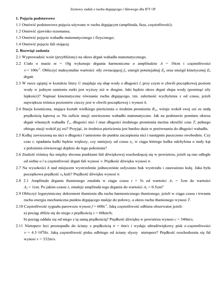 Zestawy zadań z ruchu drgającego i falowego dla IFT+IF 1. Pojęcia podstawowe 1.1 Omówić podstawowe pojęcia używane w ruchu drgającym (amplituda, faza, częstotliwość); 1.2 Omówić zjawisko rezonansu; 1.3 Omówić pojęcie wahadła matematycznego i fizycznego; 1.4 Omówić pojęcie fali stojącej. 2. Rozwiąż zadania 2.1 Wyprowadzić wzór (przybliżony) na okres drgań wahadła matematycznego. 2.2 Ciało o masie m = 10g wykonuje drgania harmoniczne o amplitudzie A = 10cm i częstotliwości ν = 100s-1. Obliczyć maksymalne wartości: siły zwracającej fz, energii potencjalnej Ep oraz energii kinetycznej Ek drgań. 2.3 W rurce zgiętej w kształcie litery U znajduje się słup wody o długości l, przy czym w chwili początkowej poziom wody w jednym ramieniu rurki jest wyższy niż w drugim. Jaki będzie okres drgań słupa wody (pominąć siły lepkości)? Napisać kinematyczne równanie ruchu drgającego, tzn. zależność wychylenia x od czasu, jeżeli największa różnica poziomów cieczy jest w chwili początkowej i wynosi h. 2.4 Stacja kosmiczna, mająca kształt wielkiego pierścienia o średnim promieniu Rśr, wiruje wokół swej osi ze stałą prędkością kątową ω. Na suficie stacji zawieszono wahadło matematyczne. Jak na podstawie pomiaru okresu drgań własnych wahadła Tw, długości nici l oraz długości średniego promienia można określić czas Ts pełnego obiegu stacji wokół jej osi? Przyjąć, że średnica pierścienia jest bardzo duża w porównaniu do długości wahadła. 2.5 Kulkę zawieszoną na nici o długości l uniesiono do punktu zaczepienia nici i następnie puszczono swobodnie. Czy czas t1 opadania kulki będzie większy, czy mniejszy od czasu t2, w ciągu którego kulka odchylona o mały kąt z położenia równowagi dojdzie do tego położenia? 2.6 Znaleźć różnicę faz między dwoma punktami fali dźwiękowej rozchodzącej się w powietrzu, jeżeli są one odległe od siebie o l a częstotliwość drgań fali wynosi ν. Prędkość dźwięku wynosi v. 2.7 Na wysokości h nad miejscem wystrzelenie jednocześnie usłyszano huk wystrzału i zauważono kulę. Jaka była początkowa prędkość v0 kuli? Prędkość dźwięku wynosi v. 2.8 2.1 Amplituda drgania tłumionego zmalała w ciągu czasu t = 5s od wartości A1 = 3cm do wartości A2 = 1cm. Po jakim czasie t1 zmaleje amplituda tego drgania do wartości A3 = 0.5cm? 2.9 Obliczyć logarytmiczny dekrement tłumienia dla ruchu harmonicznego tłumionego, jeżeli w ciągu czasu t trwania ruchu energia mechaniczna punktu drgającego maleje do połowy, a okres ruchu tłumionego wynosi T. 2.10 Częstotliwość sygnału parowozu wynosi f = 600s-1. Jaką częstotliwość odbiera obserwator jeżeli: a) pociąg zbliża się do niego z prędkością v = 60km/h; b) pociąg oddala się od niego z tą samą prędkością? Prędkość dźwięku w powietrzu wynosi c = 340m/s. 2.11 Nietoperz leci prostopadle do ściany z prędkością v = 6m/s i wydaje ultradźwiękowy pisk o częstotliwości ν = 4.5·104Hz. Jaką częstotliwość pisku odbitego od ściany słyszy nietoperz? Prędkość rozchodzenia się fal wynosi v = 332m/s.
