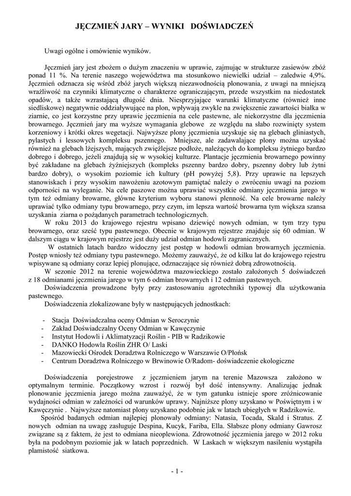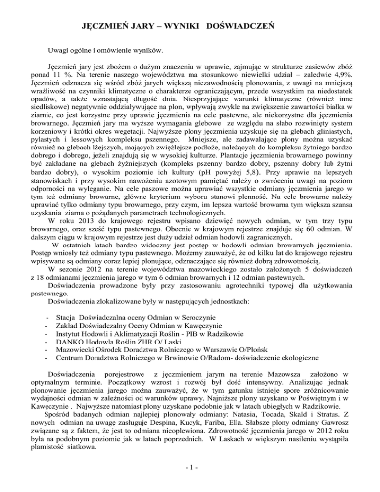 JĘCZMIEŃ JARY – WYNIKI DOŚWIADCZEŃ Uwagi ogólne i omówienie wyników. Jęczmień jary jest zbożem o dużym znaczeniu w uprawie, zajmując w strukturze zasiewów zbóż ponad 11 %. Na terenie naszego województwa ma stosunkowo niewielki udział – zaledwie 4,9%. Jęczmień odznacza się wśród zbóż jarych większą niezawodnością plonowania, z uwagi na mniejszą wrażliwość na czynniki klimatyczne o charakterze ograniczającym, przede wszystkim na niedostatek opadów, a także wzrastającą długość dnia. Niesprzyjające warunki klimatyczne (również inne siedliskowe) negatywnie oddziaływujące na plon, wpływają zwykle na zwiększenie zawartości białka w ziarnie, co jest korzystne przy uprawie jęczmienia na cele pastewne, ale niekorzystne dla jęczmienia browarnego. Jęczmień jary ma wyższe wymagania glebowe ze względu na słabo rozwinięty system korzeniowy i krótki okres wegetacji. Najwyższe plony jęczmienia uzyskuje się na glebach gliniastych, pylastych i lessowych kompleksu pszennego. Mniejsze, ale zadawalające plony można uzyskać również na glebach lżejszych, mających zwięźlejsze podłoże, należących do kompleksu żytniego bardzo dobrego i dobrego, jeżeli znajdują się w wysokiej kulturze. Plantacje jęczmienia browarnego powinny być zakładane na glebach żyźniejszych (kompleks pszenny bardzo dobry, pszenny dobry lub żytni bardzo dobry), o wysokim poziomie ich kultury (pH powyżej 5,8). Przy uprawie na lepszych stanowiskach i przy wysokim nawożeniu azotowym pamiętać należy o zwróceniu uwagi na poziom odporności na wyleganie. Na cele paszowe można uprawiać wszystkie odmiany jęczmienia jarego w tym też odmiany browarne, główne kryterium wyboru stanowi plenność. Na cele browarne należy uprawiać tylko odmiany typu browarnego, przy czym, im lepsza wartość browarna tym większa szansa uzyskania ziarna o pożądanych parametrach technologicznych. W roku 2013 do krajowego rejestru wpisano dziewięć nowych odmian, w tym trzy typu browarnego, oraz sześć typu pastewnego. Obecnie w krajowym rejestrze znajduje się 60 odmian. W dalszym ciągu w krajowym rejestrze jest duży udział odmian hodowli zagranicznych. W ostatnich latach bardzo widoczny jest postęp w hodowli odmian browarnych jęczmienia. Postęp wniosły też odmiany typu pastewnego. Możemy zauważyć, że od kilku lat do krajowego rejestru wpisywane są odmiany coraz lepiej plonujące, odznaczające się również dobrą zdrowotnością. W sezonie 2012 na terenie województwa mazowieckiego zostało założonych 5 doświadczeń z 18 odmianami jęczmienia jarego w tym 6 odmian browarnych i 12 odmian pastewnych. Doświadczenia prowadzone były przy zastosowaniu agrotechniki typowej dla użytkowania pastewnego. Doświadczenia zlokalizowane były w następujących jednostkach: - Stacja Doświadczalna oceny Odmian w Seroczynie Zakład Doświadczalny Oceny Odmian w Kawęczynie Instytut Hodowli i Aklimatyzacji Roślin - PIB w Radzikowie DANKO Hodowla Roślin ZHR O/ Laski Mazowiecki Ośrodek Doradztwa Rolniczego w Warszawie O/Płońsk Centrum Doradztwa Rolniczego w Brwinowie O/Radom- doświadczenie ekologiczne Doświadczenia porejestrowe z jęczmieniem jarym na terenie Mazowsza założono w optymalnym terminie. Początkowy wzrost i rozwój był dość intensywny. Analizując jednak plonowanie jęczmienia jarego można zauważyć, że w tym gatunku istnieje spore zróżnicowanie wydajności odmian w zależności od warunków uprawy. Najniższe plony uzyskano w Poświętnym i w Kawęczynie . Najwyższe natomiast plony uzyskano podobnie jak w latach ubiegłych w Radzikowie. Spośród badanych odmian najlepiej plonowały odmiany: Natasia, Tocada, Skald i Stratus. Z nowych odmian na uwagę zasługuje Despina, Kucyk, Fariba, Ella. Słabsze plony odmiany Gawrosz związane są z faktem, że jest to odmiana nieoplewiona. Zdrowotność jęczmienia jarego w 2012 roku była na podobnym poziomie jak w latach poprzednich. W Laskach w większym nasileniu wystąpiła plamistość siatkowa. -1- Tabela 1 JĘCZMIEŃ JARY. Odmiany badane. Rok zbioru 2012 Lp. Odmiana 1 2 Rok wpisania do Krajowego Rejestru Odmian w Polsce 3 Adres jednostki zachowującej odmianę, a w przypadku odmiany zagranicznej- pełnomocnika w Polsce 4 Hodowla Roślin Strzelce sp. z o.o. Grupa IHAR 1. STRATUS * 1999 ul. Główna 20, PL-99-307 Strzelce Hodowla Roślin Smolice sp. z o.o. Grupa IHAR 2. BLASK* 2001 Smolice 146, PL-63-740 Kobylin KWS Lochow Polska sp. z o.o. 3. TOCADA 2006 Kondratowice, ul. Słowiańska 5, PL-57-150 Prusy Hodowla Roślin Strzelce sp. z o.o. Grupa IHAR 4. SKARB* 2008 ul. Główna 20, PL-99-307 Strzelce KWS Lochow Polska sp. z o.o. 5. CONCHITA 2009 Kondratowice, ul. Słowiańska 5, PL-57-150 Prusy Hodowla Roślin Strzelce sp. z o.o. Grupa IHAR 6. KORMORAN* 2009 ul. Główna 20, PL-99-307 Strzelce Hodowla Roślin Strzelce sp. z o.o. Grupa IHAR 7. SKALD* 2009 ul. Główna 20, PL-99-307 Strzelce Hodowla Roślin Strzelce sp. z o.o. Grupa IHAR 8. SUWEREN* 2010 ul. Główna 20, PL-99-307 Strzelce DANKO Hodowla Roślin sp.zo.o. Choryń 27, 9. BASIC 2011 PL-64-000 Kościan RAGT Semences Polska sp.zo.o. 10. GOODLUCK 2011 Ul. Sadowa 10 A PL-87-148 Łysomice DANKO Hodowla Roślin sp.zo.o. Choryń 27, 11. IRON 2011 PL-64-000 Kościan DANKO Hodowla Roślin sp.zo.o. Choryń 27, 12. NATASIA 2011 PL-64-000 Kościan Saaten-Union Polska sp. zo.o.ul. Straszewska 70 13 DESPINA 2012 PL-62-100 Wągrowiec DANKO Hodowla Roślin sp.zo.o. Choryń 27, 14 ELLA 2012 PL-64-000 Kościan Saaten-Union Polska sp. zo.o.ul. Straszewska 70 15 FARIBA* 2012 PL-62-100 Wągrowiec Hodowla Roślin Strzelce sp. z o.o. Grupa IHAR 16 GAWROSZ* 2012 ul. Główna 20, PL-99-307 Strzelce DANKO Hodowla Roślin sp.zo.o. Choryń 27, 17 KUCYK* 2012 PL-64-000 Kościan Hodowla Roślin Smolice sp. z o.o. Grupa IHAR 18 RASKUD* 2012 Smolice 146, PL-63-740 Kobylin * - odmiana chroniona wyłącznym prawem hodowcy -2- Tabela 2 JĘCZMIEŃ JARY .Warunki polowe