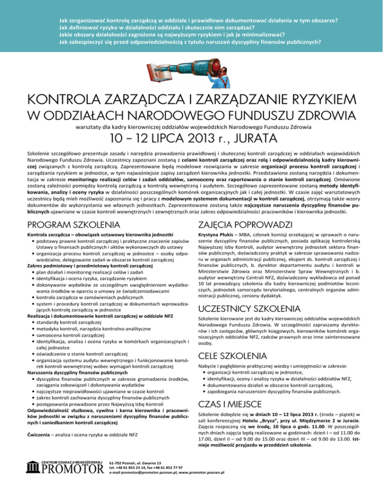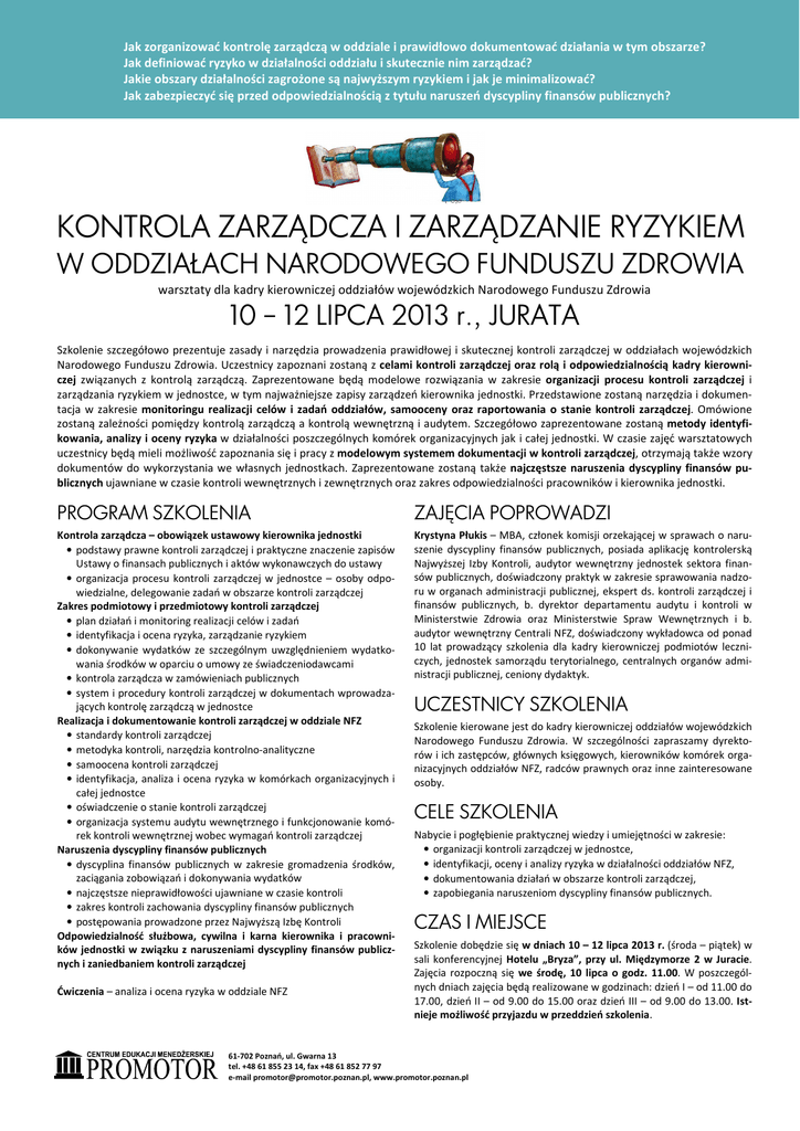 Jak zorganizować kontrolę zarządczą w oddziale i prawidłowo dokumentować działania w tym obszarze? Jak definiować ryzyko w działalności oddziału i skutecznie nim zarządzać? Jakie obszary działalności zagrożone są najwyższym ryzykiem i jak je minimalizować? Jak zabezpieczyć się przed odpowiedzialnością z tytułu naruszeń dyscypliny finansów publicznych? KONTROLA ZARZĄDCZA I ZARZĄDZANIE RYZYKIEM W ODDZIAŁACH NARODOWEGO FUNDUSZU ZDROWIA warsztaty dla kadry kierowniczej oddziałów wojewódzkich Narodowego Funduszu Zdrowia 10 – 12 LIPCA 2013 r., JURATA Szkolenie szczegółowo prezentuje zasady i narzędzia prowadzenia prawidłowej i skutecznej kontroli zarządczej w oddziałach wojewódzkich Narodowego Funduszu Zdrowia. Uczestnicy zapoznani zostaną z celami kontroli zarządczej oraz rolą i odpowiedzialnością kadry kierowniczej związanych z kontrolą zarządczą. Zaprezentowane będą modelowe rozwiązania w zakresie organizacji procesu kontroli zarządczej i zarządzania ryzykiem w jednostce, w tym najważniejsze zapisy zarządzeń kierownika jednostki. Przedstawione zostaną narzędzia i dokumentacja w zakresie monitoringu realizacji celów i zadań oddziałów, samooceny oraz raportowania o stanie kontroli zarządczej. Omówione zostaną zależności pomiędzy kontrolą zarządczą a kontrolą wewnętrzną i audytem. Szczegółowo zaprezentowane zostaną metody identyfikowania, analizy i oceny ryzyka w działalności poszczególnych komórek organizacyjnych jak i całej jednostki. W czasie zajęć warsztatowych uczestnicy będą mieli możliwość zapoznania się i pracy z modelowym systemem dokumentacji w kontroli zarządczej, otrzymają także wzory dokumentów do wykorzystania we własnych jednostkach. Zaprezentowane zostaną także najczęstsze naruszenia dyscypliny finansów publicznych ujawniane w czasie kontroli wewnętrznych i zewnętrznych oraz zakres odpowiedzialności pracowników i kierownika jednostki. PROGRAM SZKOLENIA ZAJĘCIA POPROWADZI Kontrola zarządcza – obowiązek ustawowy kierownika jednostki • podstawy prawne kontroli zarządczej i praktyczne znaczenie zapisów Ustawy o finansach publicznych i aktów wykonawczych do ustawy • organizacja procesu kontroli zarządczej w jednostce – osoby odpowiedzialne, delegowanie zadań w obszarze kontroli zarządczej Zakres podmiotowy i przedmiotowy kontroli zarządczej • plan działań i monitoring realizacji celów i zadań • identyfikacja i ocena ryzyka, zarządzanie ryzykiem • dokonywanie wydatków ze szczególnym uwzględnieniem wydatkowania środków w oparciu o umowy ze świadczeniodawcami • kontrola zarządcza w zamówieniach publicznych • system i procedury kontroli zarządczej w dokumentach wprowadzających kontrolę zarządczą w jednostce Realizacja i dokumentowanie kontroli zarządczej w oddziale NFZ • standardy kontroli zarządczej • metodyka kontroli, narzędzia kontrolno-analityczne • samoocena kontroli zarządczej • identyfikacja, analiza i ocena ryzyka w komórkach organizacyjnych i całej jednostce • oświadczenie o stanie kontroli zarządczej • organizacja systemu audytu wewnętrznego i funkcjonowanie komórek kontroli wewnętrznej wobec wymagań kontroli zarządczej Naruszenia dyscypliny finansów publicznych • dyscyplina finansów publicznych w zakresie gromadzenia środków, zaciągania zobowiązań i dokonywania wydatków • najczęstsze nieprawidłowości ujawniane w czasie kontroli • zakres kontroli zachowania dyscypliny finansów publicznych • postępowania prowadzone przez Najwyższą Izbę Kontroli Odpowiedzialność służbowa, cywilna i karna kierownika i pracowników jednostki w związku z naruszeniami dyscypliny finansów publicznych i zaniedbaniem kontroli zarządczej Krystyna Płukis – MBA, członek komisji orzekającej w sprawach o naruszenie dyscypliny finansów publicznych, posiada aplikację kontrolerską Najwyższej Izby Kontroli, audytor wewnętrzny jednostek sektora finansów publicznych, doświadczony praktyk w zakresie sprawowania nadzoru w organach administracji publicznej, ekspert ds. kontroli zarządczej i finansów publicznych, b. dyrektor departamentu audytu i kontroli w Ministerstwie Zdrowia oraz Ministerstwie Spraw Wewnętrznych i b. audytor wewnętrzny Centrali NFZ, doświadczony wykładowca od ponad 10 lat prowadzący szkolenia dla kadry kierowniczej podmiotów leczniczych, jednostek samorządu terytorialnego, centralnych organów administracji publicznej, ceniony dydaktyk. Ćwiczenia – analiza i ocena ryzyka w oddziale NFZ UCZESTNICY SZKOLENIA Szkolenie kierowane jest do kadry kierowniczej oddziałów wojewódzkich Narodowego Funduszu Zdrowia. W szczególności zapraszamy dyrektorów i ich zastępców, głównych księgowych, kierowników komórek organizacyjnych oddziałów NFZ, radców prawnych oraz inne zainteresowane osoby. CELE SZKOLENIA Nabycie i pogłębienie praktycznej wiedzy i umiejętności w zakresie: • organizacji kontroli zarządczej w jednostce, • identyfikacji, oceny i analizy ryzyka w działalności oddziałów NFZ, • dokumentowania działań w obszarze kontroli zarządczej, • zapobiegania naruszeniom dyscypliny finansów publicznych. CZAS I MIEJSCE Szkolenie dobędzie się w dniach 10 – 12 lipca 2013 r. (środa – piątek) w sali konferencyjnej Hotelu „Bryza”, przy ul. Międzymorze 2 w Juracie. Zajęcia rozpoczną się we środę, 10 lipca o godz. 11.00. W poszczególnych dniach zajęcia będą realizowane w godzinach: dzień I – od 11.00 do 17.00, dzień II – od 9.00 do 15.00 oraz dzień III – od 9.00 do 13.00. Istnieje możliwość przyjazdu w przeddzień szkolenia. 61-702 Poznań, ul. Gwarna 13 tel. +48 61 855 23 14, fax +48 61 852 77 97 e-mail [email protected], www.promotor.poznan.pl KONTROLA ZARZĄDCZA I ZARZĄDZANIE RYZYKIEM W ODDZIAŁACH NARODOWEGO FUNDUSZU ZDROWIA WARUNKI UCZESTNICTWA Cena uczestnictwa jednej osoby w szkoleniu wynosi 1 190,- PLN*. Cena obejmu