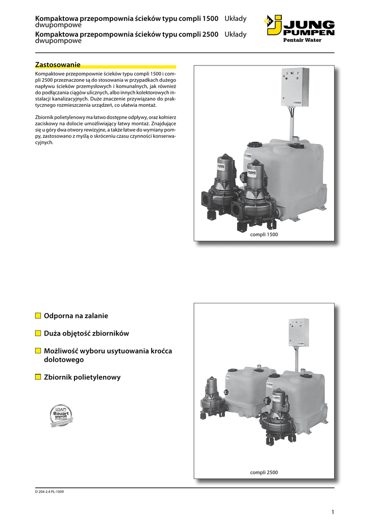 Kompaktowa przepompownia ścieków typu compli 1500 Układy dwupompowe Kompaktowa przepompownia ścieków typu compli 2500 Układy dwupompowe Zastosowanie Kompaktowe przepompownie ścieków typu compli 1500 i compli 2500 przeznaczone są do stosowania w przypadkach dużego napływu ścieków przemysłowych i komunalnych, jak również do podłączania ciągów ulicznych, albo innych kolektorowych instalacji kanalizacyjnych. Duże znaczenie przywiązano do praktycznego rozmieszczenia urządzeń, co ułatwia montaż. Zbiornik polietylenowy ma łatwo dostępne odpływy, oraz kołnierz zaciskowy na dolocie umożliwiający łatwy montaż. Znajdujące się u góry dwa otwory rewizyjne, a także łatwe do wymiany pompy, zastosowano z myślą o skróceniu czasu czynności konserwacyjnych. compli 1500 Odporna na zalanie Duża objętość zbiorników Możliwość wyboru usytuowania kroćca dolotowego Zbiornik polietylenowy compli 2500 D 204-2.4 PL-1009 1 Kompaktowa przepompownia ścieków typu compli 1500 dwupompowe Kompaktowa przepomownia ścieków typu compli 2500 dwupompowe Układy Układy Kompaktowa przepompownia ścieków Pojemność Wysokość Wolny Kołnierz Kołnierz przyzbiornika l dopływu przelot zacisko- łączeniowy PN 10 wy na mm mm wlocie Instalacje 2-pompowe z 1 zbiornikiem 1525/4 C1 9 m 100 m3/h 500 700 100 DN 150 DN 100 3 700 100 DN 150 DN 100 1535/4 C1 12 m 100 m /h 500 700 100 DN 150 DN 100 1555/4 C5 18 m 100 m3/h 500 700 100 DN 150 DN 100 1575/4 C5 20 m 100 m3/h 500 700 70 DN 150 DN 100 1575/4 B6 22 m 100 m3/h 500 Instalacje 2-pompowe z 2 zbiornikami 700 100 DN 150 DN 100 2525/4 C1 9 m 100 m3/h 1000 700 100 DN 150 DN 100 2535/4 C1 12 m 100 m3/h 1000 700 100 DN 150 DN 100 2555/4 C5 18 m 100 m3/h 1000 700 100 DN 150 DN 100 2575/4 C5 20 m 100 m3/h 1000 700 70 DN 150 DN 100 2575/4 B6 22 m 100 m3/h 1000 Typ compli H max Q max Wenty- Mado rury sa ok. przyłącze- lacja kg niowej Nr art. DN 100 DN 100 DN 100 DN 100 DN 100 DN 70 DN 70 DN 70 DN 70 DN 70 253,5 261,5 363,5 373,5 357,5 JP 09181 JP 09182 JP 09183 JP 09184 JP 09185 DN 100 DN 100 DN 100 DN 100 DN 100 DN 70 DN 70 DN 70 DN 70 DN 70 300,5 308,5 410,5 420,5 404,5 JP 09186 JP 09187 JP 09188 JP 09189 JP 09190 Przykład zabudowy Odpowietrzenie przez dach Poziom cofki poziom drogi Otwór do czyszczenia Pompa do odwodnienia Poziom podpiętrzenia Górna powierzchnia ulicy uważana jest za poziom podpiętrzenia (o ile nie stwierdzono na inaczej na miejscu montażu). Obiekty przeznaczone do skanalizowania i leżące poniżej poziomu podpiętrzenia, należy podłączyć pętlą spiętrzającą. Piony znajdujące się nad poziomem podpiętrzenia, wprowadzać należy bezpośrednio do rurociągu. 2 20894-03 Przepompownie fekaliów należy stosować w systemie odwadniania budynków, zgodnie z normą DIN EN 122050 o pompowaniu fekaliów i ścieków domowych i zgodnie z opisem w normie DIN 1986 T3. Należy je zabudowywać zgodnie z normą DIN EN 12056-4 ze zbiornikiem kolektorowym wewnątrz budynku, zachowując 60 cm odstęp od ścian w celach obsługi i konserwacji. Rurociąg tłoczny należy wyprowadzić na poziom lokalnego pod- 2 piętrzenia i założyć klapę zwrotną spełniającą wymagania normy DIN EN 12050-4 Przewód wentylacyjny należy wyprowadzić na dach, zgodnie z normą DIN EN 12056. Według normy DIN EN 12056-4 ust. 5.1 5.1 w instalacjach do których doprowadzenie ścieków nie może być przerwane, należy zamontować automatycznie załączaną pompę rezerwową albo układ z dwiema pompami. Kompaktowa przepompownia ścieków typu compli 1500 dwupompowe Kompaktowa przepompownia ścieków typu compli 2500 dwupompowe Układy Układy Osprzęt Nr art. 1 Urządzenie do kontroli szczelności DKG Dla instalacji 2-pompowych należy przewidzieć 2 urządzenia JP 00252 2 Akumulator do sterownika do instalacji alarmowej niezależnej od sieci JP 07562 3 Zasuwa dopływowa PCV (z 2 króćcami rurowymi) do dopływu 6“ (DN 150), PN 2,5 H 660 Zasuwa klinowa* po stronie tłocznej 4“ (DN 100), PN 10, DIN EN 1171 Klapa zwrotna R 101 * PN 4, kołnierz PN 10, DIN 3202, DIN EN 12050-4 bez przeciwciężaru Klapa zwrotna R 100 G * PN 4, kołnierz PN 10, DIN 3202, DIN EN 12050-4 z regulowanym przeciwciężarem H B E D 345 190 – DN 100 po stronie tłocznej 4 cale 4 5 B 450 E 110 F D 105 160 JP 28591 JP 00329 JP 00325 H 300 D/DN 100 JP 00324 6 Ręczna pompa membranowa do awaryjnego pompowania (do Hgeod 15 m) H E ok. 640430 D 1½” JP 00255 7 Zasuwa odcinająca, 1½“ (DN 40), PN 16 H B D 125 max. 60 1½” JP 11837 8 Łącznik elastyczny 1½“ (DN 40), PN 4 H 120 JP 20368 9 Opaska zaciskowa 1½” 10 Przyłącze kołnierzowe* (podobne do kształtki Q-90°), C 100 H 175 B 120 11 Rozgałęźnik* DN 100/100/100, PN 10 (tylko dla 1500) H 355 B 480 C/DN 100 D/DN 100 JP 00203 Kształtka jednokołnierzowa F-KS* po stronie tłocznej, DN 100, z rury z tworzywa sztucznego H 153 D 110 C/DN 100 Kołnierz PN 10 JP 08673 100 114 100 PN 10 JP 00688 12 13 Przyłącze do przyspawania* (Kształtka F), po stronie tłocznej, C 100, z rury stalowej Łącznik elastyczny 4-calowy (DN 100), PN 4 po stronie tłocznej, DN 100, rura z tworzywa sztucznego po stronie tłocznej, DN 100, z rury stalowej 14 Opaska zaciskowa 4” D 50 JP 03571 C/DN D/DN 100 PN 10 100 PN 6 JP 00579 H 200 D 110 JP 21043 H 200 D 114 JP 16348 JP 03575 * ze śrubami i uszczelką 3 Kompaktowa przepompownia ścieków typu compli 1500 dwupompowe Kompaktowa przepompownia ścieków typu compli 2500 dwupompowe Wymiary główne Compli 1500 (mm) Układy Układy Wymiary główne Compli 2500 (mm) Przyłącze odpowietrzenia DN70 (Ø75) Przyłącze odpowietrzenia DN70 (Ø75) Dopływ Dopływ DN150 (Ø160) A = Z zaworem odcinającym i przyłączem Przyłącze do odpowietrzeń DN70 Połączenie zbiorników Kołnierz przyłączeniowy 1½“ Przyłącze 1½“ wylot lewy lub prawy Dopływ DN150 (Ø160) Kołnierz przyłączeniowy 1½“ Przyłącze do odpowietrzeń DN70 Połączenie zbiorników Ø150 z pompą Pompa 