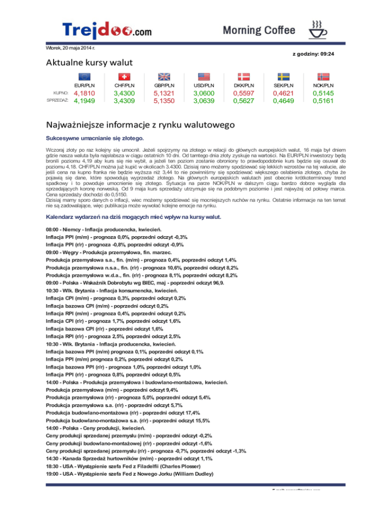 Wtorek, 20 maja 2014 r. z godziny: 09:24 Aktualne kursy walut KUPNO: SPRZEDAŻ: EUR/PLN CHF/PLN GBP/PLN USD/PLN DKK/PLN SEK/PLN NOK/PLN 4,1810 4,1949 3,4300 3,4309 5,1321 5,1350 3,0600 3,0639 0,5597 0,5627 0,4621 0,4649 0,5145 0,5161 Najważniejsze informacje z rynku walutowego Sukcesywne umacnianie się złotego. Wczoraj złoty po raz kolejny się umocnił. Jeżeli spojrzymy na złotego w relacji do głównych europejskich walut, 16 maja był dniem gdzie nasza waluta była najsłabsza w ciągu ostatnich 10 dni. Od tamtego dnia złoty zyskuje na wartości. Na EUR/PLN inwestorzy będą bronili poziomu 4,19 aby kurs się nie wybił, a jeżeli ten poziom zostanie obroniony to prawdopodobnie kurs będzie się osuwał do poziomu 4,18. CHF/PLN można już kupić w okolicach 3.4300. Dzisiaj rano możemy spodziewać się lekkich wzrostów na tej walucie, ale jeśli cena na kupno franka nie będzie wyższa niż 3,44 to nie powinniśmy się spodziewać większego osłabienia złotego, chyba że pojawią się dane, które spowodują wyprzedaż złotego. Na głównych europejskich walutach jest obecnie krótkoterminowy trend spadkowy i to powoduje umocnienie się złotego. Sytuacja na parze NOK/PLN w dalszym ciągu bardzo dobrze wygląda dla sprzedających koronę norweską. Od 9 maja kurs sprzedaży utrzymuje się na podobnym poziomie i jest najwyżej od połowy marca. Cena sprzedaży dochodzi do 0,5150. Dzisiaj mamy sporo danych o inflacji, wiec możemy spodziewać się mocniejszych ruchów na rynku. Ostatnie informacje na ten temat nie są zadowalające, więc publikacja może wywołać kolejne emocje na rynku. Kalendarz wydarzeń na dziś mogących mieć wpływ na kursy walut. 08:00 - Niemcy - Inflacja producencka, kwiecień. Inflacja PPI (m/m) - prognoza 0,0%, poprzedni odczyt -0,3%. Inflacja PPI (r/r) - prognoza -0,8%, poprzedni odczyt -0,9%. 09:00 - Węgry - Produkcja przemysłowa, fin. marzec. Produkcja przemysłowa s.a., fin. (m/m) - prognoza 0,4%, poprzedni odczyt 1,4%. Produkcja przemysłowa n.s.a., fin. (r/r) - prognoza 10,6%, poprzedni odczyt 8,2%. Produkcja przemysłowa w.d.a., fin. (r/r) - prognoza 8,1%, poprzedni odczyt 8,2%. 09:00 - Polska - Wskaźnik Dobrobytu wg BIEC, maj - poprzedni odczyt 96,9. 10:30 - Wlk. Brytania - Inflacja konsumencka, kwiecień. Inflacja CPI (m/m) - prognoza 0,3%, poprzedni odczyt 0,2%. Inflacja bazowa CPI (m/m) - poprzedni odczyt 0,2%. Inflacja RPI (m/m) - prognoza 0,4%, poprzedni odczyt 0,2%. Inflacja CPI (r/r) - prognoza 1,7%, poprzedni odczyt 1,6%. Inflacja bazowa CPI (r/r) - poprzedni odczyt 1,6%. Inflacja RPI (r/r) - prognoza 2,5%, poprzedni odczyt 2,5%. 10:30 - Wlk. Brytania - Inflacja producencka, kwiecień. Inflacja bazowa PPI (m/m) prognoza 0,1%, poprzedni odczyt 0,1%. Inflacja PPI (m/m) prognoza 0,2%, poprzedni odczyt 0,2%. Inflacja bazowa PPI (r/r) - prognoza 1,0%, poprzedni odczyt 1,0%. Inflacja PPI (r/r) - prognoza 0,8%, poprzedni odczyt 0,5%. 14:00 - Polska - Produkcja przemysłowa i budowlano-montażowa, kwiecień. Produkcja przemysłowa (m/m) - poprzedni odczyt 9,4%. Produkcja przemysłowa (r/r) - prognoza 5,0%, poprzedni odczyt 5,4%. Produkcja przemysłowa s.a. (r/r) - poprzedni odczyt 5,7%. Produkcja budowlano-montażowa (r/r) - poprzedni odczyt 17,4%. Produkcja budowlano-montażowa s.a. (r/r) - poprzedni odczyt 15,5%. 14:00 - Polska - Ceny produkcji, kwiecień. Ceny produkcji sprzedanej przemysłu (m/m) - poprzedni odczyt -0,2%. Ceny produkcji budowlano-montażowej (r/r) - poprzedni odczyt -1,6%. Ceny produkcji sprzedanej przemysłu (r/r) - prognoza -0,7%, poprzedni odczyt -1,3%. 14:30 - Kanada Sprzedaż hurtowników (m/m) - poprzedni odczyt 1,1%. 18:30 - USA - Wystąpienie szefa Fed z Filadelfii (Charles Plosser) 19:00 - USA - Wystąpienie szefa Fed z Nowego Jorku (William Dudley) Niniejszy materiał przygotowany przez Igoria Trade S.A. ma charakter wyłącznie informacyjny i nie stanowi oferty ani rekomendacji zawarcia transakcji kupna lub sprzedaży jakiegokolwiek instrumentu finansowego, produktu lub towaru. Niniejszy materiał nie stanowi porady inwestycyjnej, ani też nie jest wskazaniem, iż jakakolwiek inwestycja lub strategia jest odpowiednia w indywidualnej sytuacji inwestora. Dane prezentowane w niniejszym materiale zostały uzyskane lub zaczerpnięte ze źródeł uznanych przez Igoria Trade S.A. za wiarygodne, jednakże Igoria Trade S.A. nie może zagwarantować ich dokładności i kompletności. Interpretacja wykresu jest subiektywną oceną analityka dotyczącą oceny technicznej wykresu. Wykres przygotowano za pomocą programu Microsoft Office. Źródłem danych są: Trejdoo.com, prasa finansowa lub internetowe serwisy finansowo-ekonomiczne. Niniejsze opracowanie i zawarte w nim komentarze są wyrazem wiedzy oraz poglądów autorów i nie powinny być inaczej interpretowane. Użytkownicy korzystający z niniejszego materiału nie mogą zrezygnować z przeprowadzenia niezależnej oceny i uwzględnienia innych okoliczności aniżeli te, które zostały wskazane w niniejszym materiale. Igoria Trade S.A. nie ponosi odpowiedzialności za szkody poniesione w wyniku decyzji podjętych na podstawie informacji i opinii zawartych w niniejszym opracowaniu. Powielanie bądź publikowanie niniejszego opracowania lub jego części bez pisemnej zgody Igoria Trade S.A. jest zabronione.